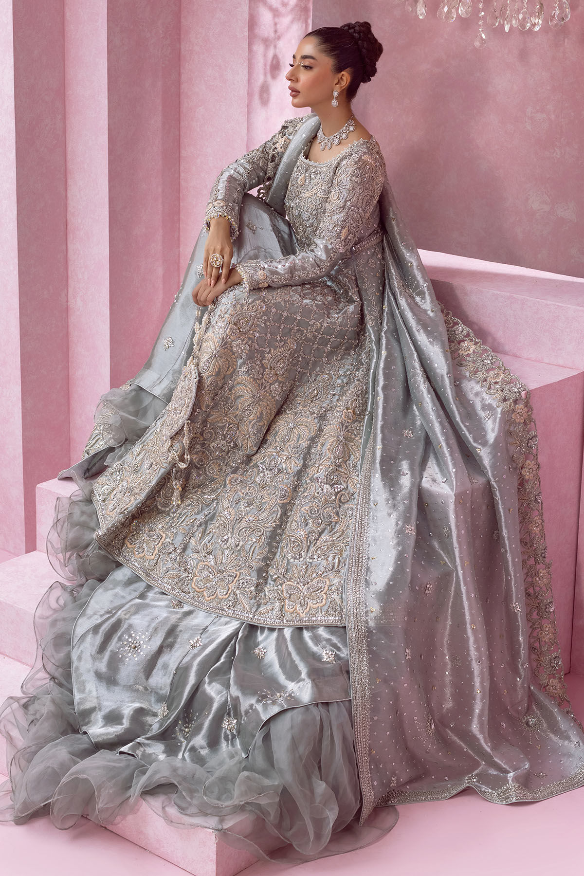 Front open long silhouette floor length shirt in subtle shade of ice blue on pure lamé canvas featuring silk thread and zardozi details on each panel. The resham details are adorned with light catching crystals and pearls. The outfit can be paired with cutwork and resham zardozi dupatta featuring crystals pearls and sequins. The outfit is paired with lamé lehnga with a long trail featuring sequins and ruffles details