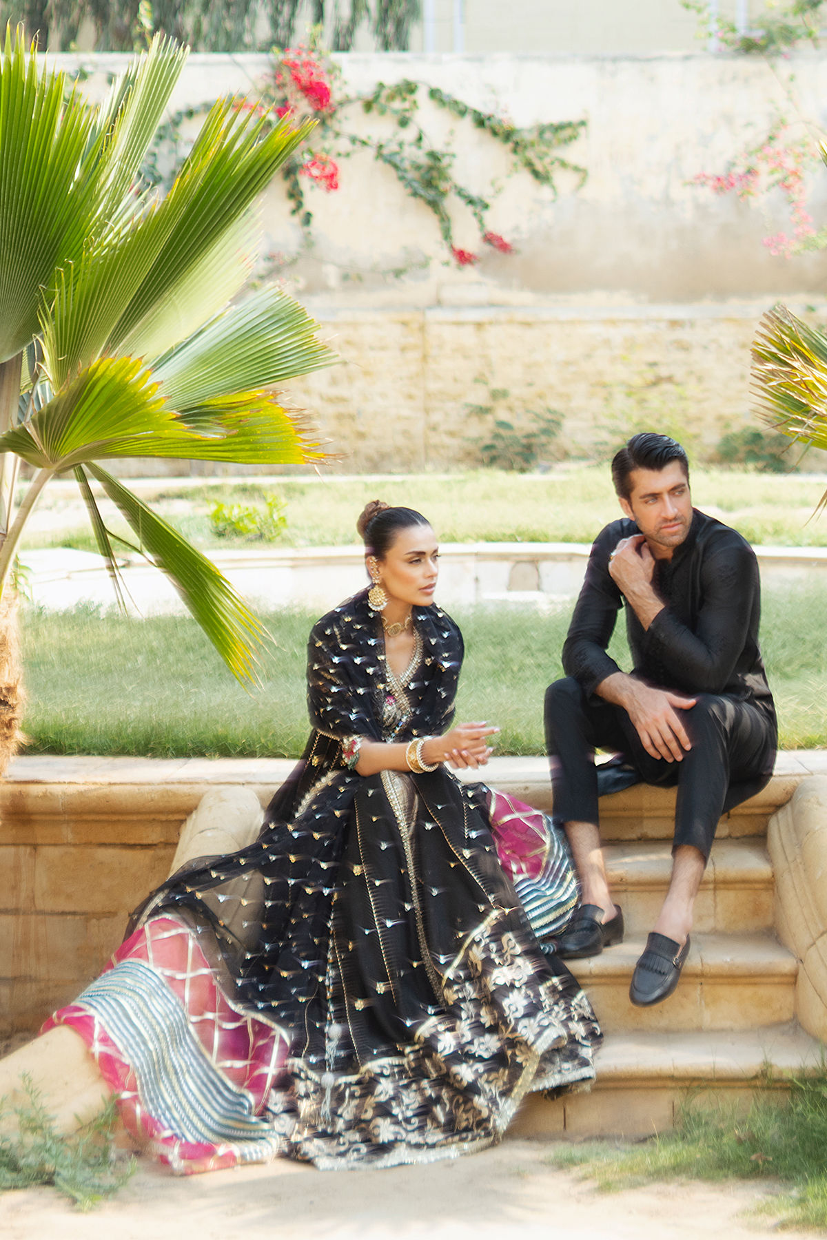 Floor length Kalidar Angharka in deep black shade on striped organza canvas featuring zardozi and resham details on bodice. The hemline is adorned with Lamé panel and sequins all over. The centre front is adorned with handcrafted tassels. The head turning back keyhole features handcrafted peacock tassel. The Kalidar is paired with dhaka pajama and can be paired with color blocked organza dupatta featuring sequins and old school gota finishing.