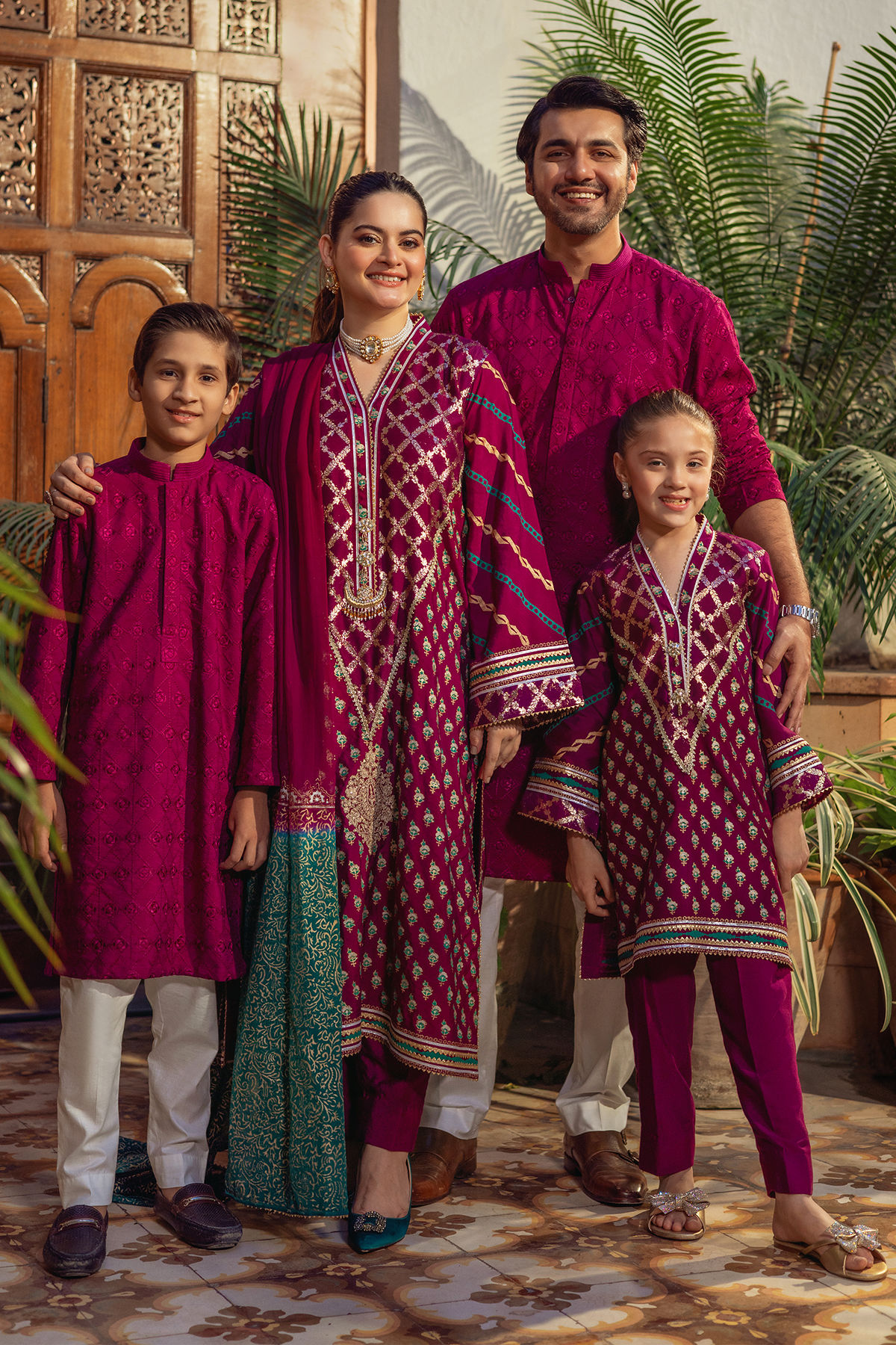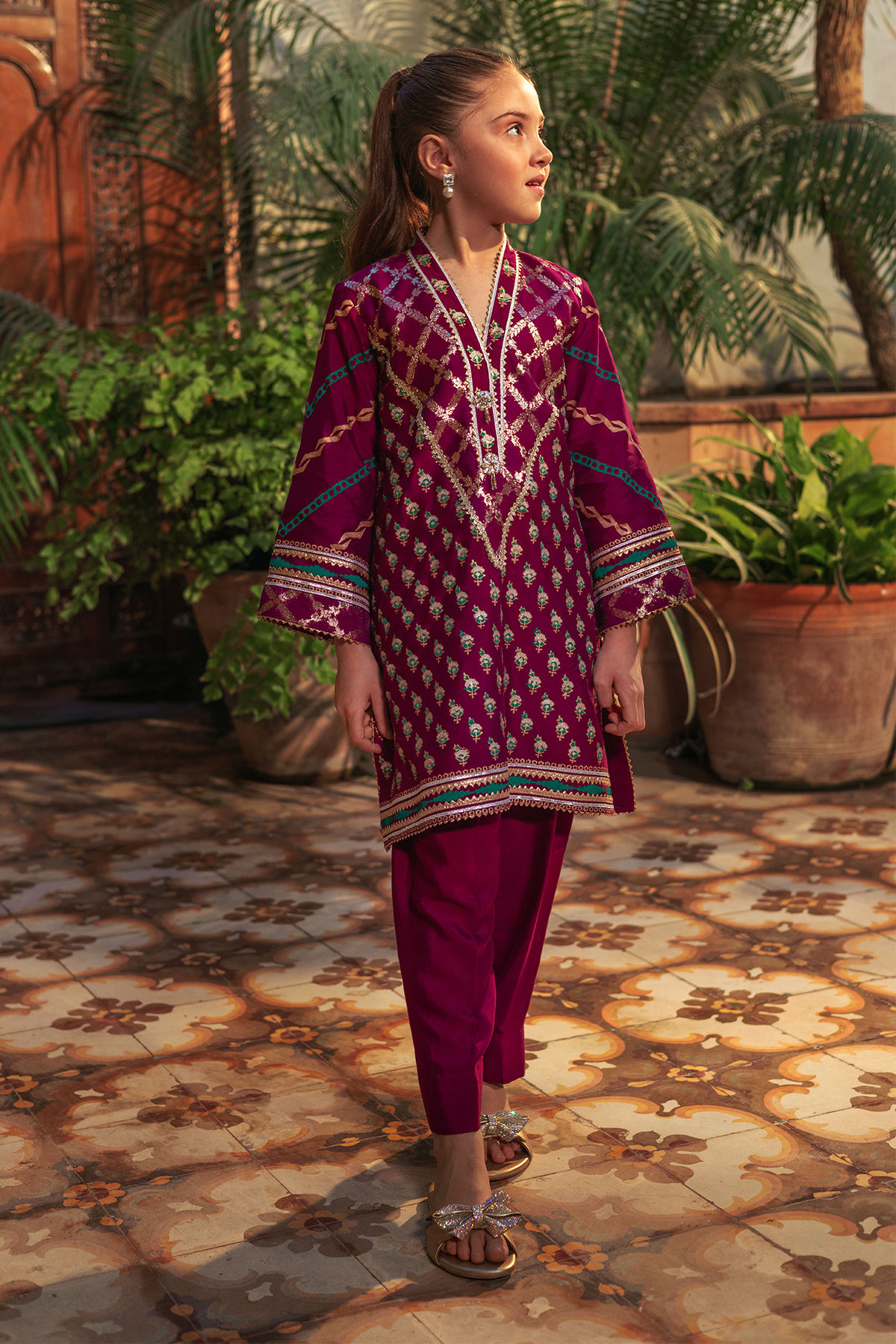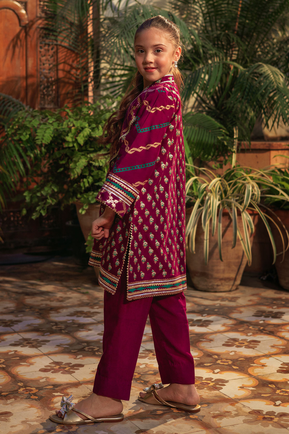 The elongated silhouette A-line shirt, presented in a beautiful shade of cranberry interlaced with hints of electric green, is elegantly enhanced by a lorex panel at the center front and neckline. The center front is further accentuated with meticulously hand block printed details. The neckline is enriched with exquisite gota work and handcrafted zardozi embellishments. This shirt is accompanied by complementary straight pants.