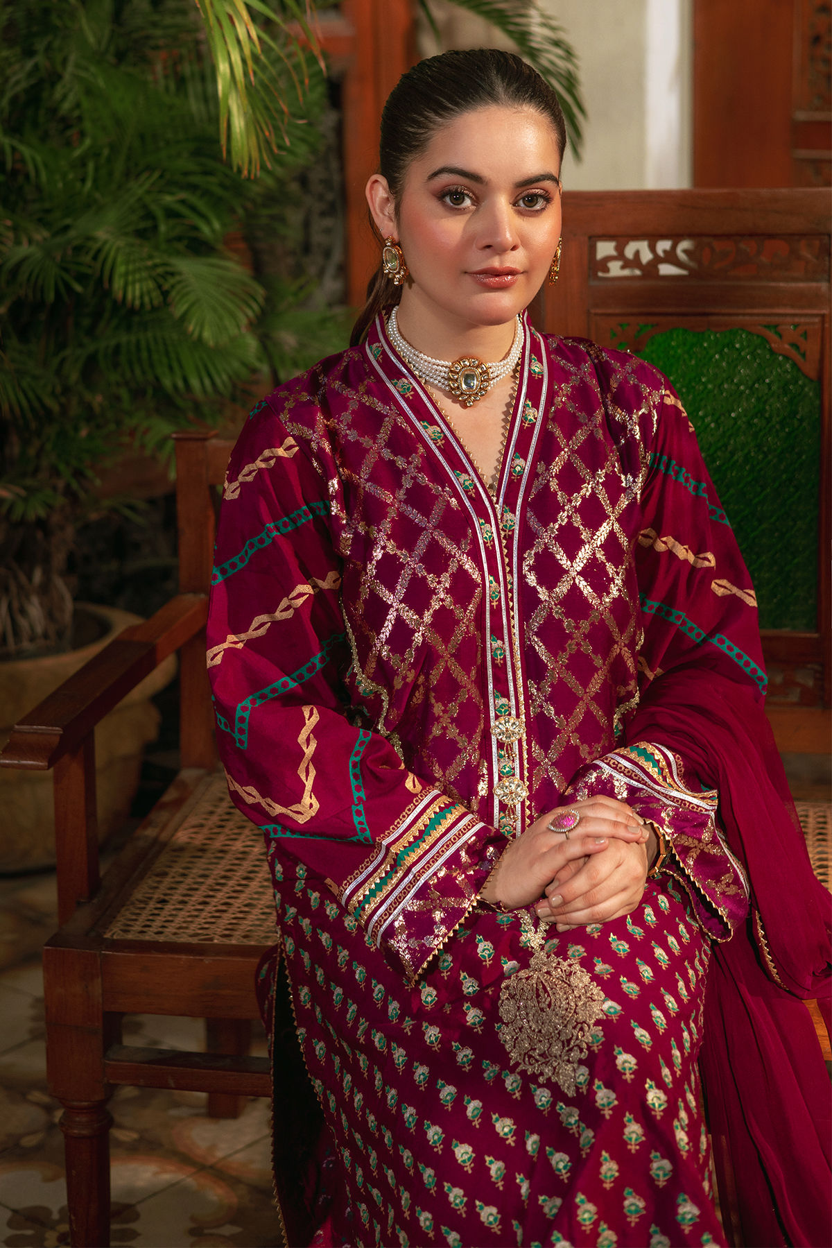 The elongated silhouette A-line shirt, presented in a beautiful shade of cranberry interlaced with hints of electric green, is elegantly enhanced by a lorex panel at the center front and neckline. The center front is further accentuated with meticulously hand block printed details. The neckline is enriched with exquisite gota work and handcrafted zardozi embellishments. This shirt is accompanied by complementary straight pants and an ombre chiffon dupatta, which features hand block printed details and is finished with shimmering gota.