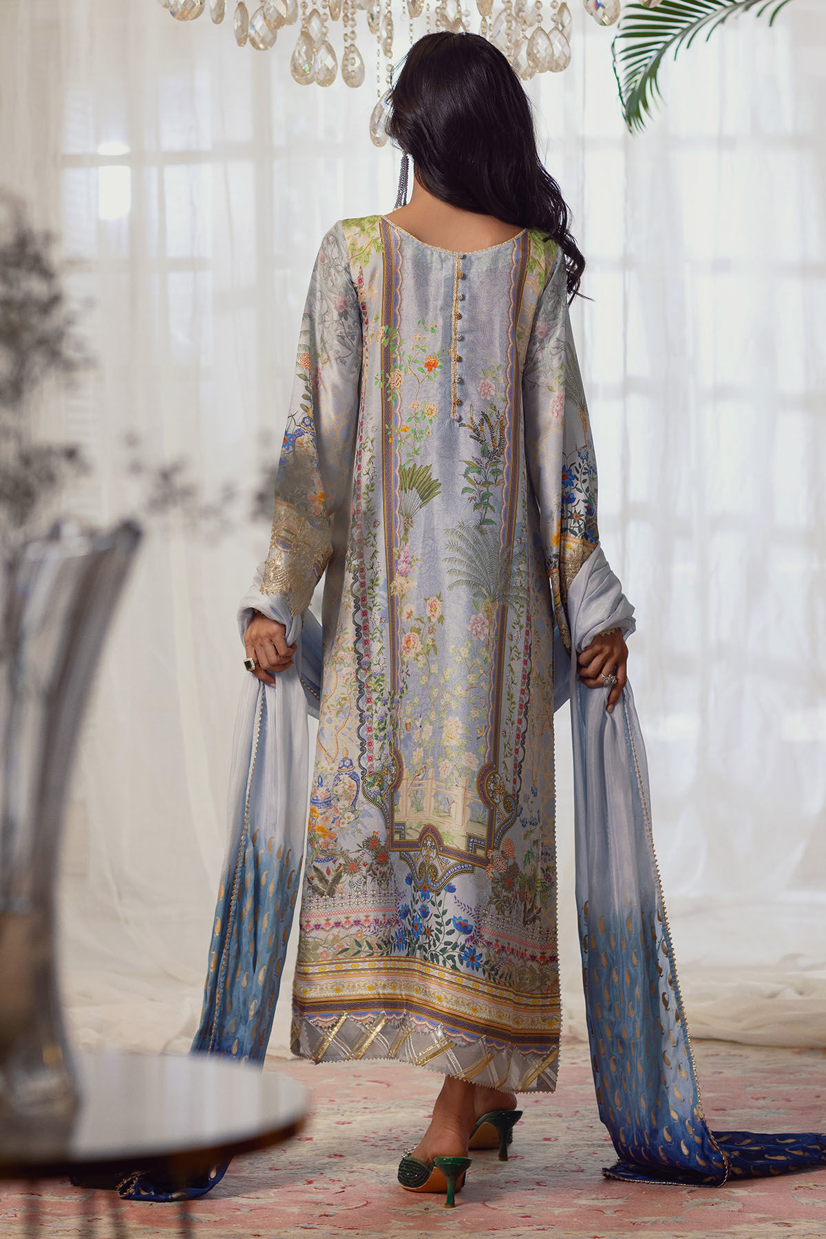 This long silhouette shirt, rendered in a dreamy shade of ice blue on a pure raw silk canvas, features intricate pearl and zardozi embellishments along the neckline. The hem is elegantly adorned with gota manipulation on a sheer organza panel. This exquisite ensemble is complemented by an ombre silk dupatta and matching pants, creating a complete and sophisticated look.