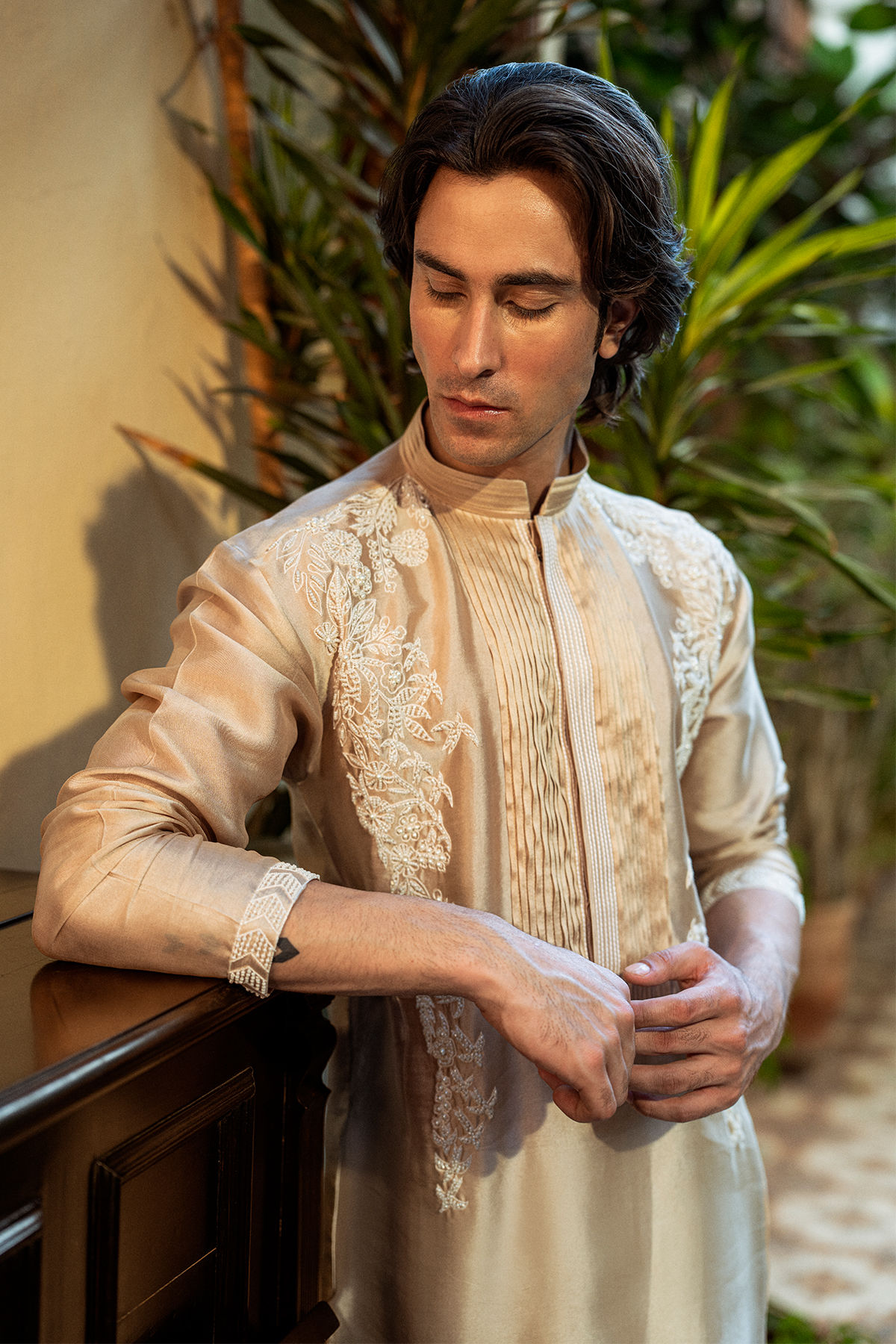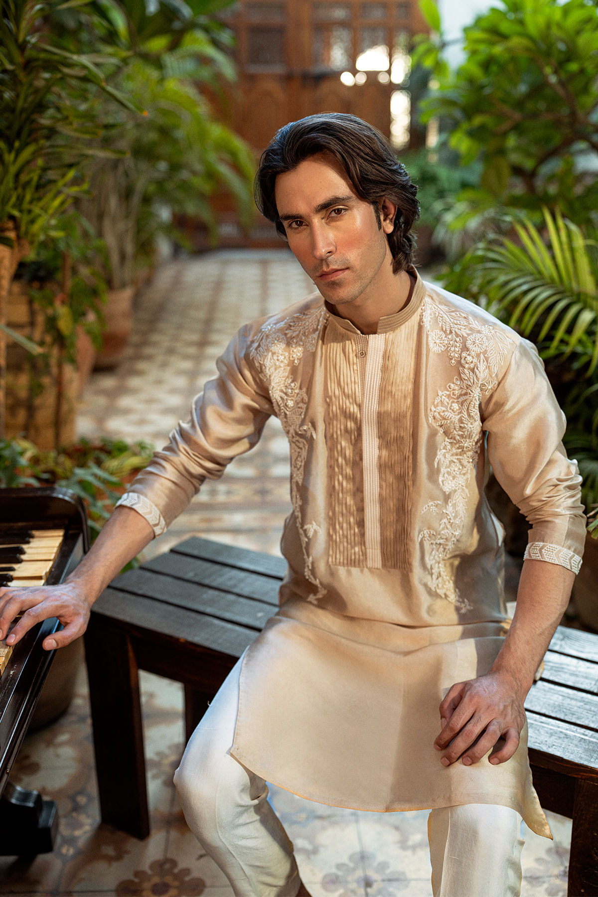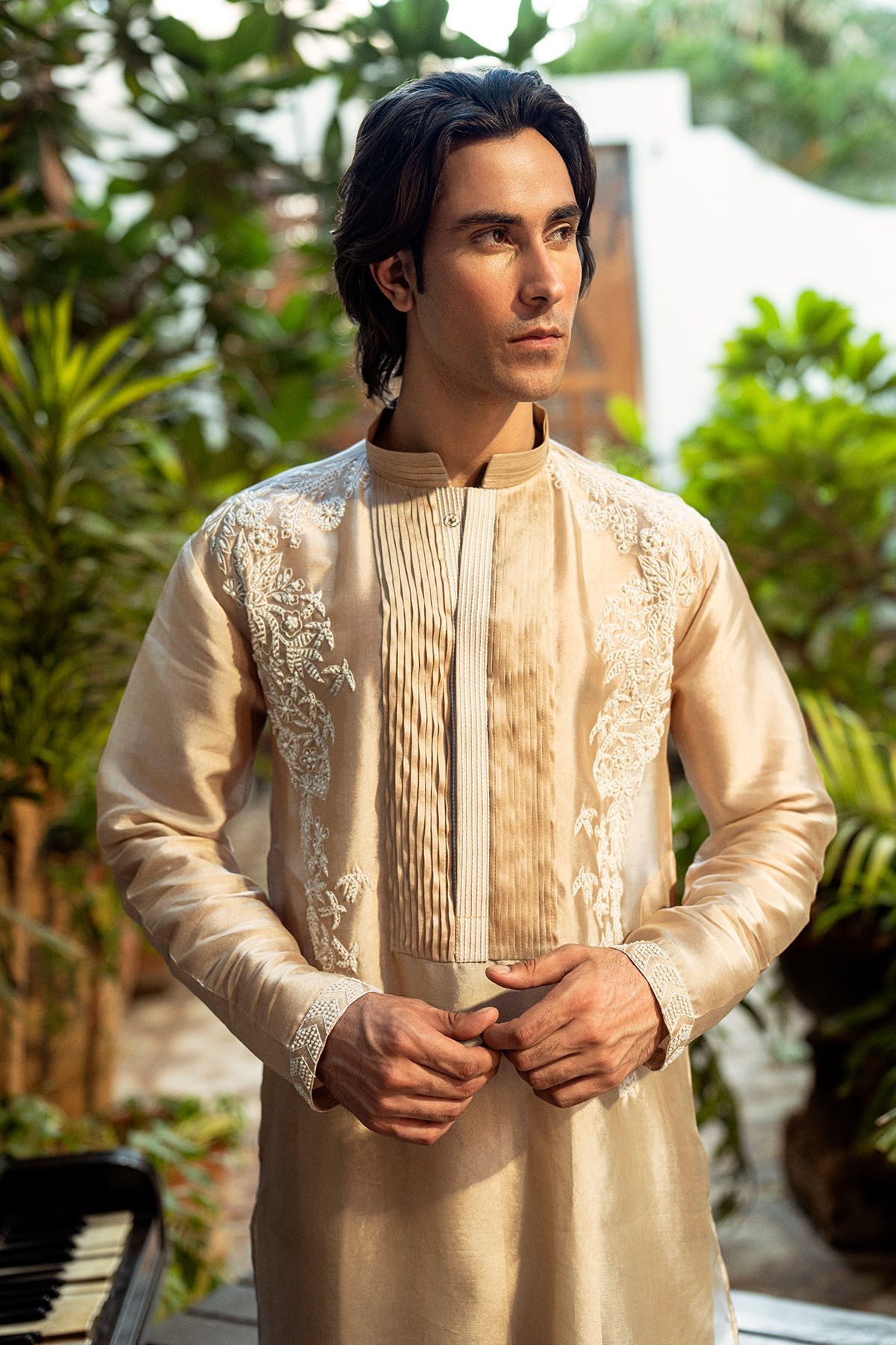 Make a statement with this stunning kurta, crafted from pure silk in an exquisite subtle sand shade. The exquisite hand-embroidered aari details on the neckline, elegantly embellished with pearls, will surely turn heads. Each neckline is meticulously designed with pleats and running stitch details, showcasing exceptional craftsmanship. Pair this kurta with straight white matching pants for a complete and captivating look that is sure to impress.