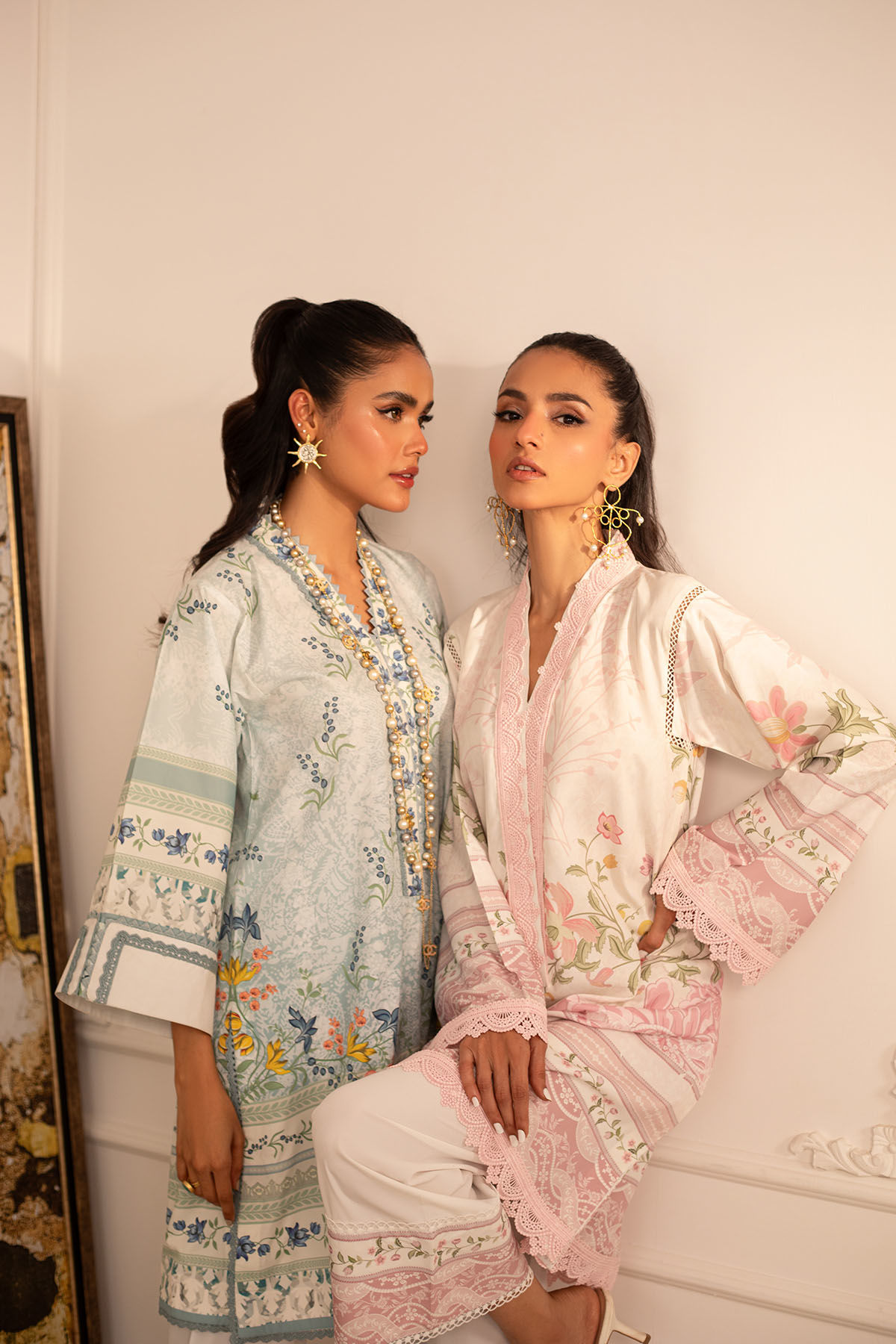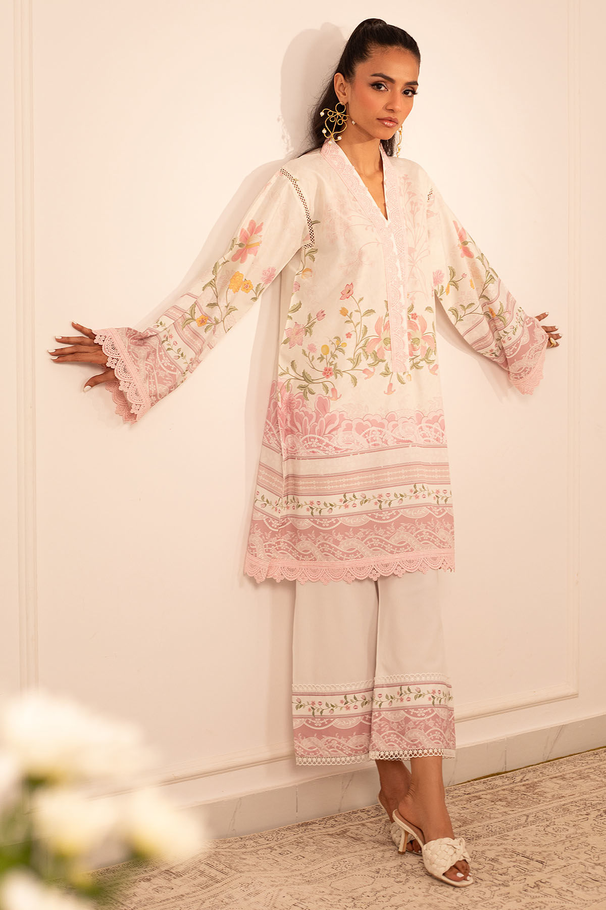 Quirky, trendy yet elegant co-ord set on crepe silk featuring balanced and carefully crafted prints, enhanced with lace details, is a must-have in your closet this summer.