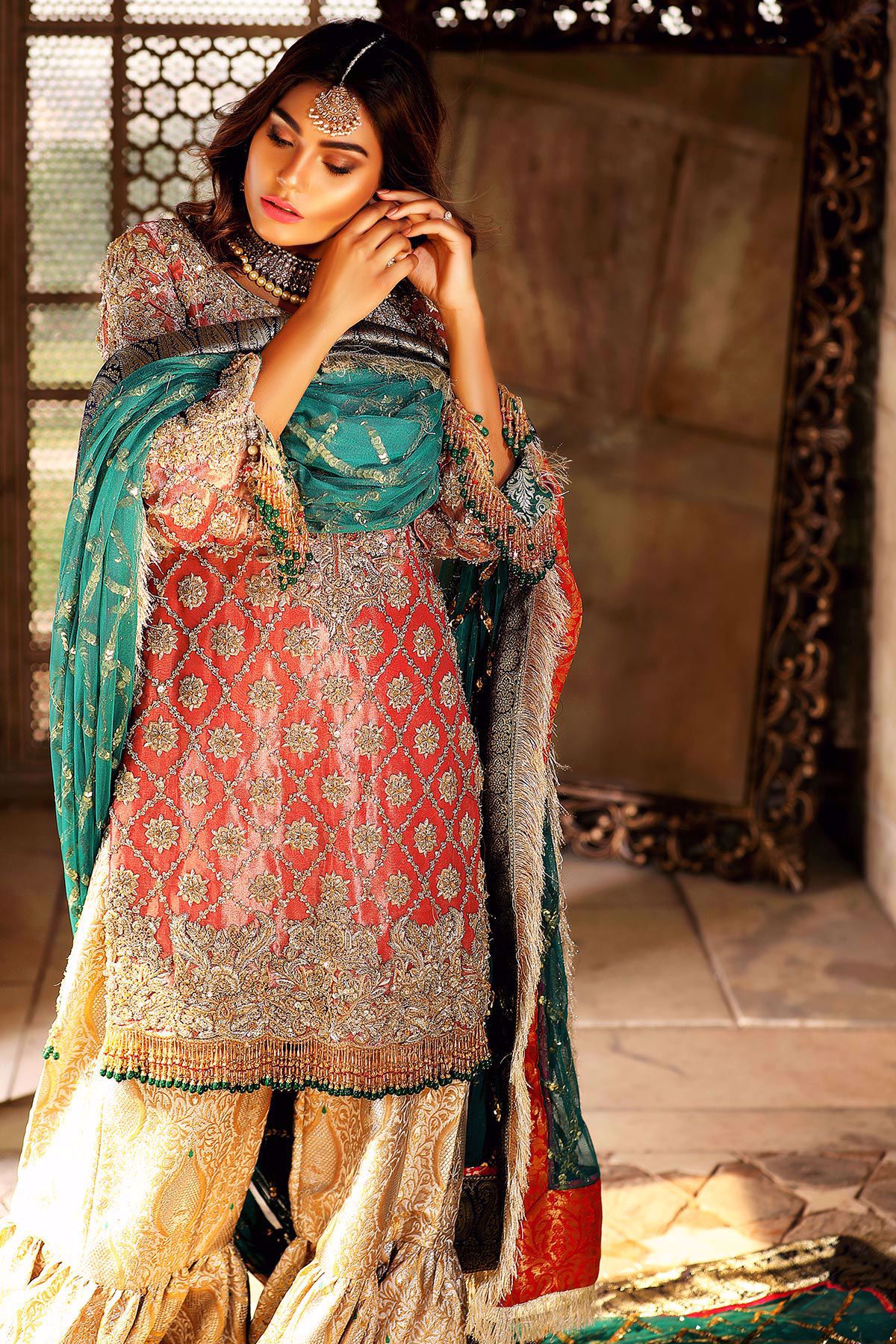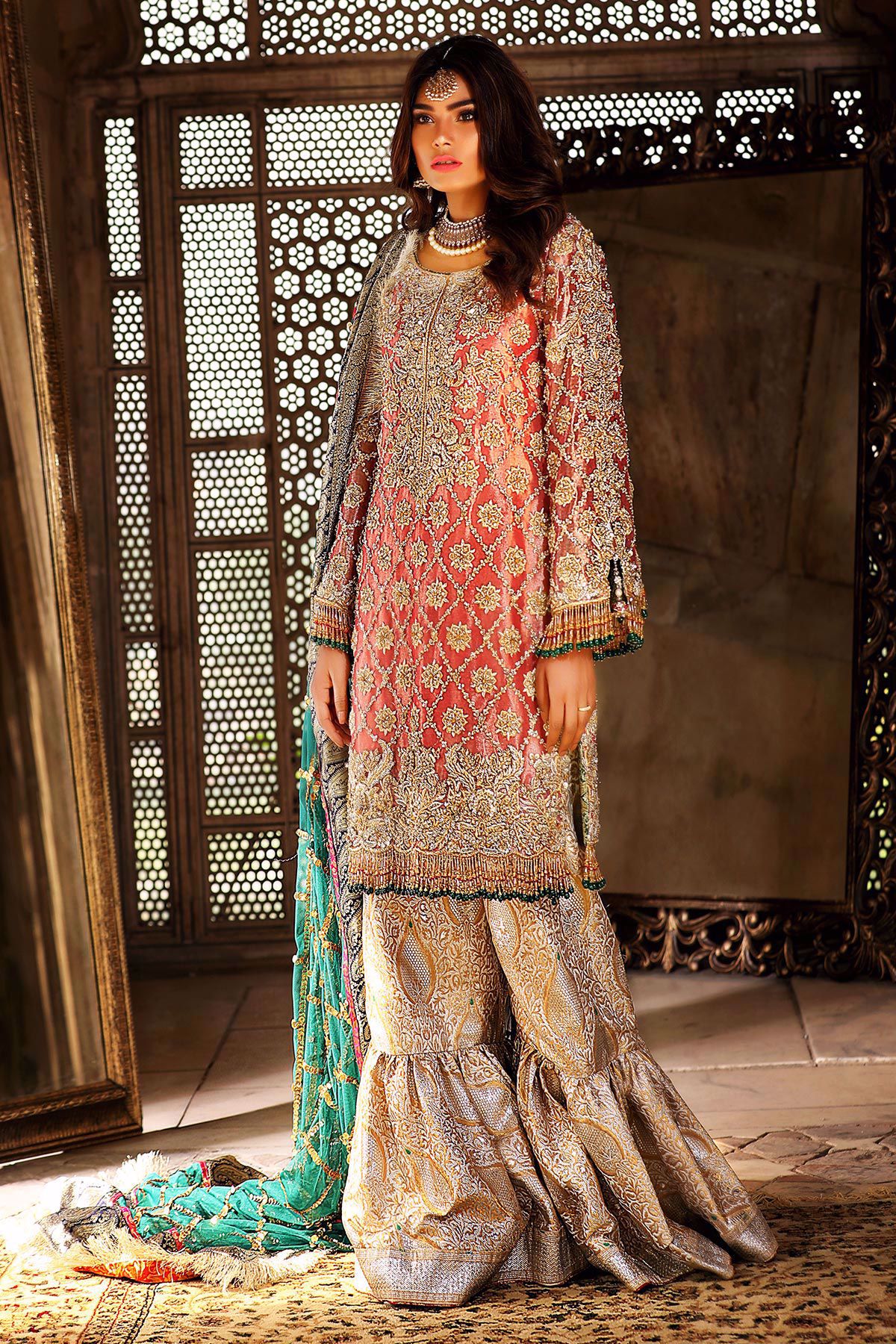 This super stunning deep pink Lamé shirt is heavily worked with zardoze embroidery on the neckline and hemline. The shirt has straight silhouette and the hemline is further enhanced with handmade tassels. The shirt comes with damask gharara and a contrasting heavy chan dupatta.