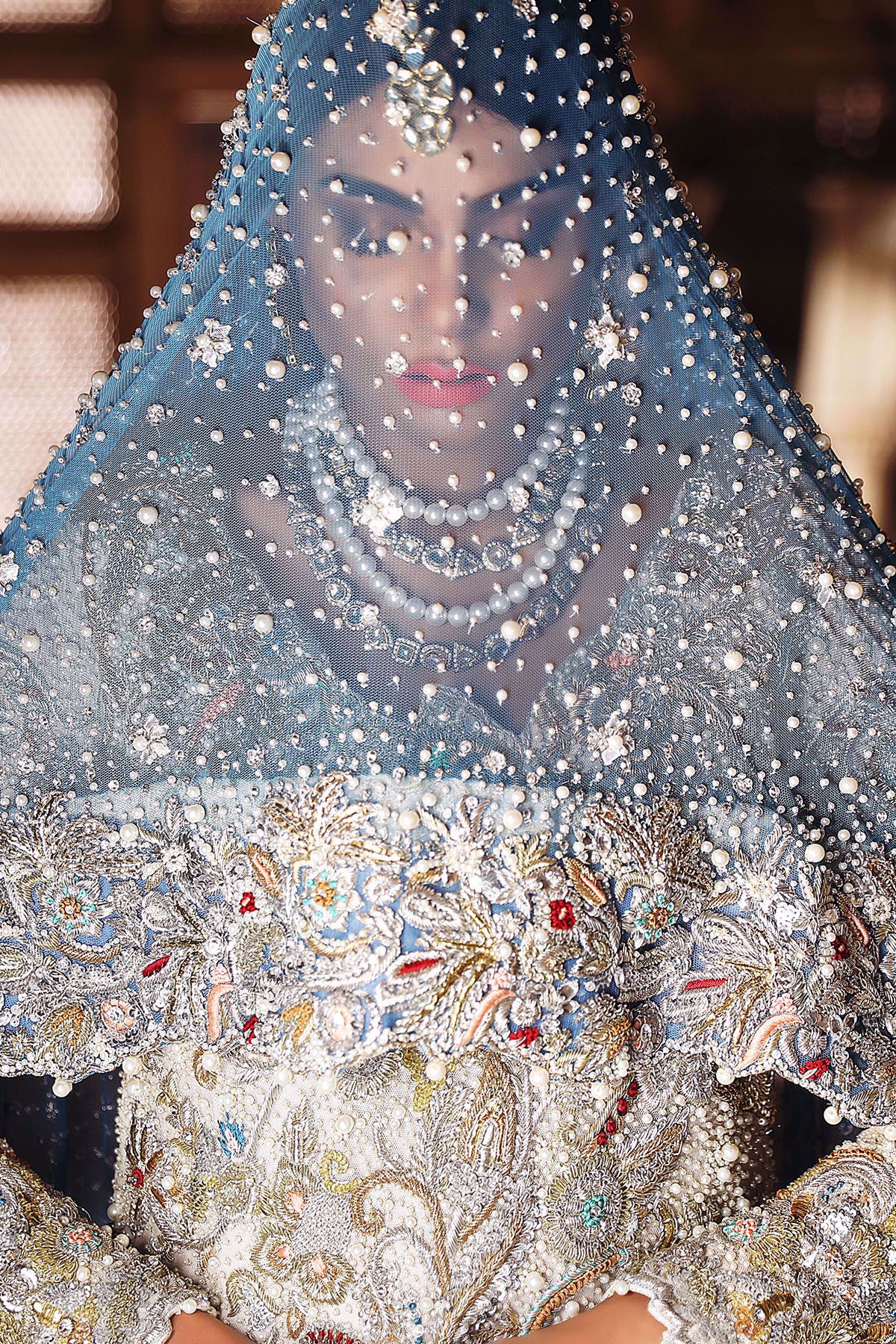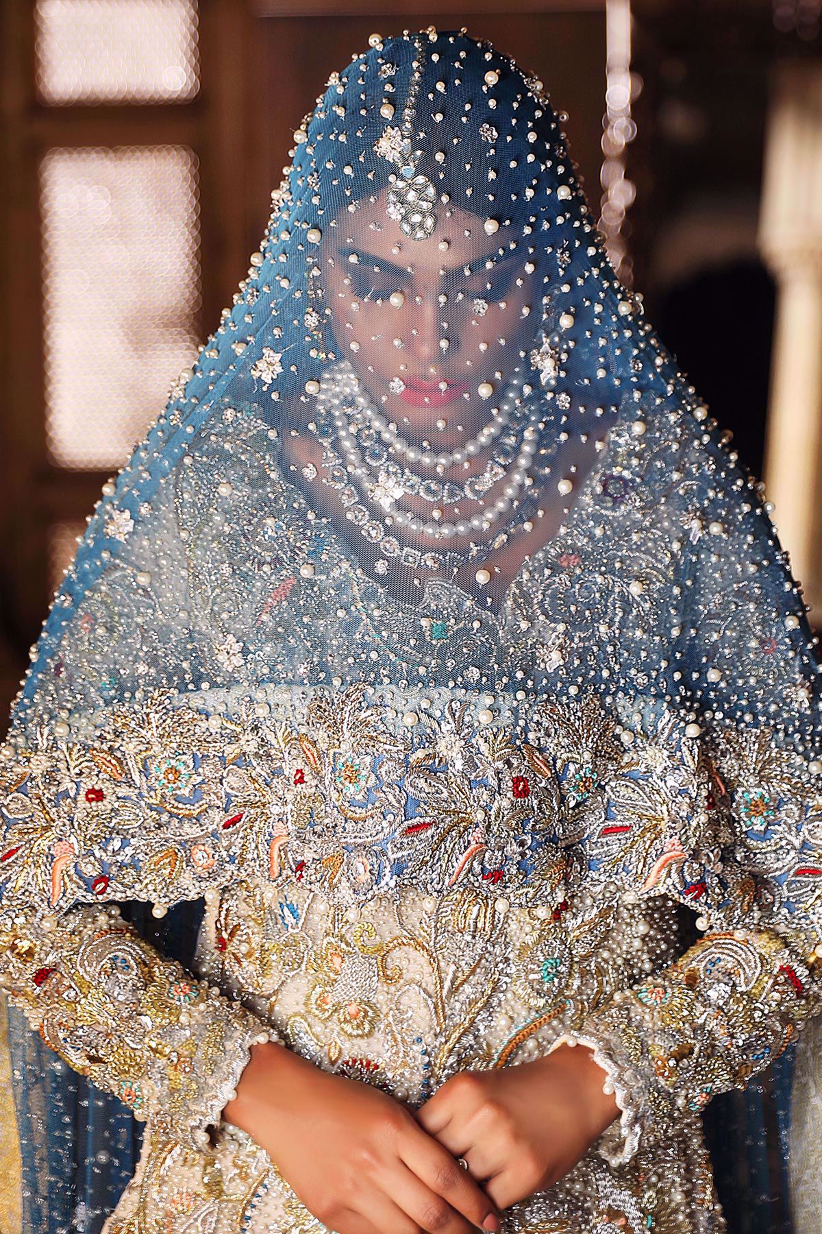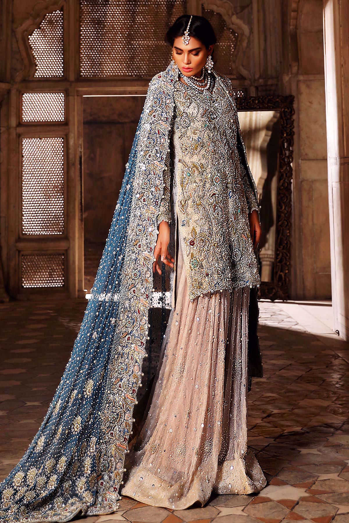 This super stunning ivory shirt is an amalgamation of old and new. The shirt has super stunning old school embroidery which is enhanced with light catching crystals and pearls. The shirt comes with ivory dhaka pajama with heavy spray of gota, pearls, sequins and stones. The super stunning deep blue heavy embroidered dupatta has dabka and kamdani border which is further decorated with resham knots and overall spray of pearls and sequins.