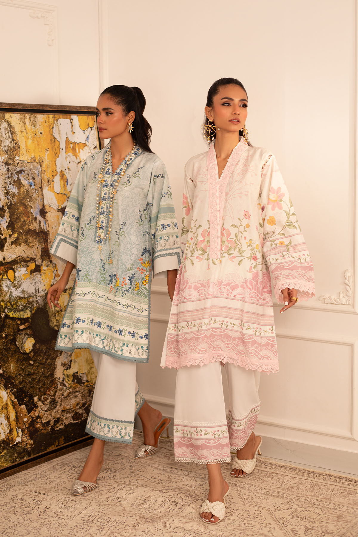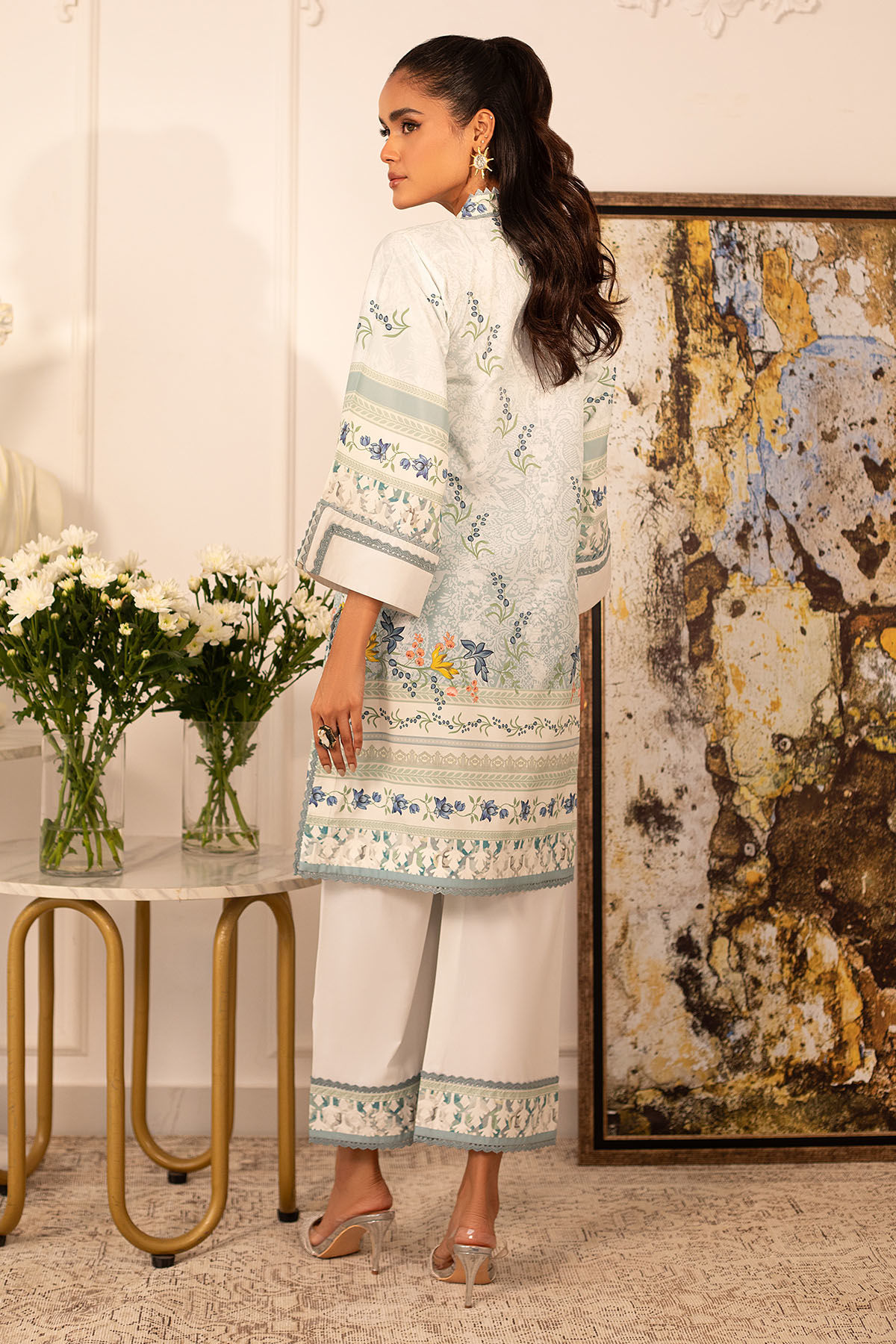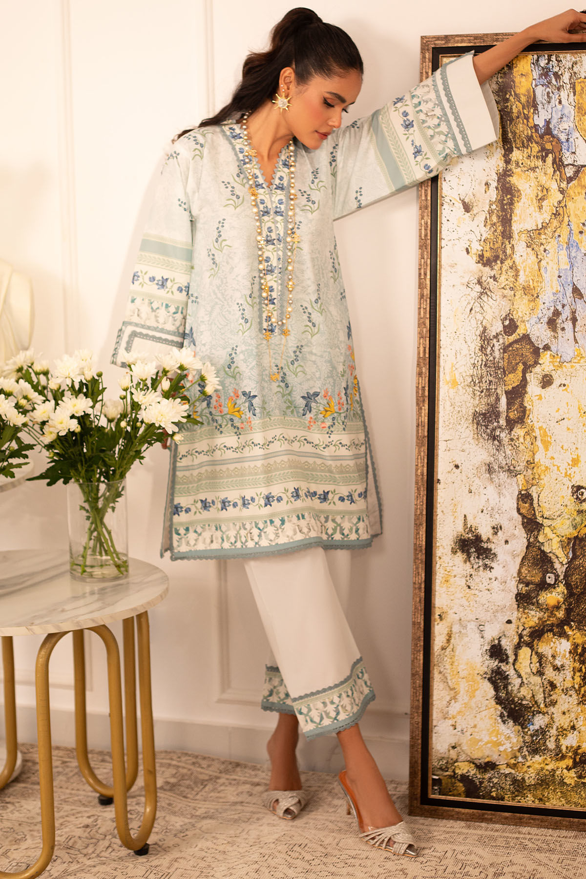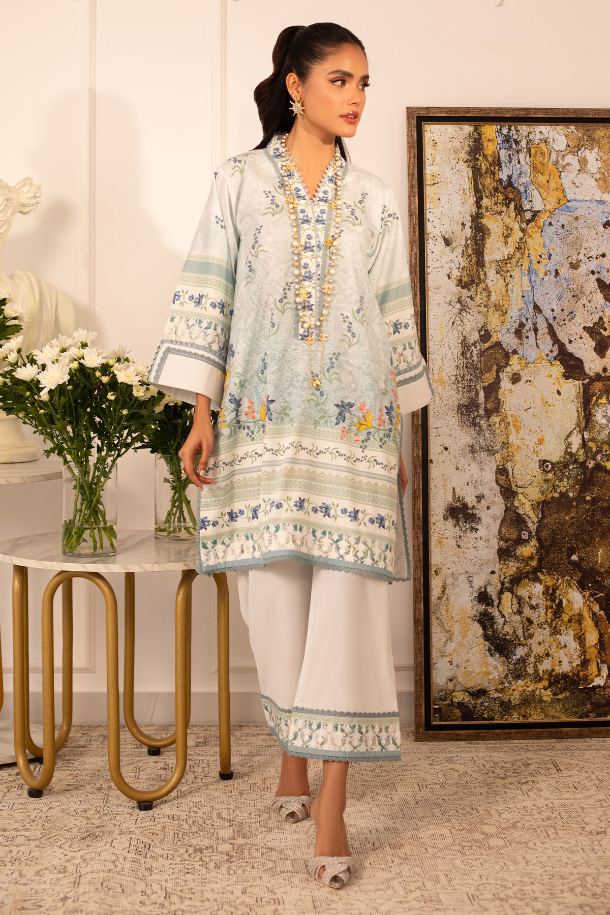 Quirky, trendy yet elegant co-ord set on crepe silk featuring balanced and carefully crafted prints, enhanced with lace details, is a must-have in your closet this summer.