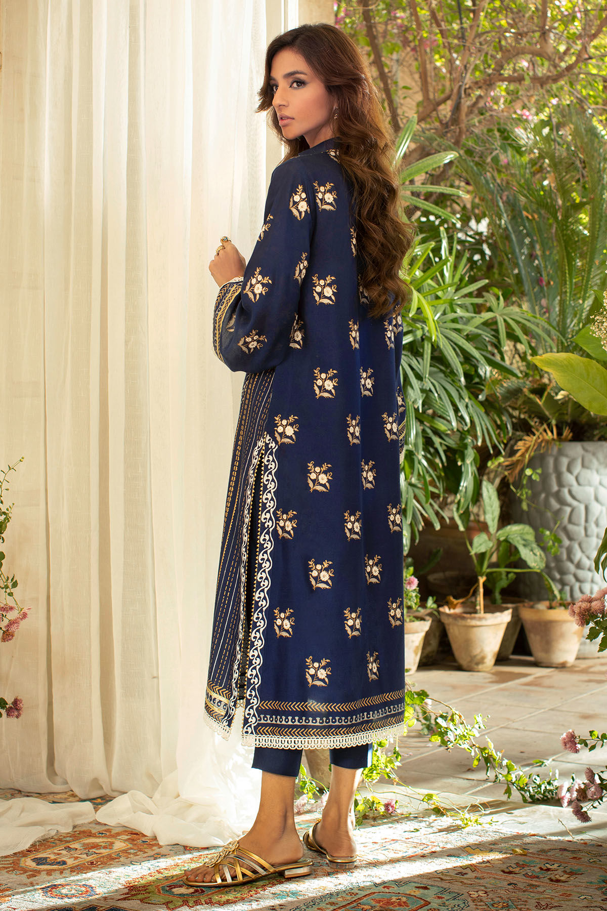 Long silhouette cotton net shirt featuring block printed details enhanced with gota edgings. The shirt can be paired with straight matching pants.