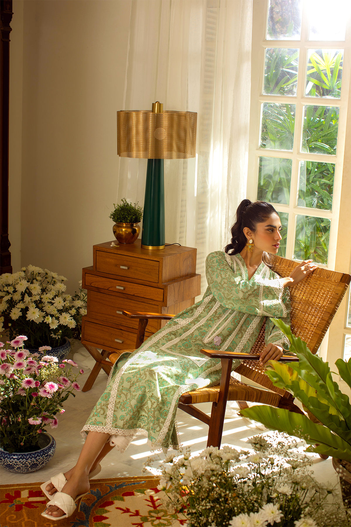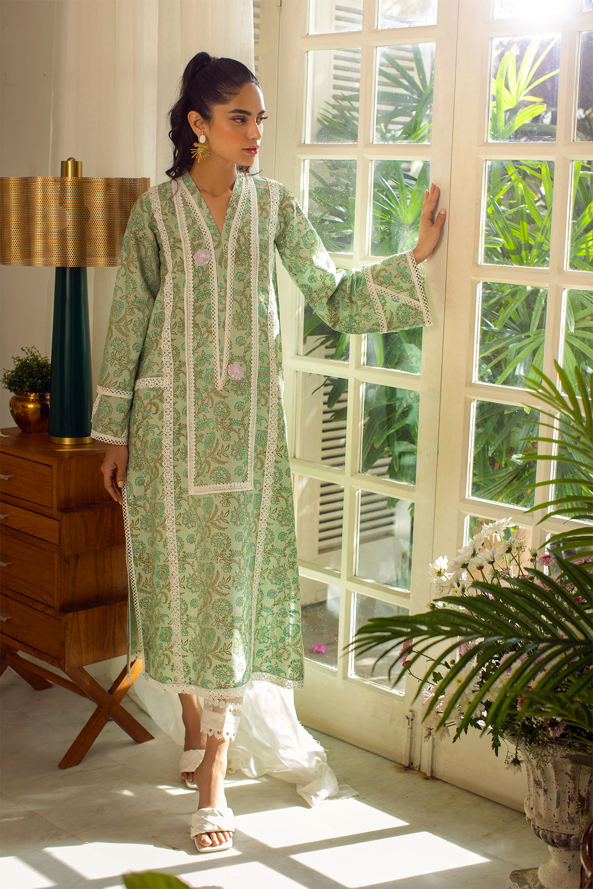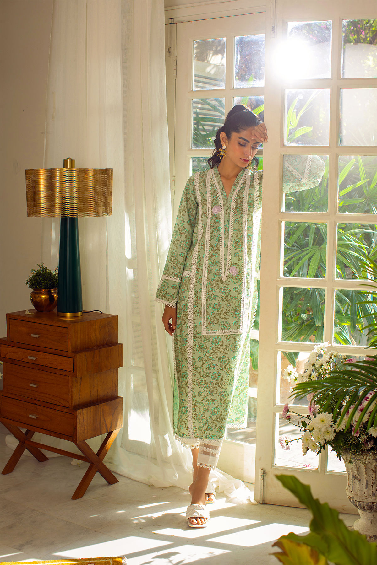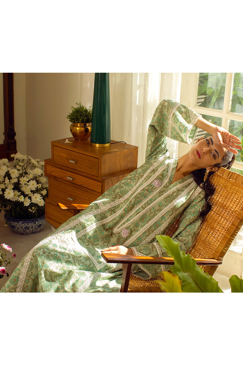 Long silhouette cotton net shirt in subtle mint green shade featuring self hand block printed details. The block printed canvas is adorned with crochet laces. The neckline is enhanced with resham rosettes in dreamy lilac shade.