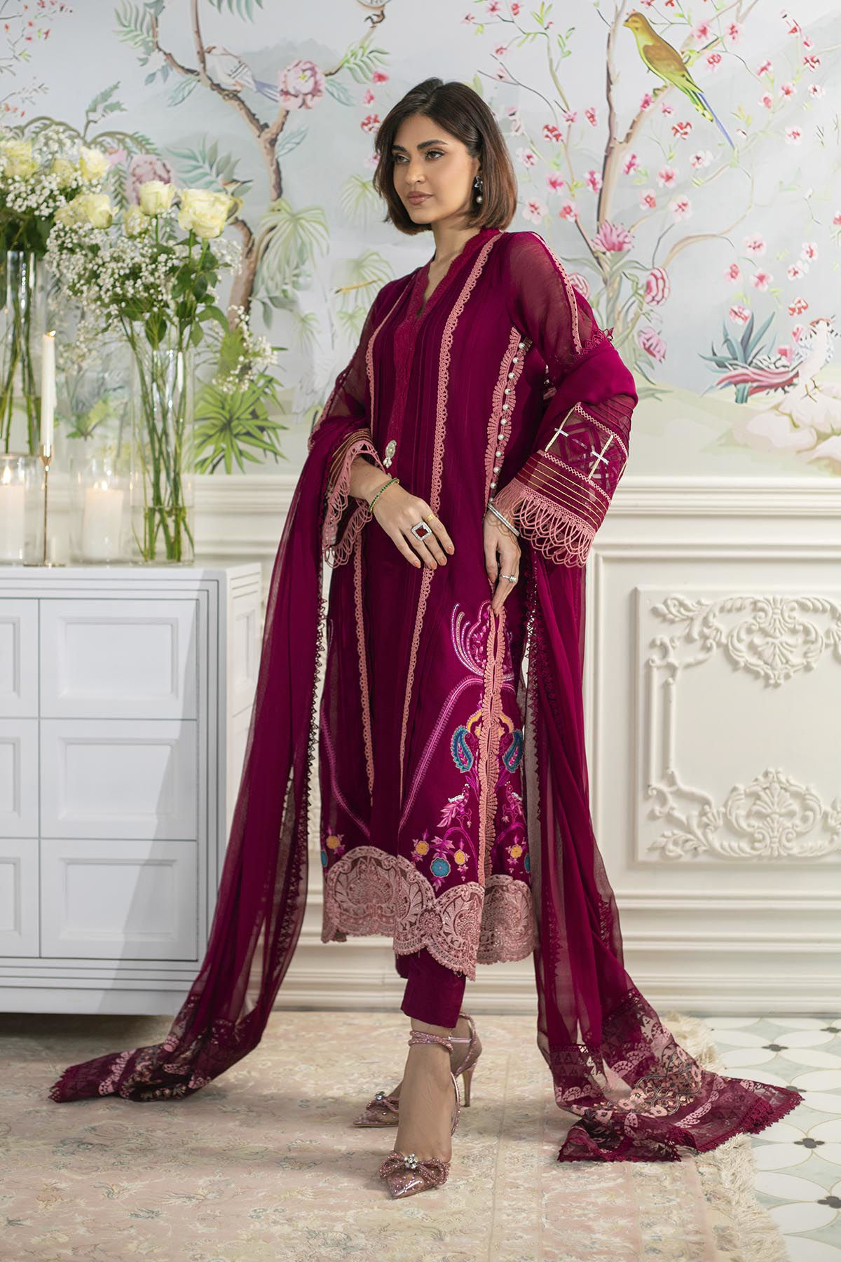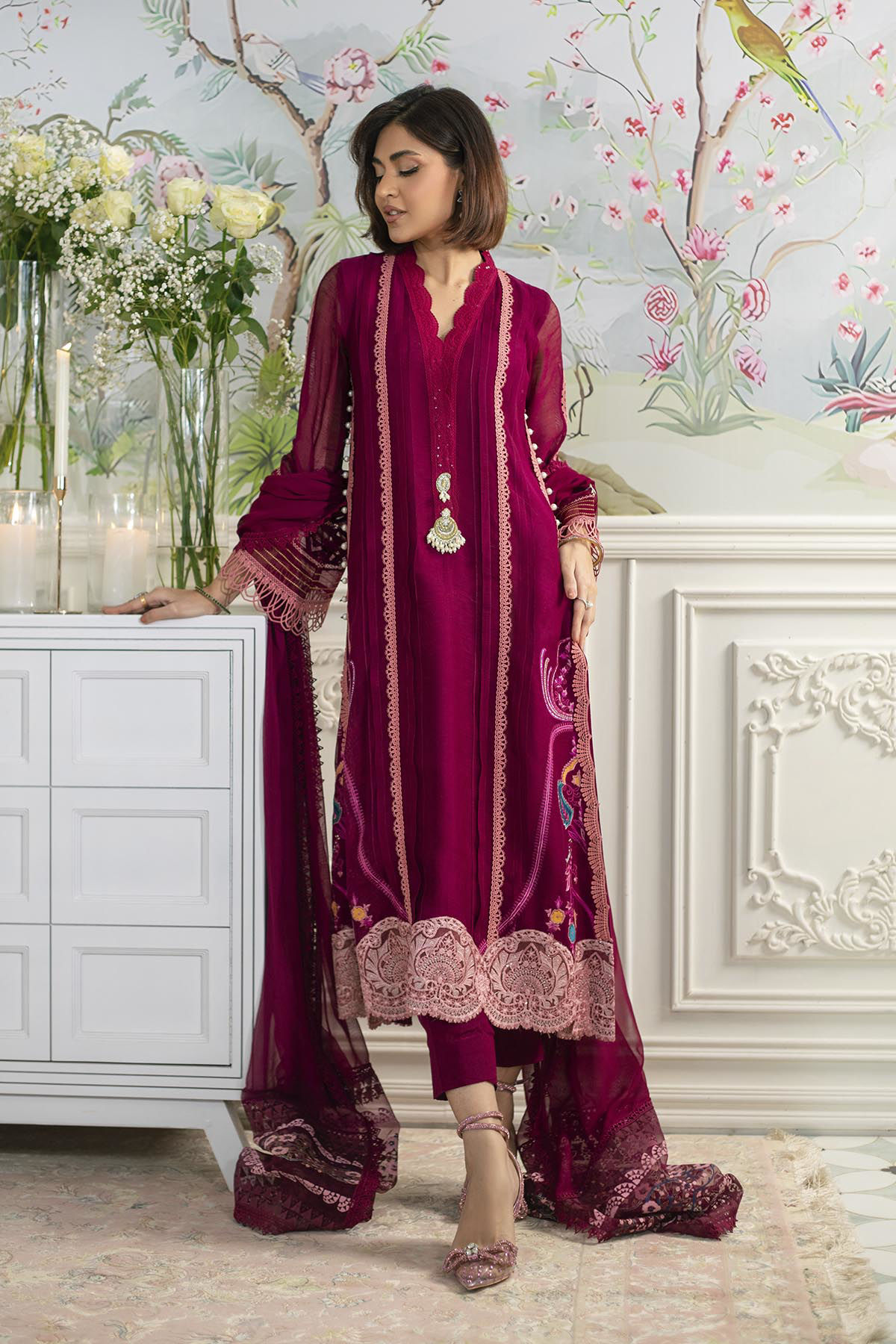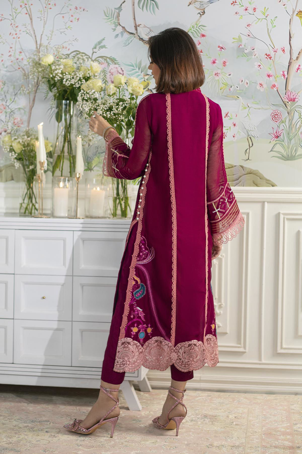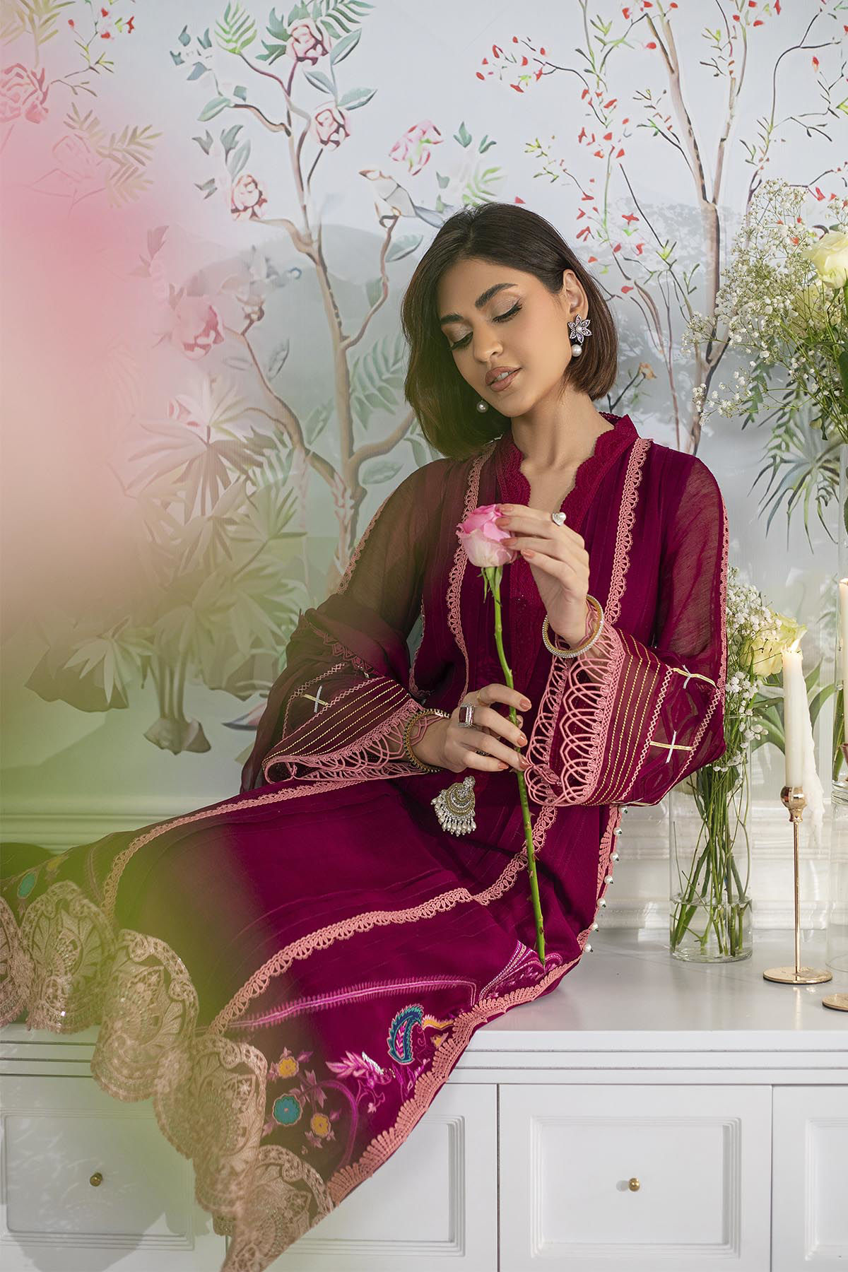 A long shirt presented in a distinguished deep cranberry, featuring contrasting blush accents, pleats, and intricate lace details along the center front. The side slits are embellished with appliqué detailing that showcases delicate peacocks and paisley motifs. The hem is further enhanced with an embossed organza panel. This shirt is complemented by straight matching pants and a sophisticated dupatta made of organza and chiffon, adorned with hand block printed details and finished with lace.