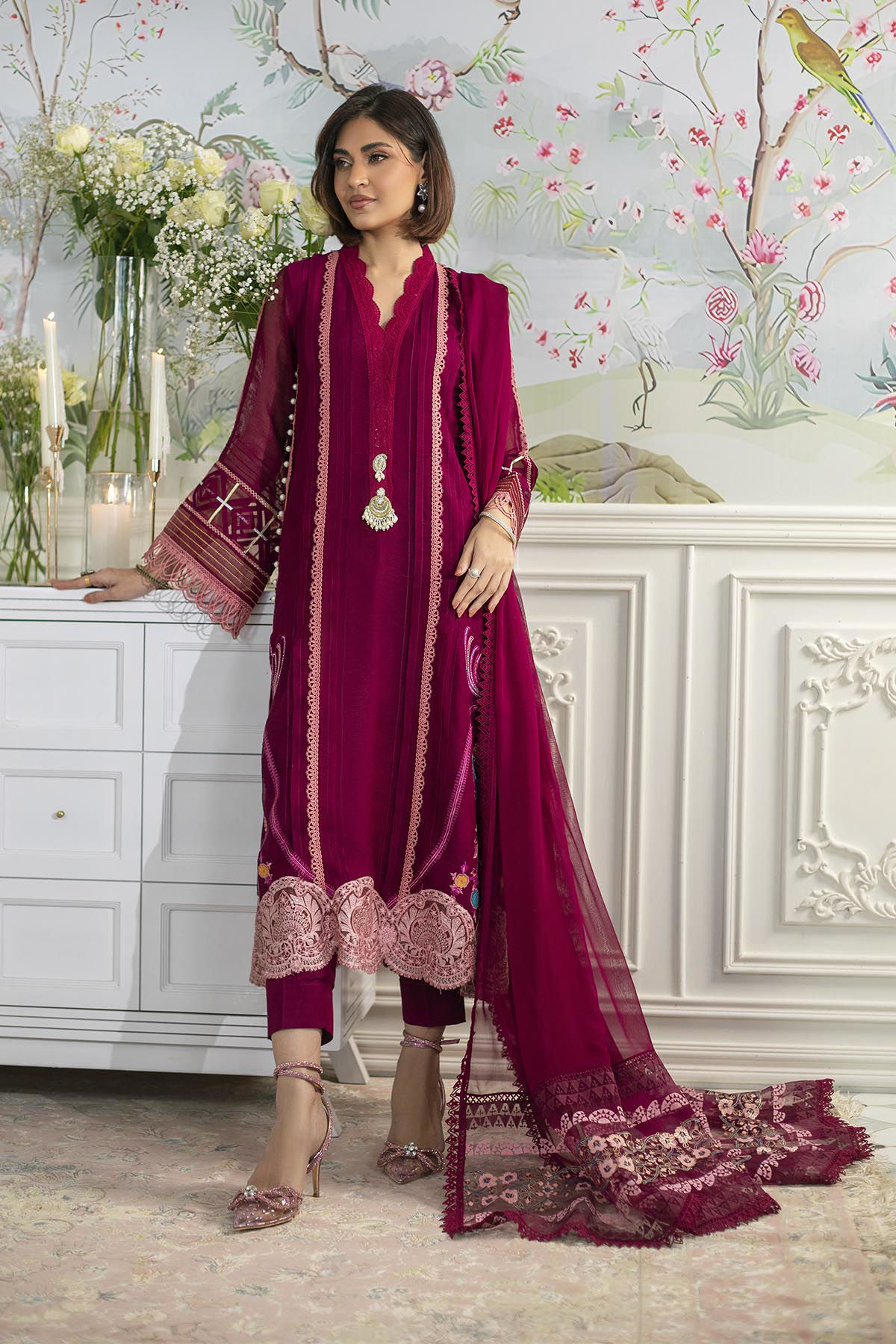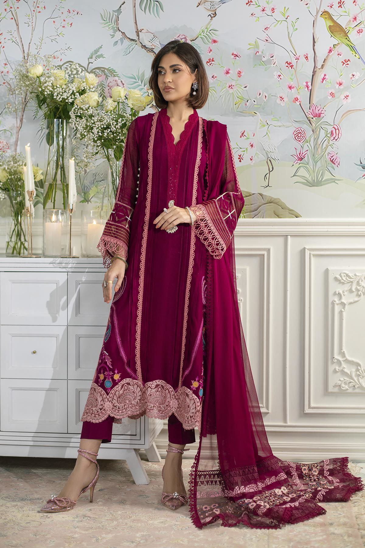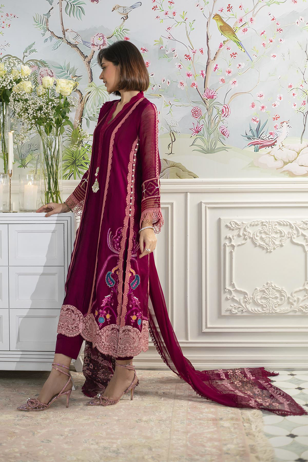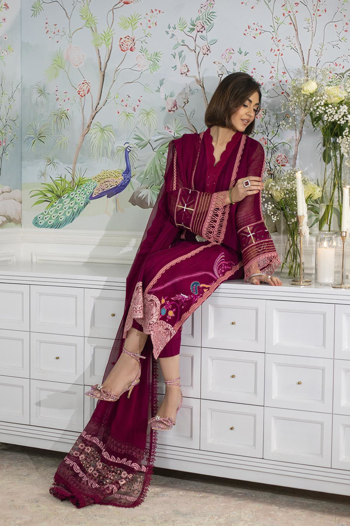 A long shirt presented in a distinguished deep cranberry, featuring contrasting blush accents, pleats, and intricate lace details along the center front. The side slits are embellished with appliqué detailing that showcases delicate peacocks and paisley motifs. The hem is further enhanced with an embossed organza panel. This shirt is complemented by straight matching pants and a sophisticated dupatta made of organza and chiffon, adorned with hand block printed details and finished with lace.
