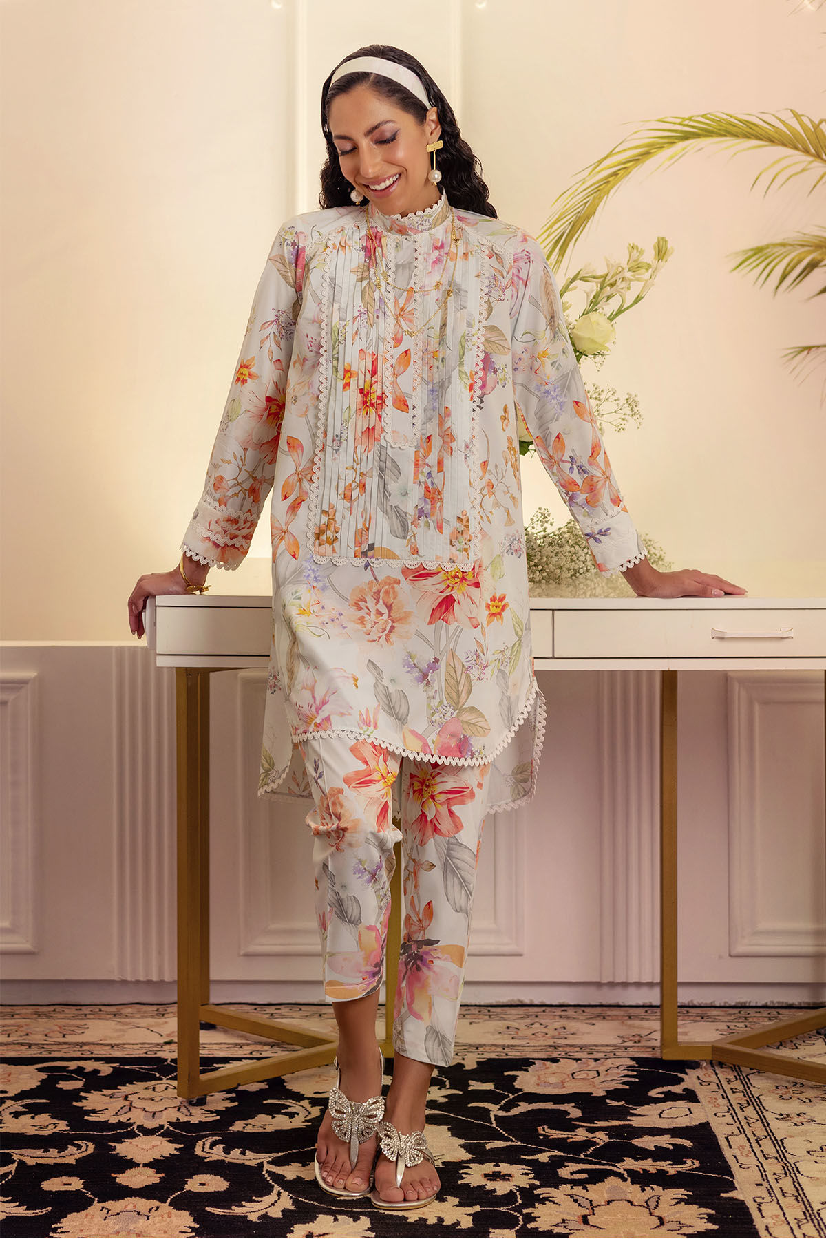 High low pleated floral co-ord set featuring beautiful lyrical symphony of Hydrangeas and Lilies. The neckline of the shirt is adorned with lace and pleated details. The printed shalwar is sure to set you apart.