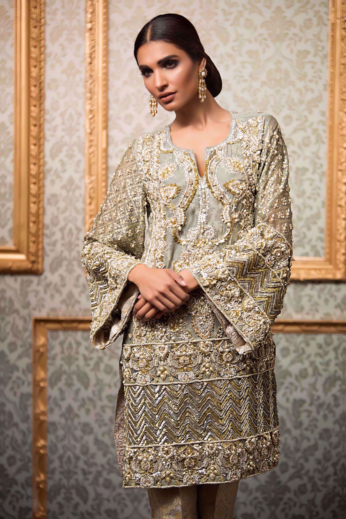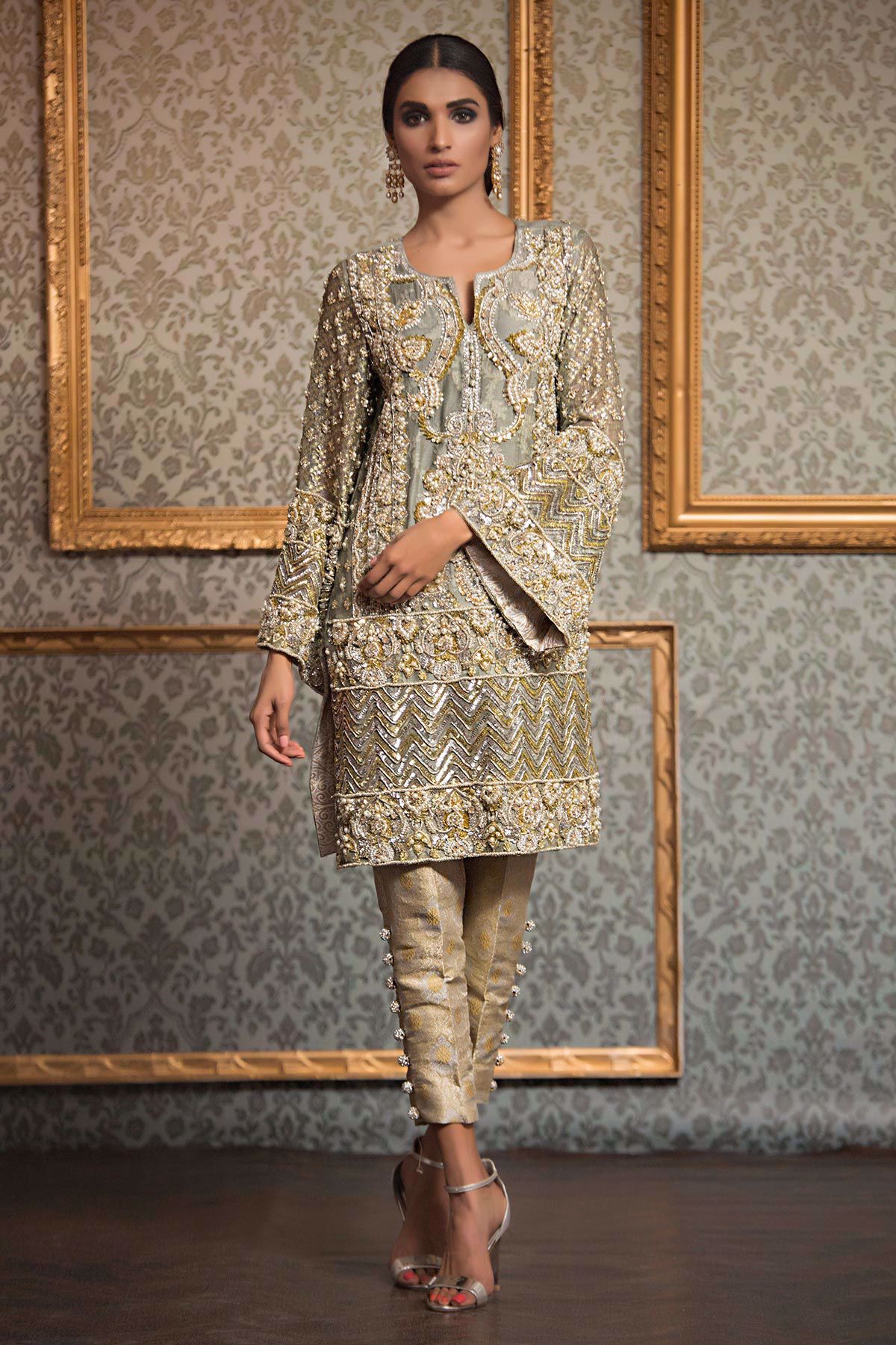 Grey gold silk net straight silhouette shirt with sequins chevron border on the hemline with pearls and zardozi work on the front of the shirt. The sleeves of the shirt has heavy details of pearls and sequins. The shirt has flared sleeves. The back of the shirt has botis overall.