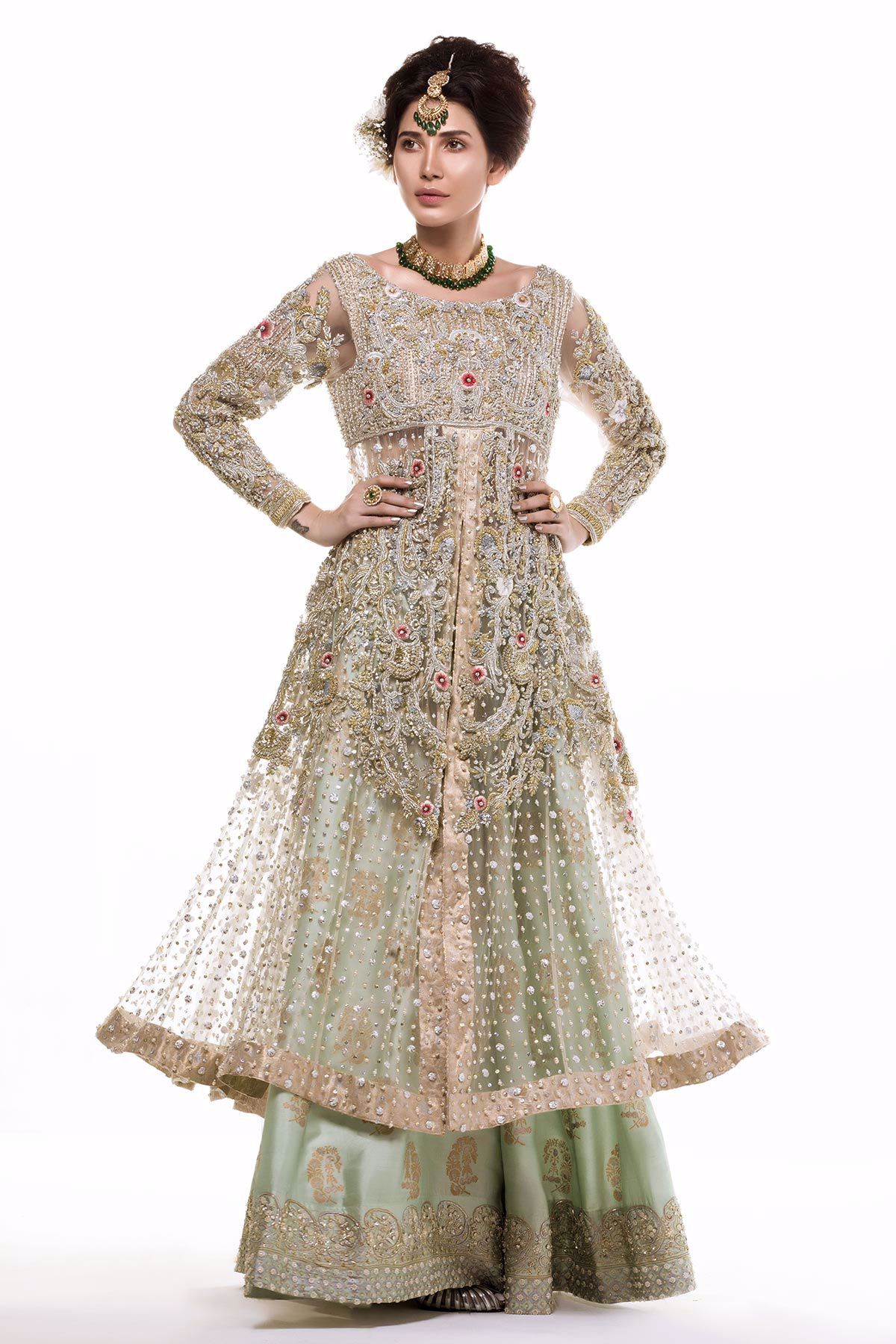 A timeless possession, this super gorgeous white and silver long flared silhouette features an array of hand embroidered techniques. From gorgeous silk threads floral rosettes to dabka and mukesh, this outfit has it all.. This head turning ensemble comes with hand block printed dhaka pants with crystals and pearls embellishments on the hemline.