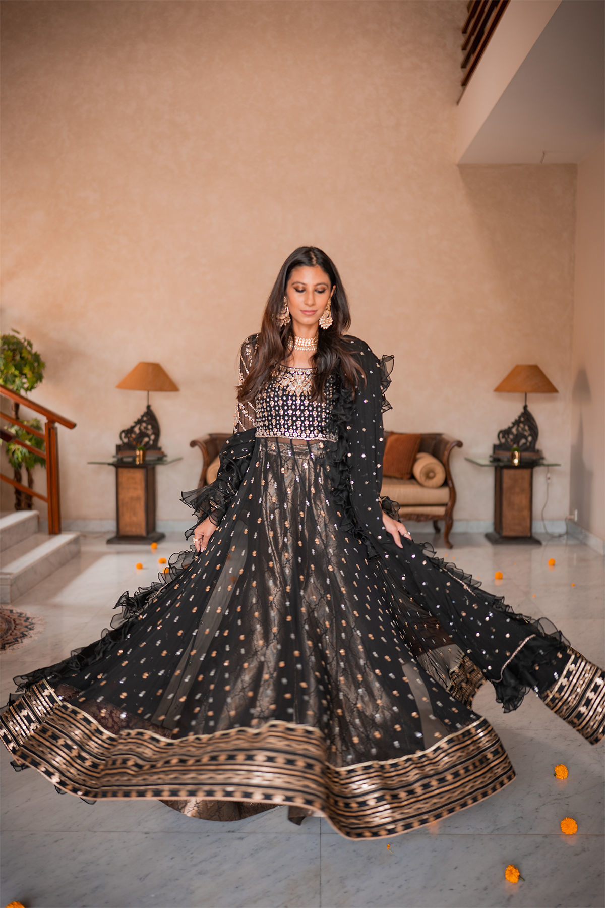 Floor length pishwas on pure chiffon noir canvas featuring old school handcrafted details in silver and golds. The back of the pishwas is adorned with handcrafted signature AA tassel. The pishwas can be paired with damask dhaka pajama and chiffon organza ruffled dupatta featuring gold and silver sequins.