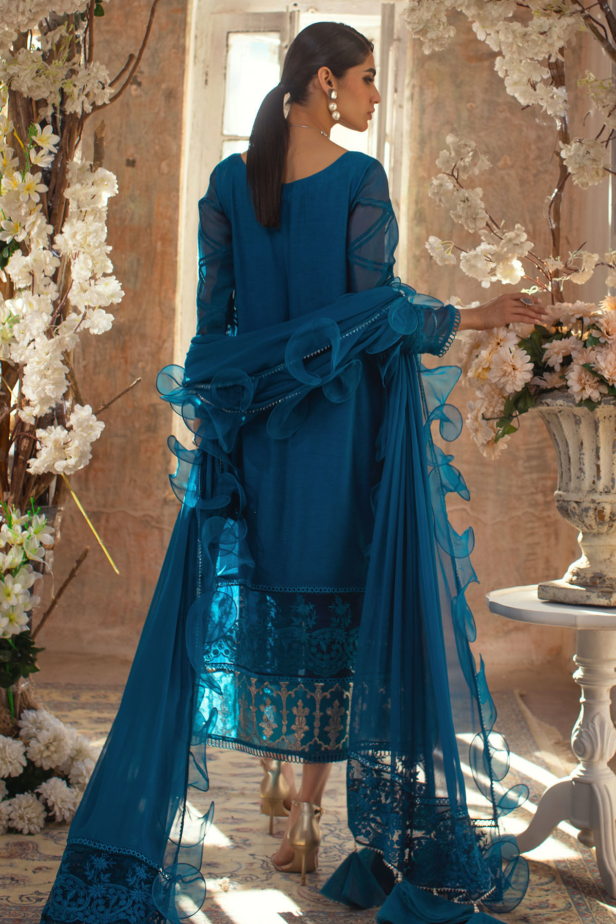 Long silhouette shirt in gorgeous shade of cobalt featuring lace details on center front. The neckline is adorned with pearls and dabka details. The hemline is set to perfection with fabric manipulation and embroidered organza details. The shirt can be paired with matching straight raw silk pants. The outfit is paired with matching chiffon dupatta featuring embroidered pallu which are further decorated with tassels and organza ruffles on each sides.