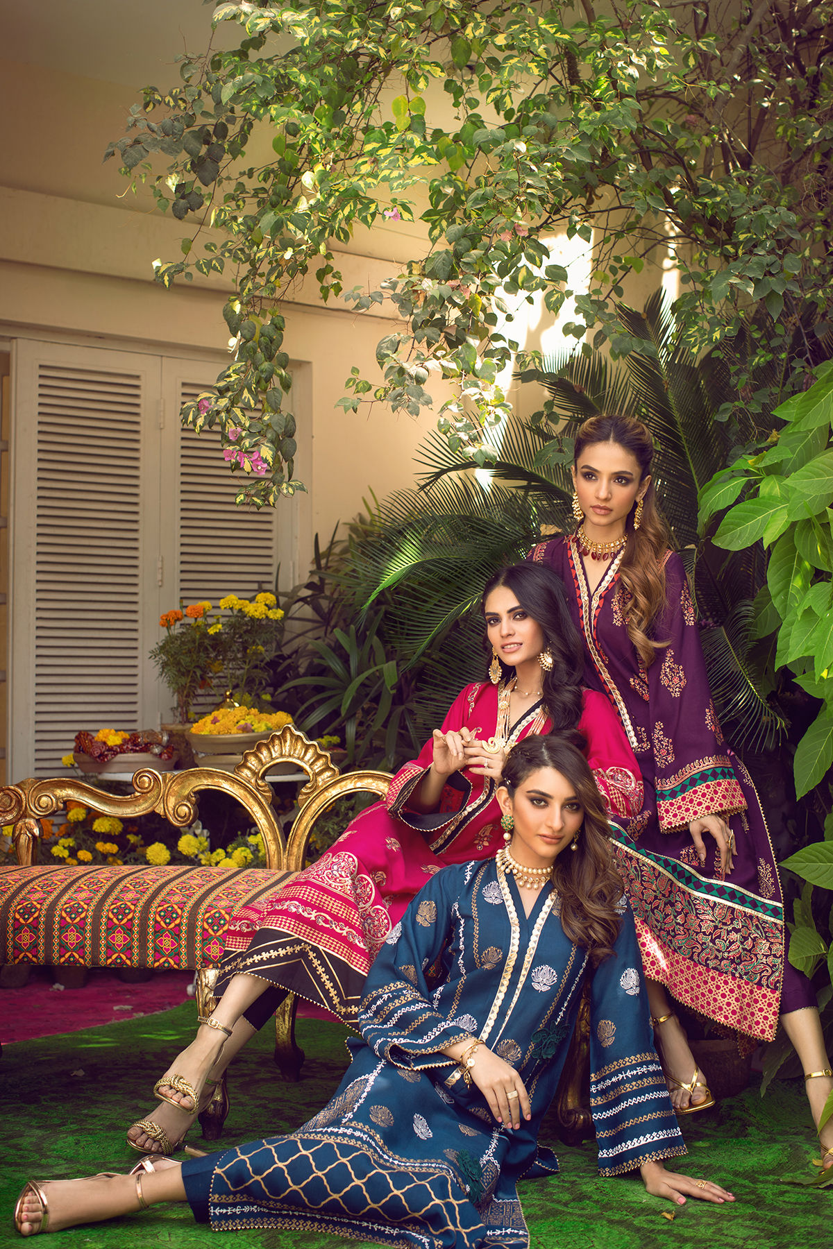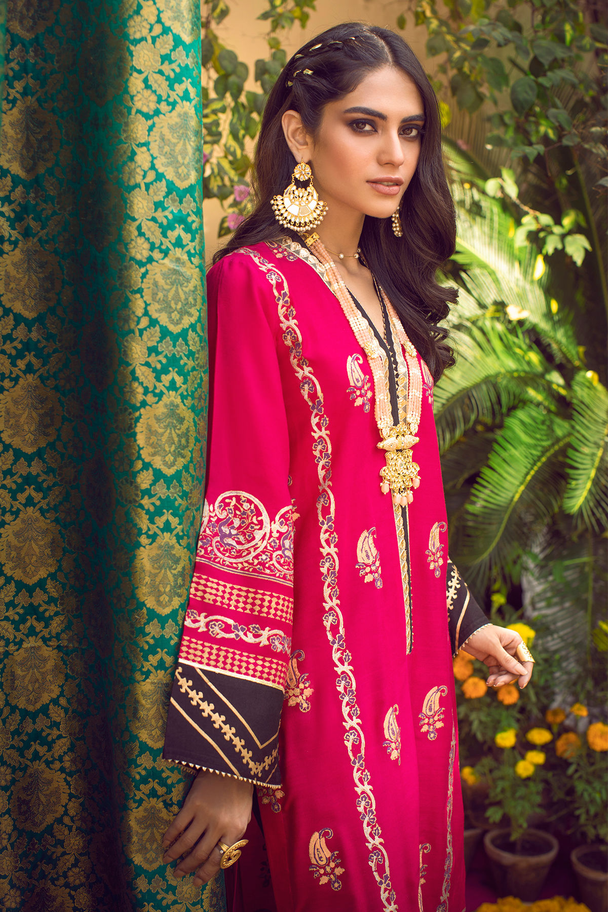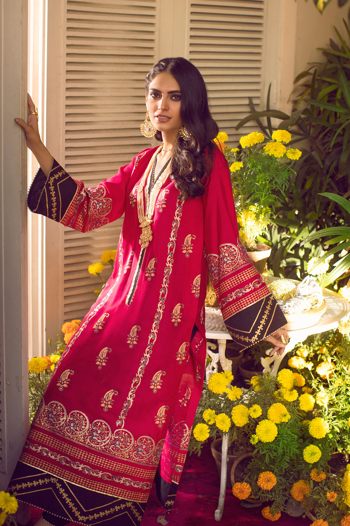 Long silhouette cotton net shirt in striking fuchsia and black featuring gold and silver hand block printed details. The neckline is enhanced with gota lace and contrasting black edging. The shirt comes with straight black pants with gota on the hem.
