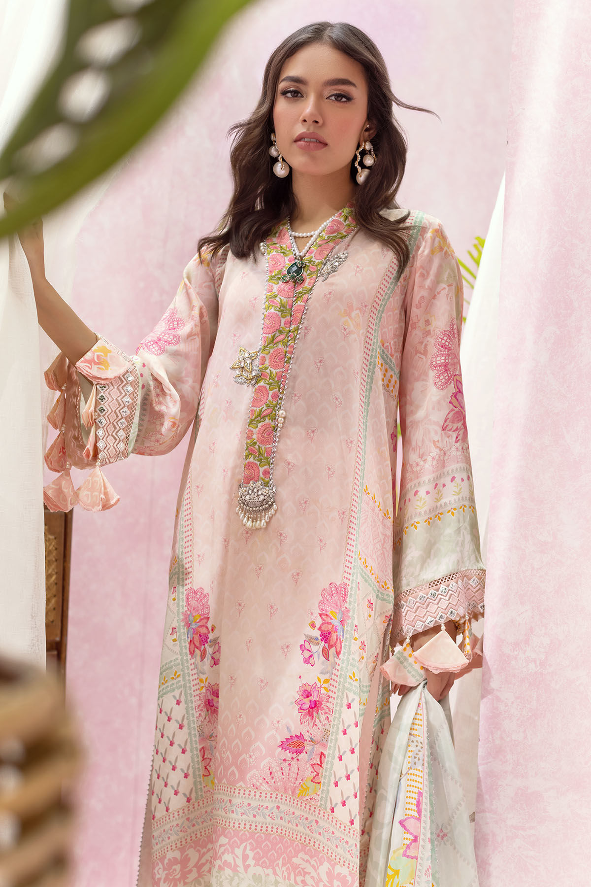 Long silhouette shirt on silk canvas in soothing shades of powder pink and mint enhanced with floral embroidered neckline. The neckline is further adorned with handcrafted tassels and the shirt comes with silk dupatta to complete the look.