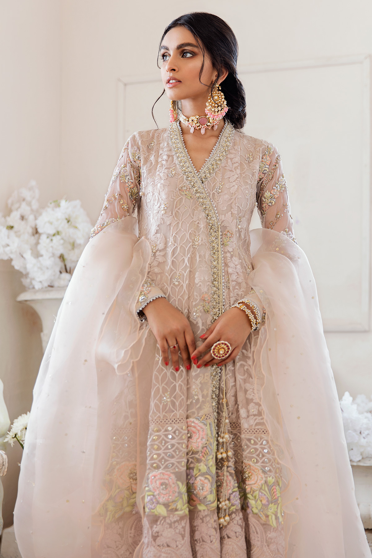 The angharka can be paired with AA signature raw silk pants and organza dupatta with pearls and sequins.