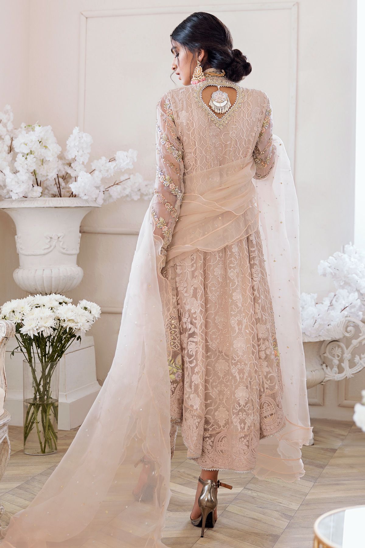 High low silhouette angharka in butterscotch color featuring different patterns of self-embroidered organza. The hemline of the angharka is adorned with silk thread embroidered details which are adorned with pearls, sequins and light catching crystals. The neckline is handcrafted with dabka and stones incorporated with gorgeous handcrafted tassels. The sleeves are hand block printed which are enhanced with pearls and dabka.