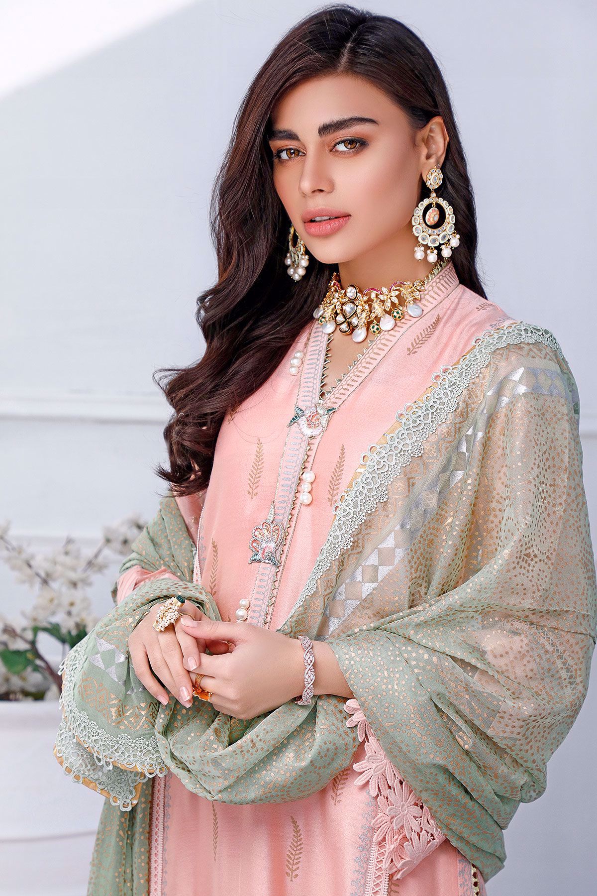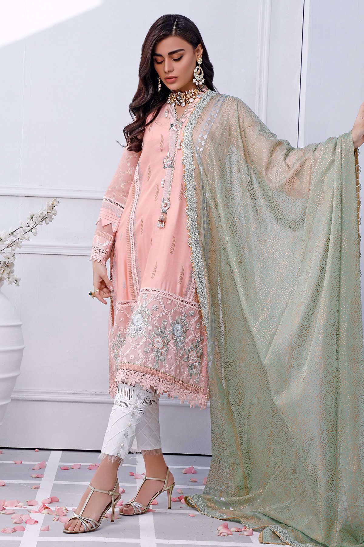 Pure cotton net shirt featuring block printed details incorporated with crochet laces. The hemline of the shirt is made of opulent floral embroidered rosettes which are enhanced with pearls, crystals and dabka details. The neckline of the shirt is enhanced with handcrafted rosettes with hand embroidered details along with pearls. The shirt is paired with Ambrosia hand block printed dupatta with crochet and gota details. The outfit is paired with Celine pants featuring pure raw silk plated details, crochet laces, organza and pearls.