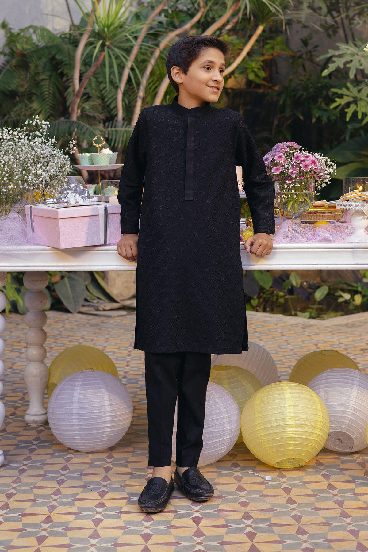Self-embroidered kurta in classic black, showcasing tone-on-tone embroidered details on both the front and back. The neckline is accentuated with a placket, and the kurta can be elegantly paired with straight white pants to complete the ensemble.