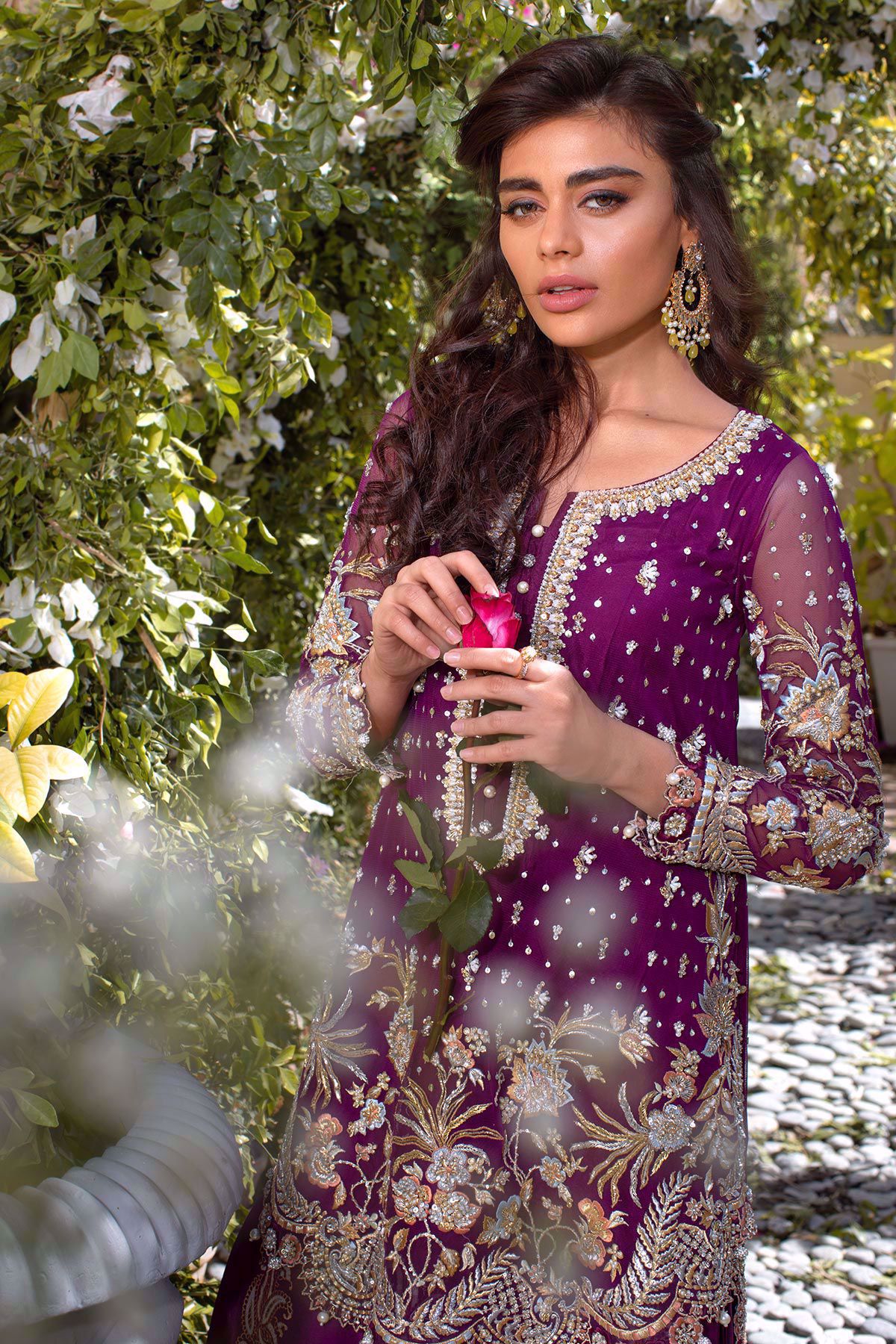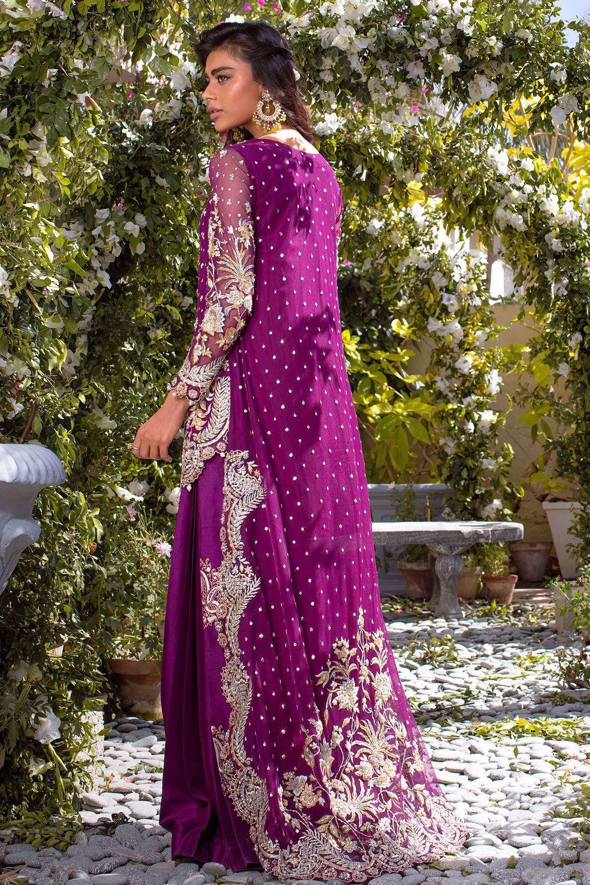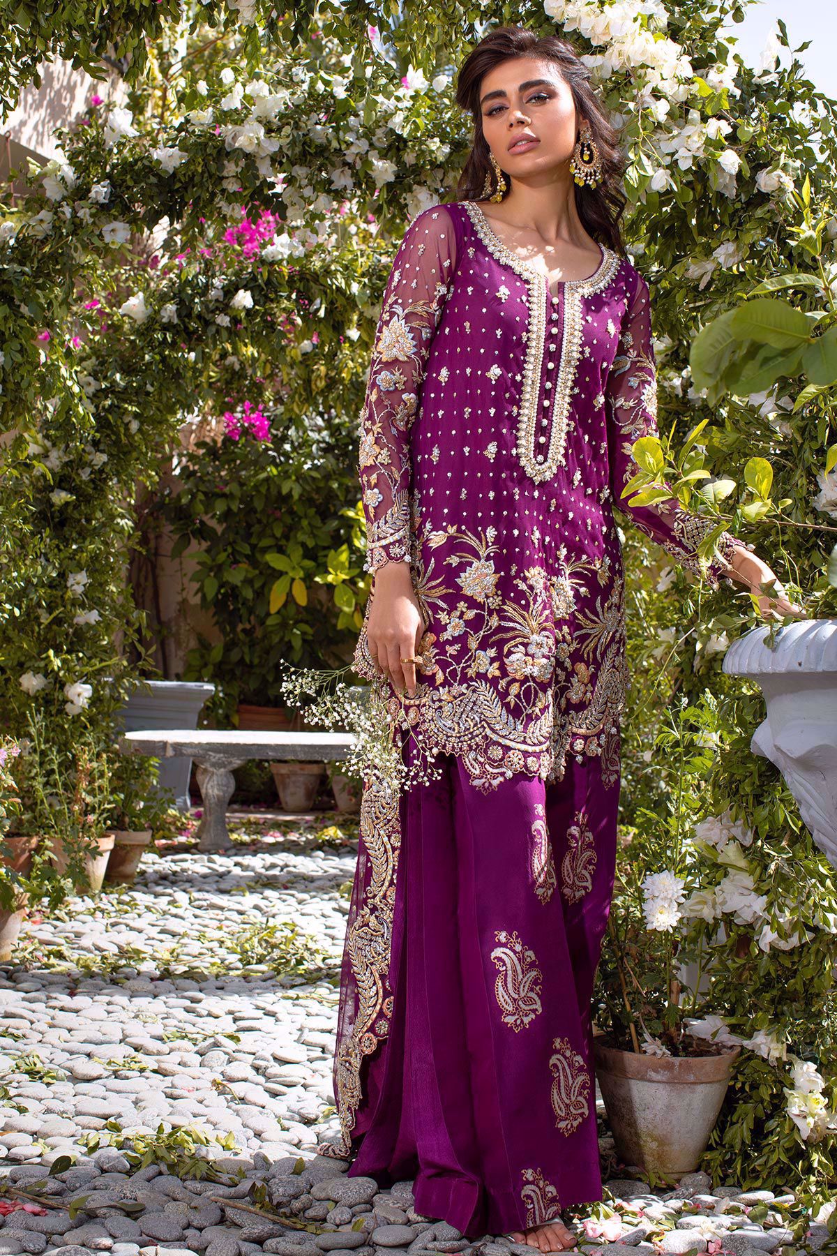 Deep plum net high low silhouette with stunning floral details in gold and silver incorporated with stones, pearls and dabka. The neckline of the top is enhanced with dabka, nakshi and kora with light catching crystals. The top comes with pleated flared pants with hand block printed details in silver and gold.