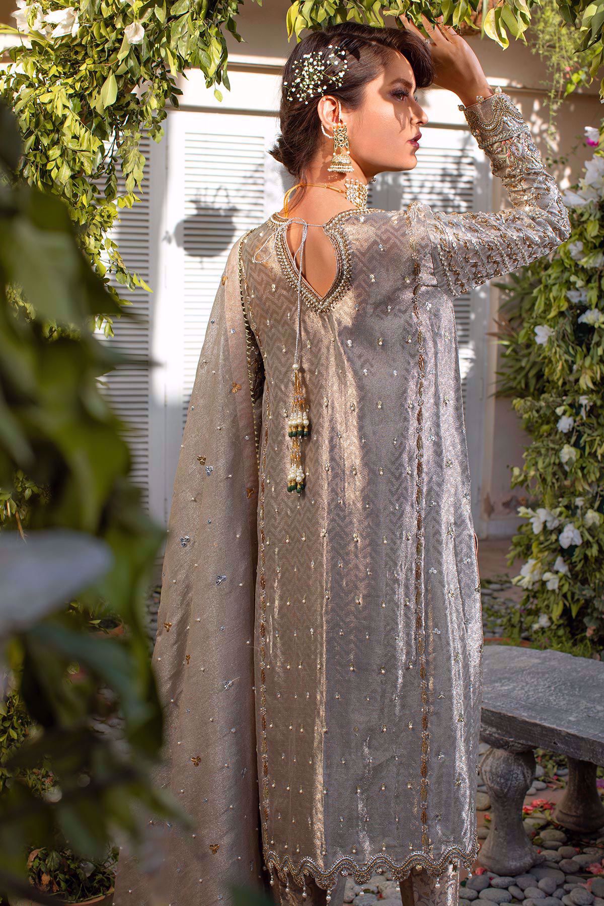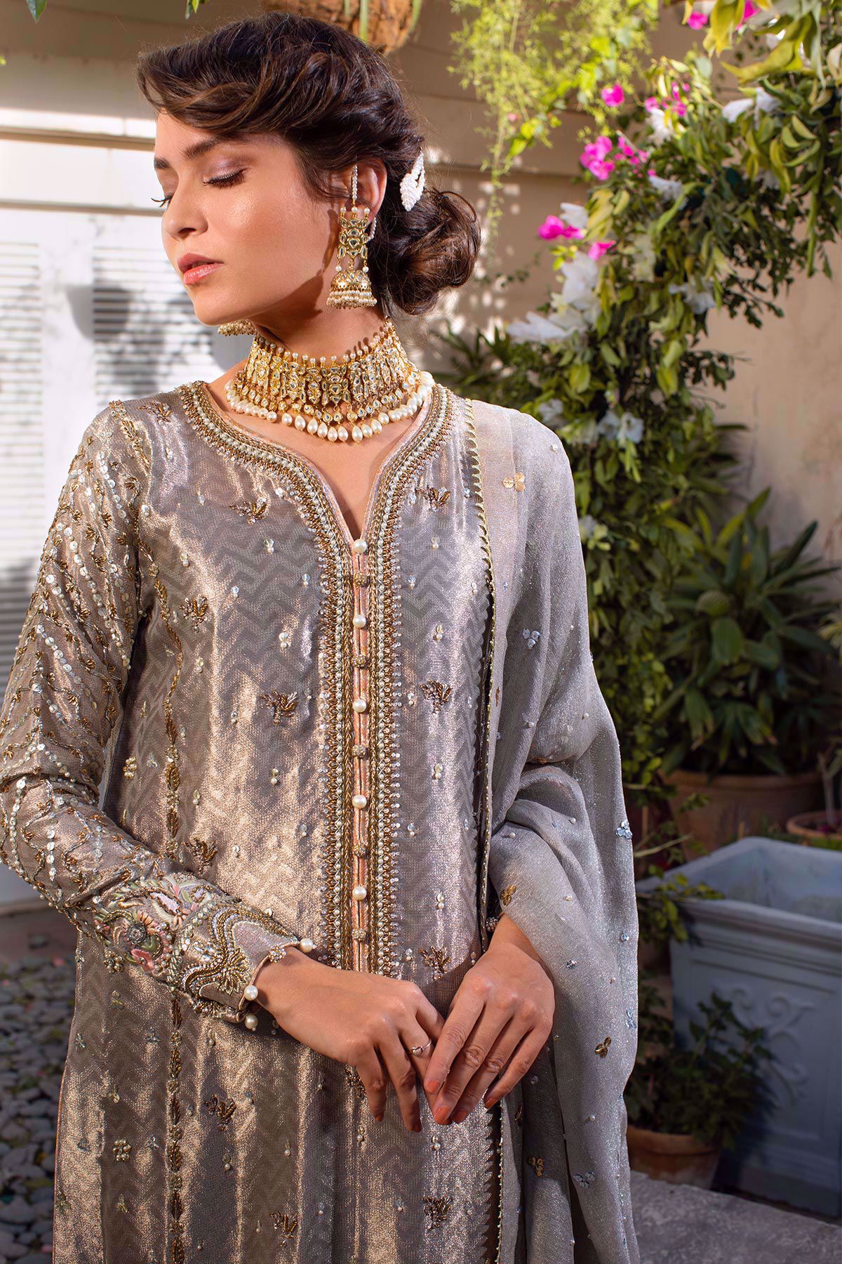 Head turning grey lamé long shirt with pastels rosettes details on the hemline, the silk thread rosettes are further enhanced with light catching crystals, pearls and dabka. The neckline of the shirt has handcrafted details of antique and silver dabka with stones and sequins. The back of the shirt comes with a keyhole detail which is enhanced with handcrafted tassels with pearls and jade. The shirt is paired with damask straight pants with pearls and fringes details. The outfit is paired with shimmer net dupatta offset with pearls and sequins which is finished with gota details.