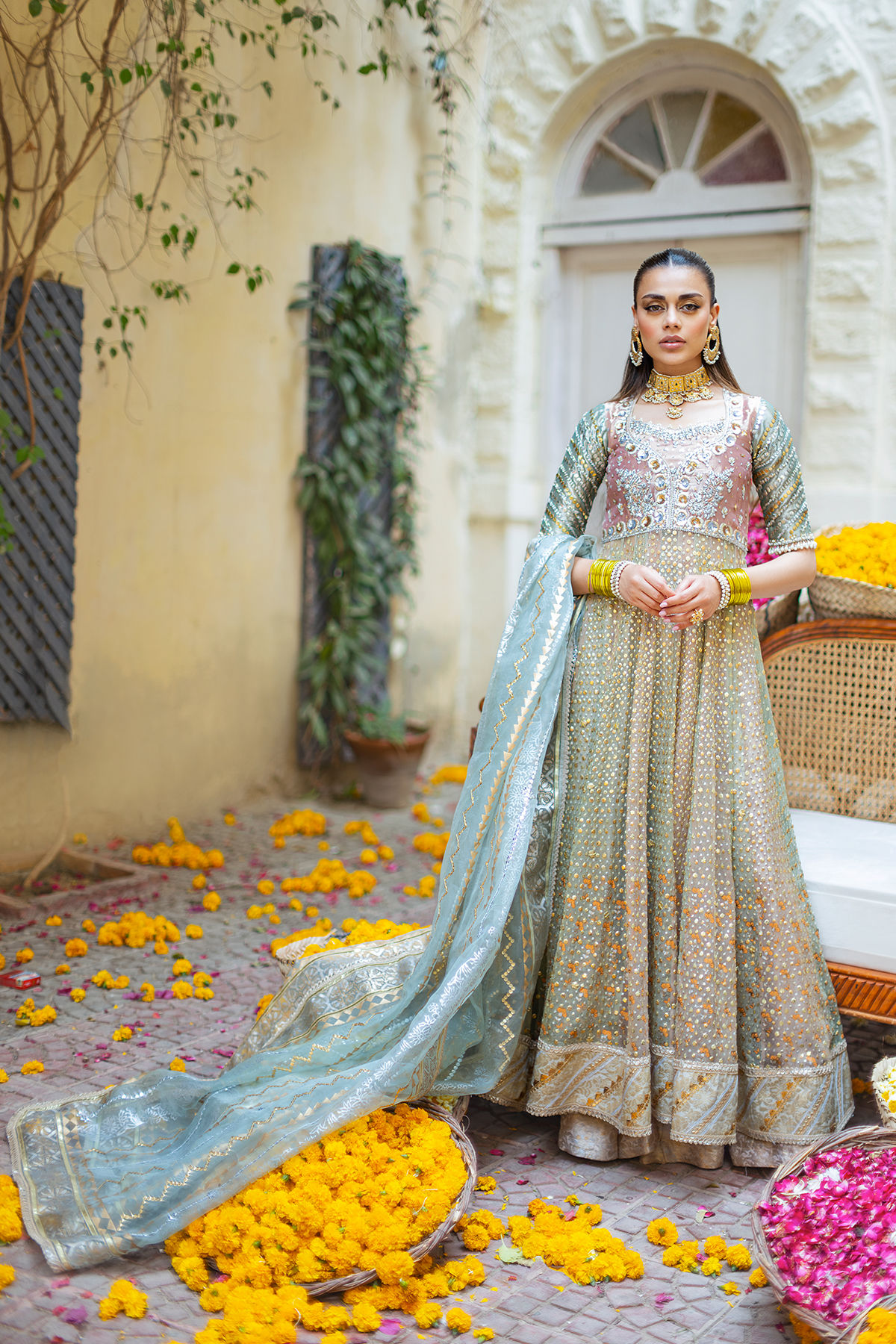 Long silhouette kalidar featuring subtle silk thread and zardozi floral details on bodice. The subtle panels on pure zari in shades of mint and peaches are enhanced with hand block printed details. The hand block printed canvas is further adorned with sequins spray and the hemline is adorned with gota details. The kalidar can be paired with gold damask dhaka and hand block printed organza dupatta in mint shade featuring sequins details.