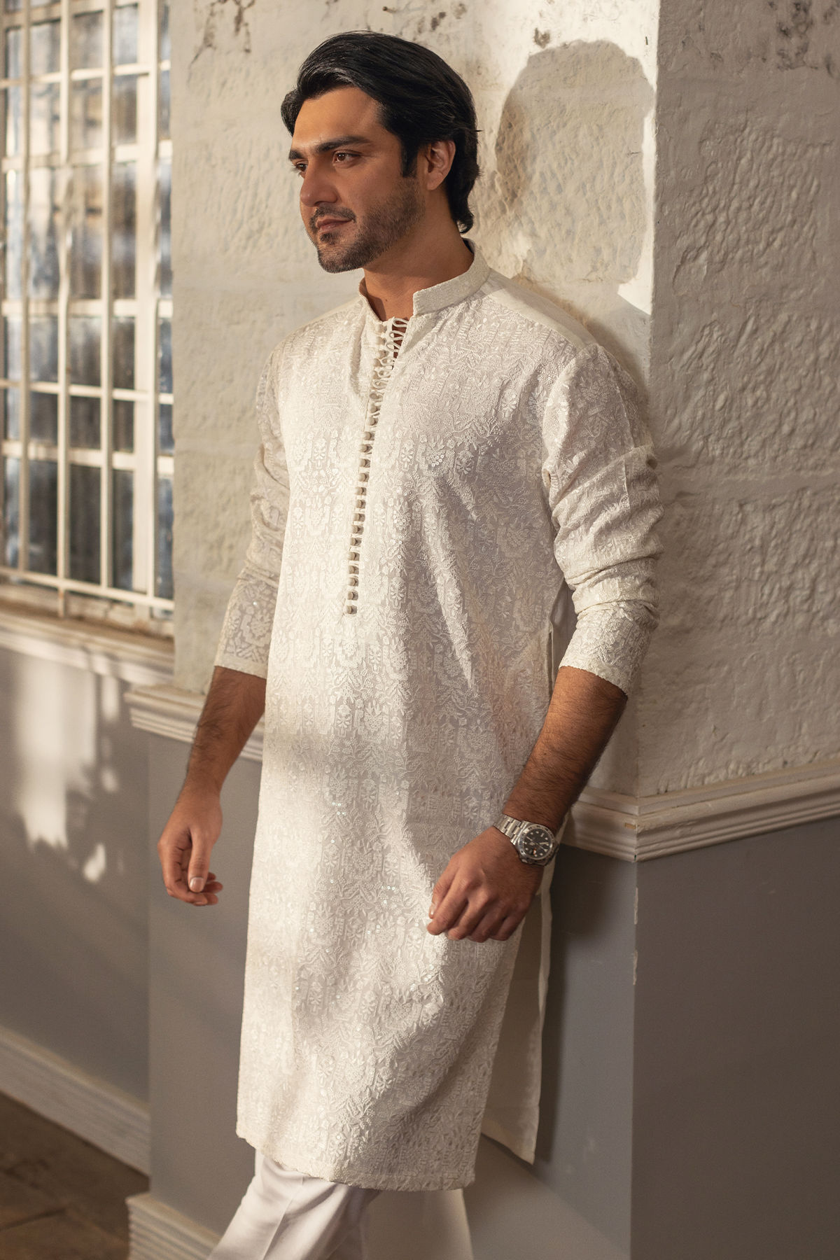 Embroidered raw silk kurta in elegant white featuring self-pattern details adorned with light catching sequins.The neckline is accentuated with loop buttons and the kurta can be elegantly paired with straight white pants to complete the ensemble.
