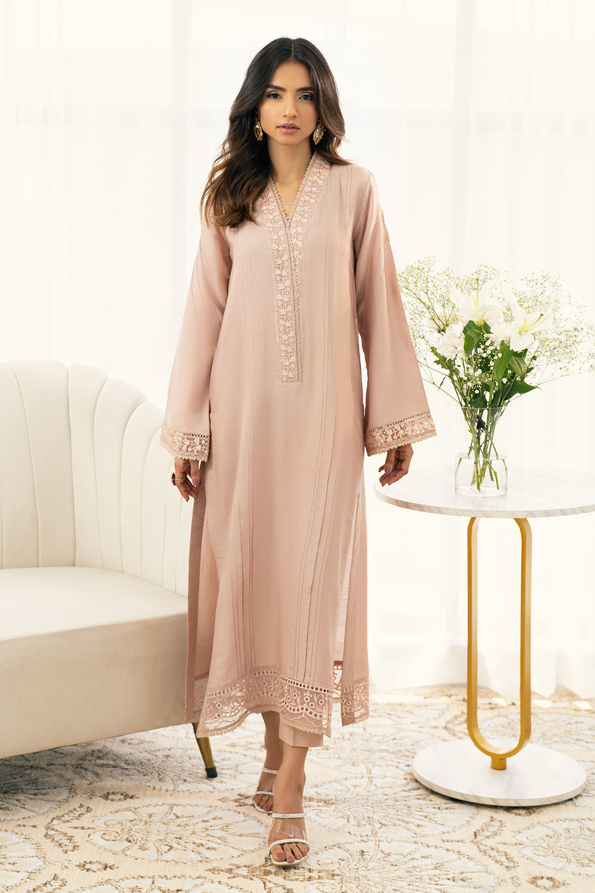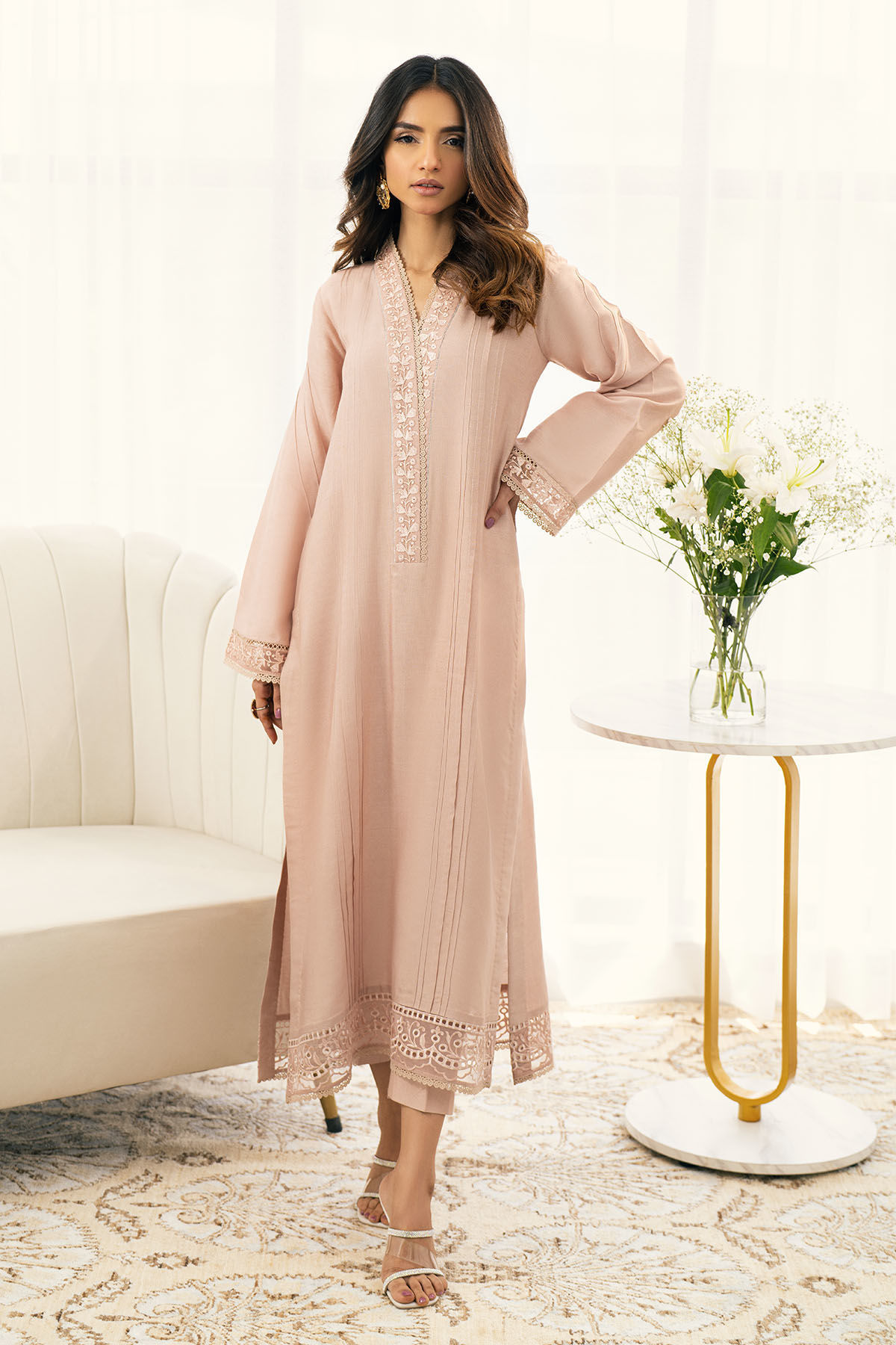 Long silhouette shirt in prettiest shade of subtle sand on cotton net featuring embroidered neckline finished with lace details. The centre front is adorned with pleats and pin tucks details and the hemline is enhanced with organza schiffli panel.
