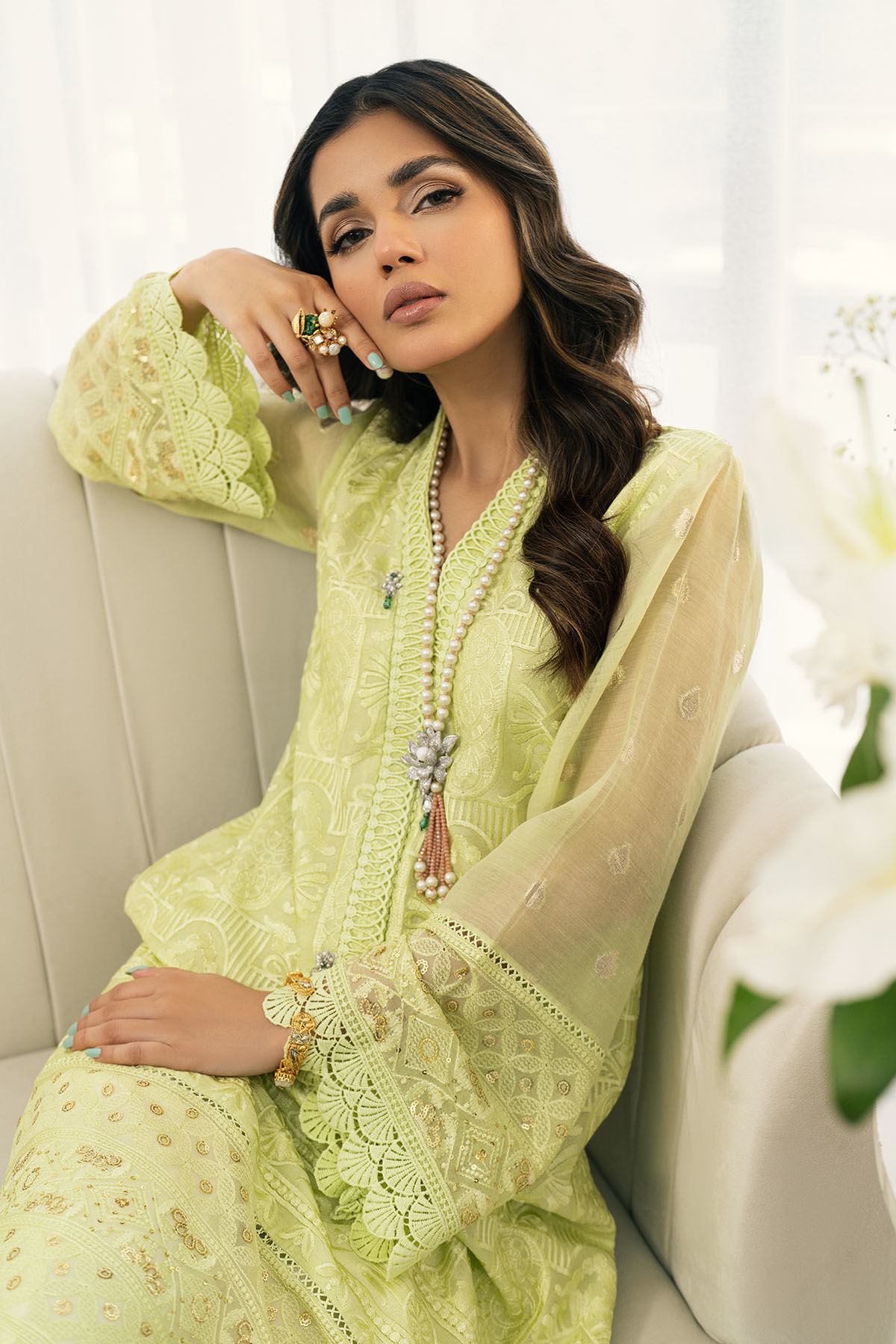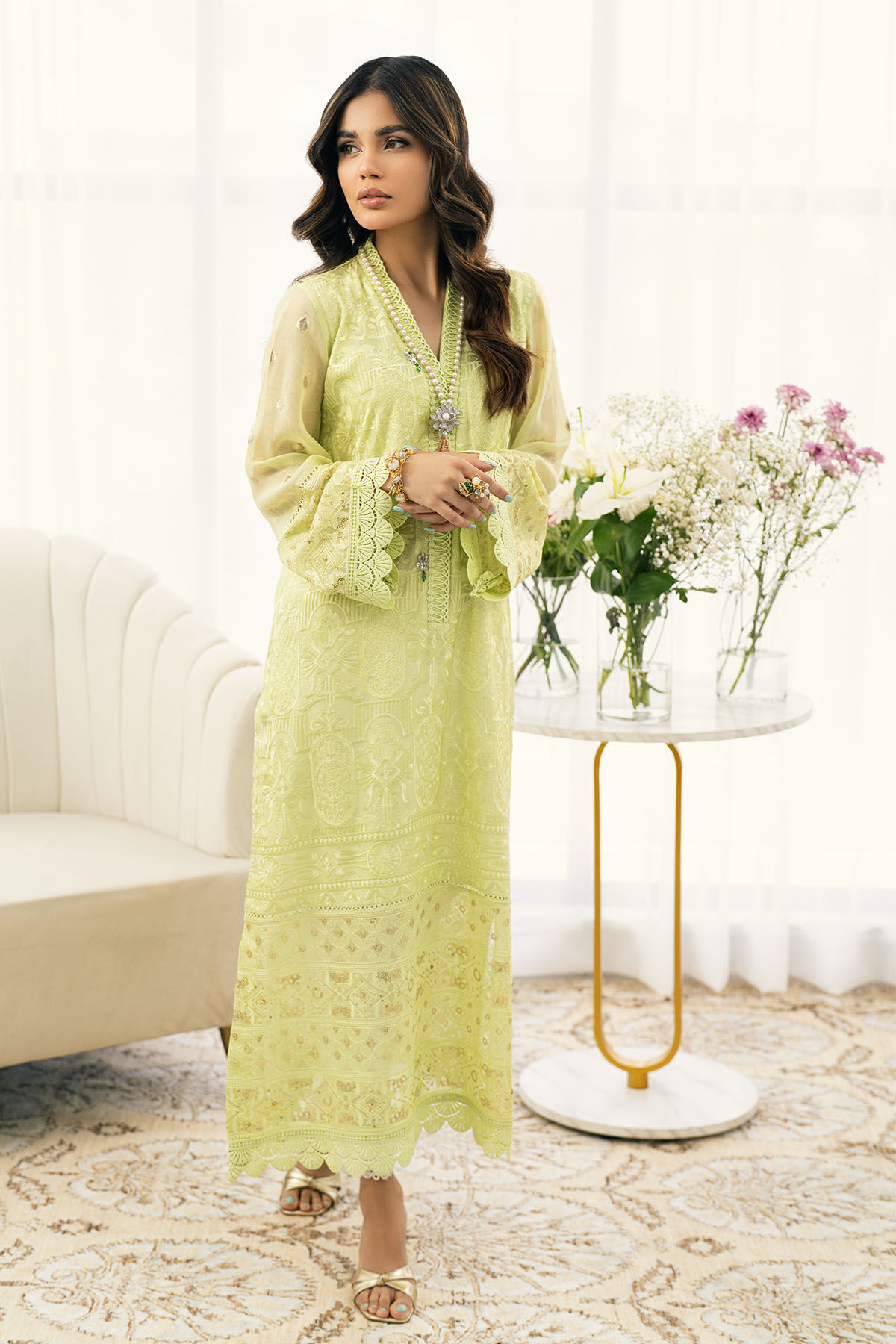 Long silhouette shirt in a tangy subtle green shade on embroidered cotton net featuring chikankari and sequins panel on hemline. The neckline is adorned with crochet lace and handcrafted embellishments. The gold lorex sleeves are enhanced with chikankari and lace details. The shirt can be paired with zuri pants featuring pleats and embroidered organza panel finished with lace.