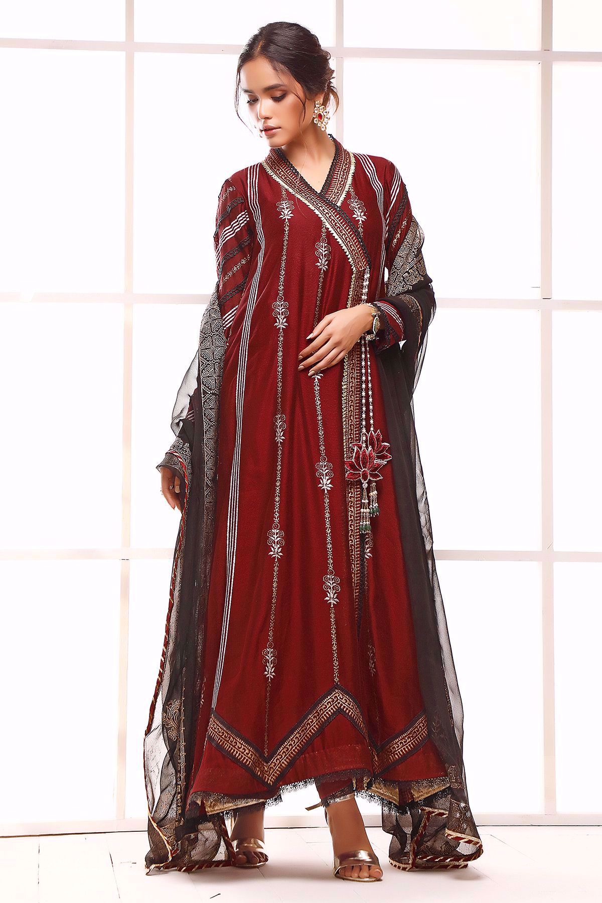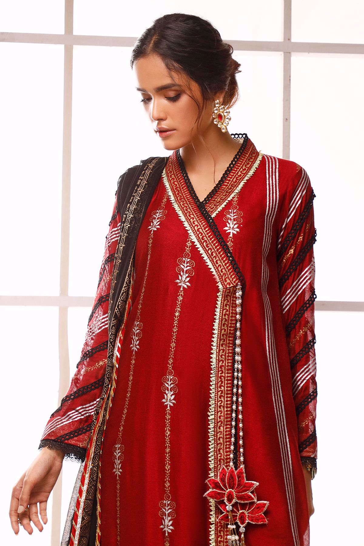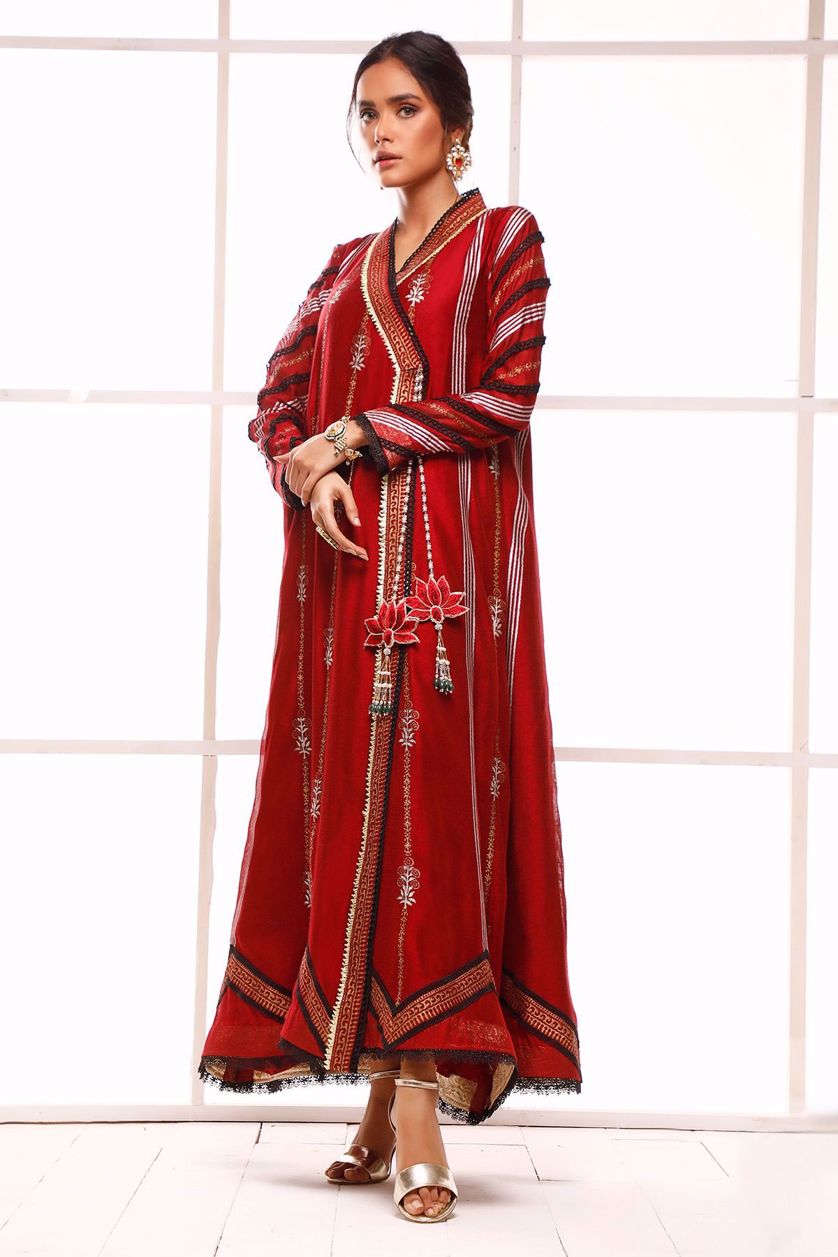 Long silhouette pure cotton net angharka with hand block printed details incorporated with lace finishings. The angharka comes with a handcrafted lotus tassel with dangling pearls and emeralds.