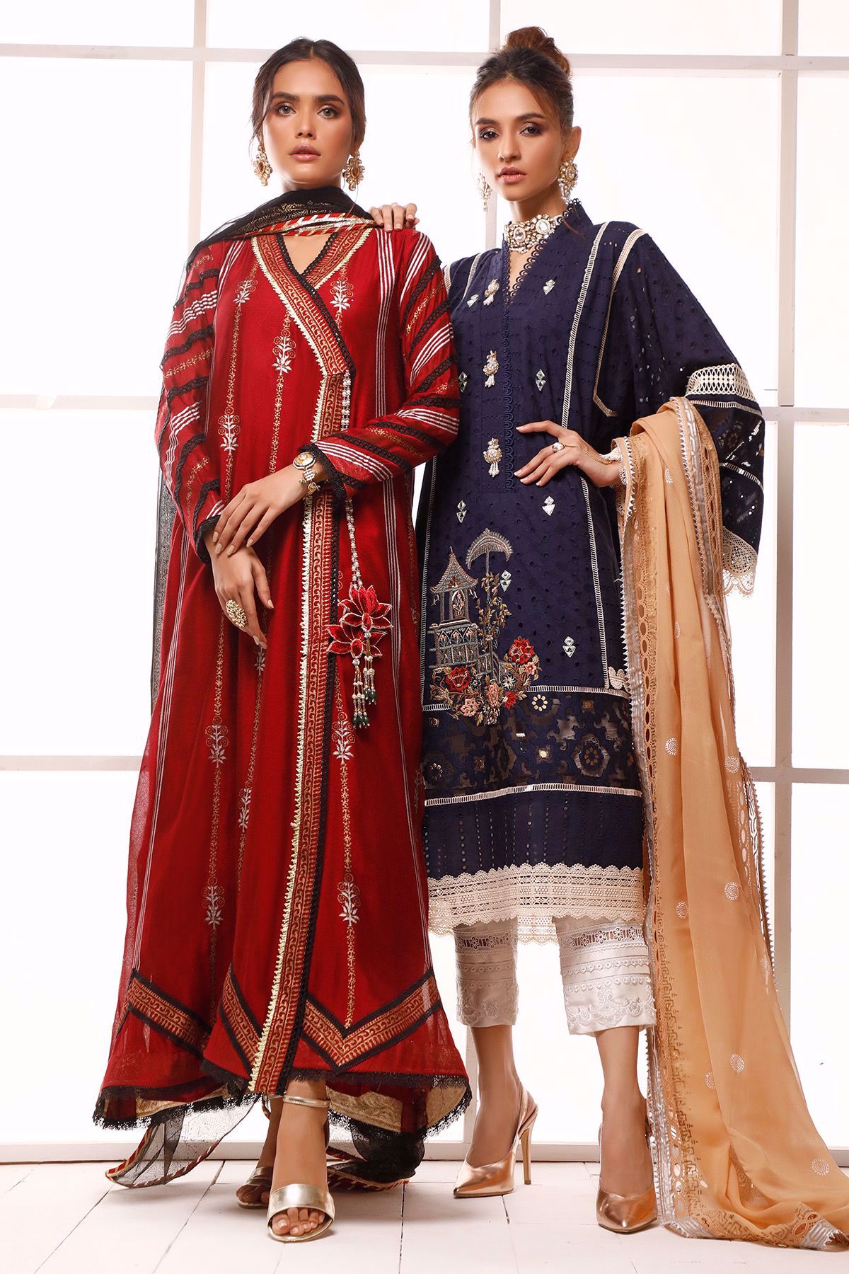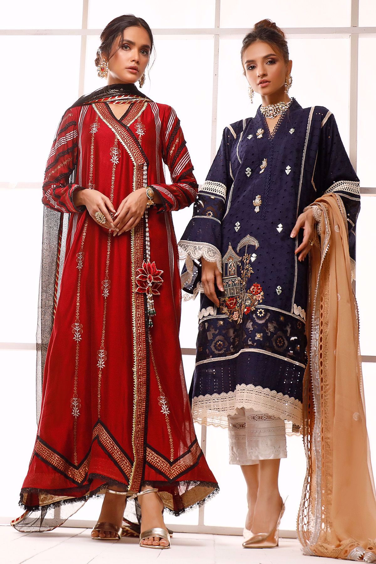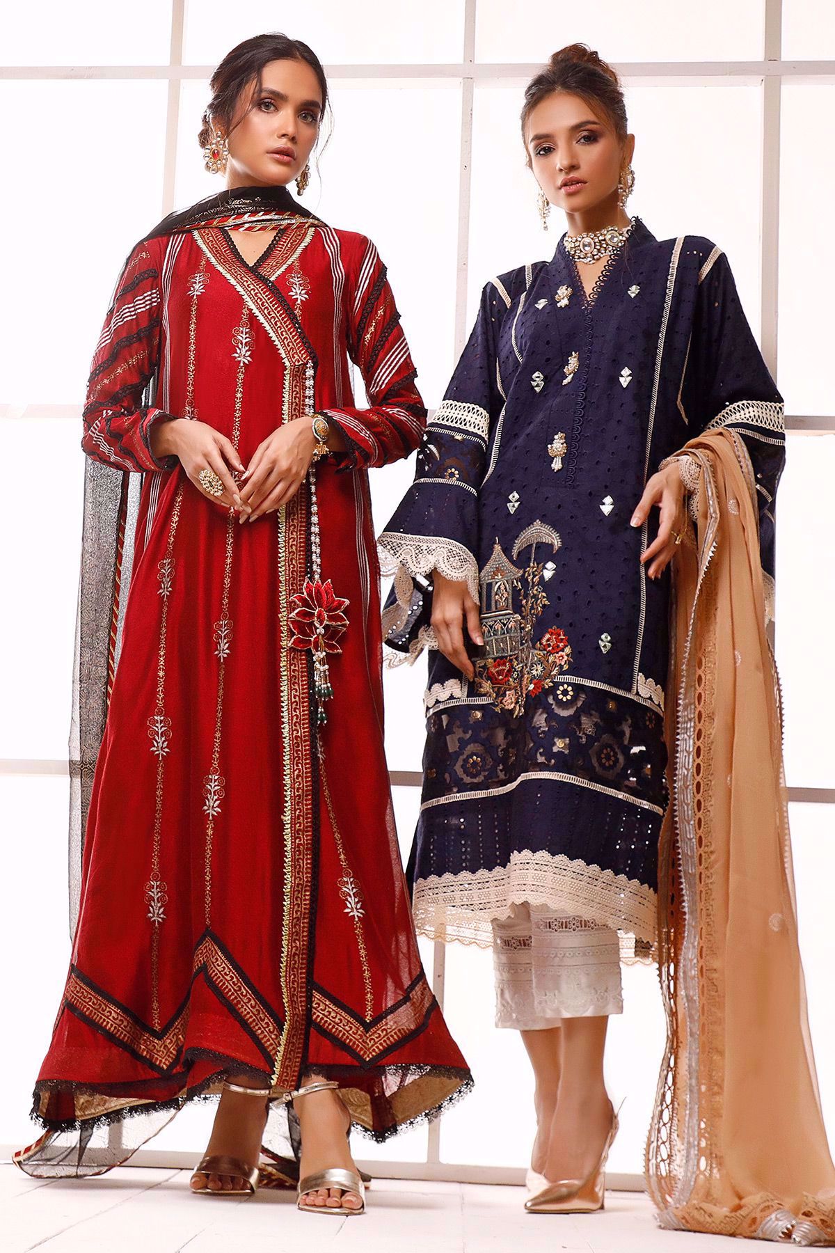 Long silhouette pure cotton net angharka with hand block printed details incorporated with lace finishings. The angharka comes with a handcrafted lotus tassel with dangling pearls and emeralds.