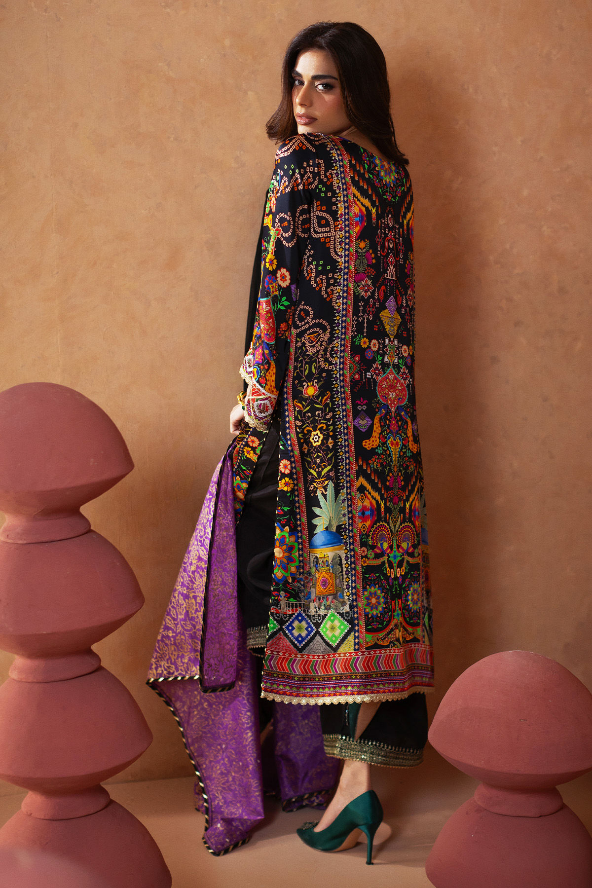 A-Line shirt presented in a myriad of eye-catching colors, showcasing intricate zardozi embellishments on the neckline. The hem of the shirt is accentuated with gota detailing. This ensemble is complemented by an ombré silk dupatta in black and deep lilac, adorned with hand block-printed gold accents, and is accompanied by a matching izaar featuring aari embroidery along the hemline.