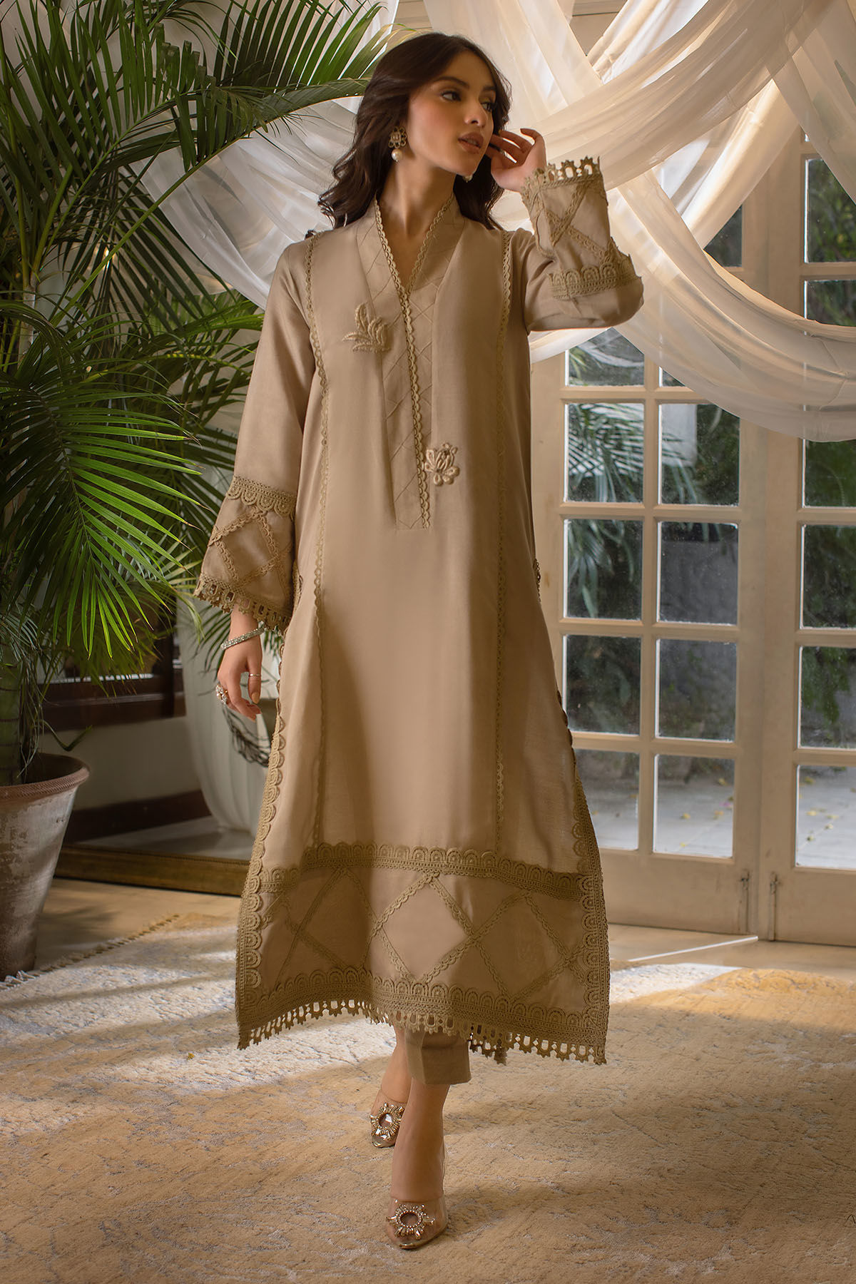 Long silhouette cotton net shirt in an earthy tone of sand featuring pin-tucks and crochet lace details on the neckline. The neckline is further enhanced with silk thread embroidered rosettes. The hem is enhanced with crochet laces in geometrical pattern. The shirt is paired with straight matching pants.