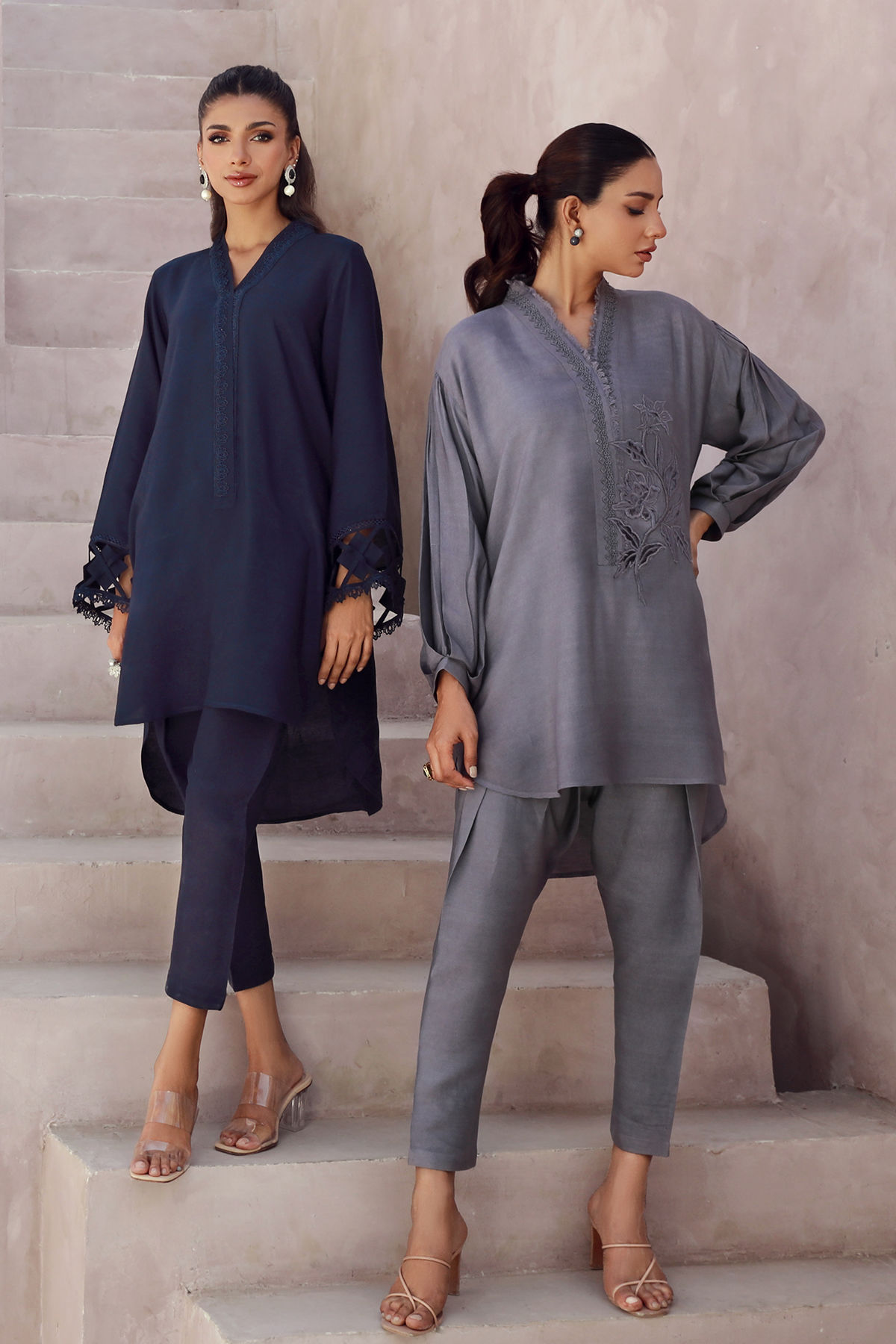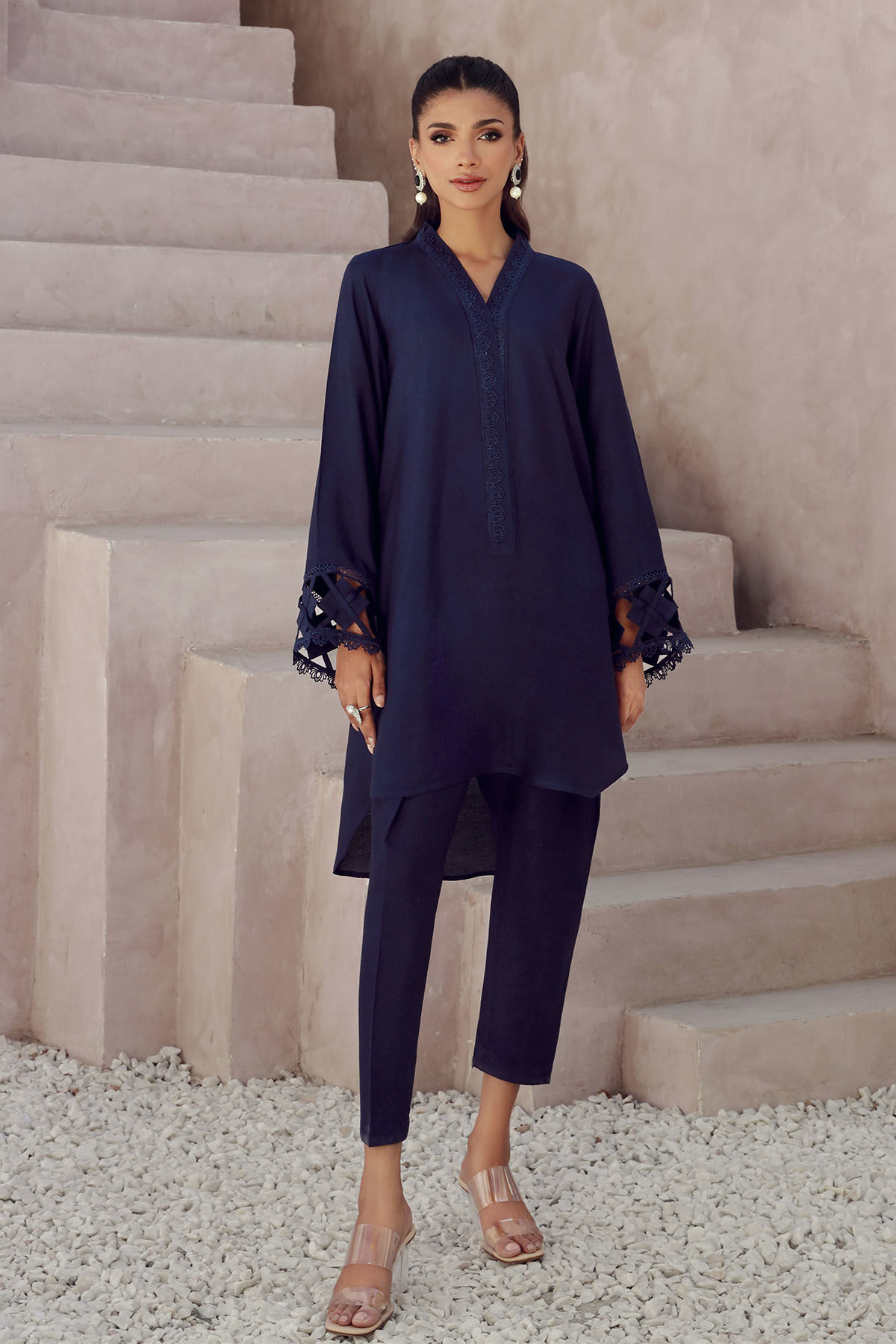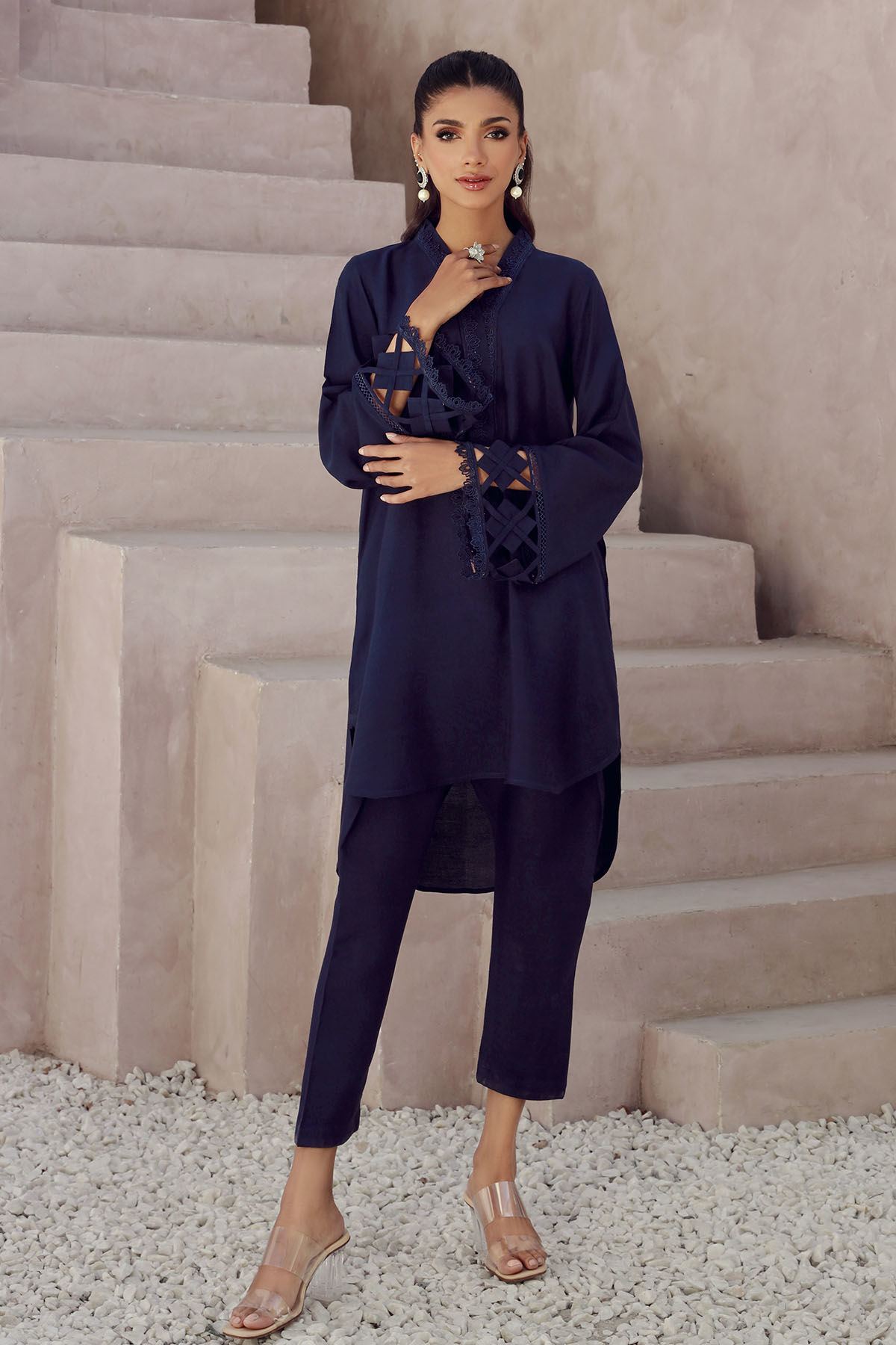 High low silhouette co-ord set in deep blue featuring fabric manipulation details on sleeves. The neckline is adorned with lace details and the side seam is featuring pocket details. The co-ord is paired with shalwar for a sleeker look.