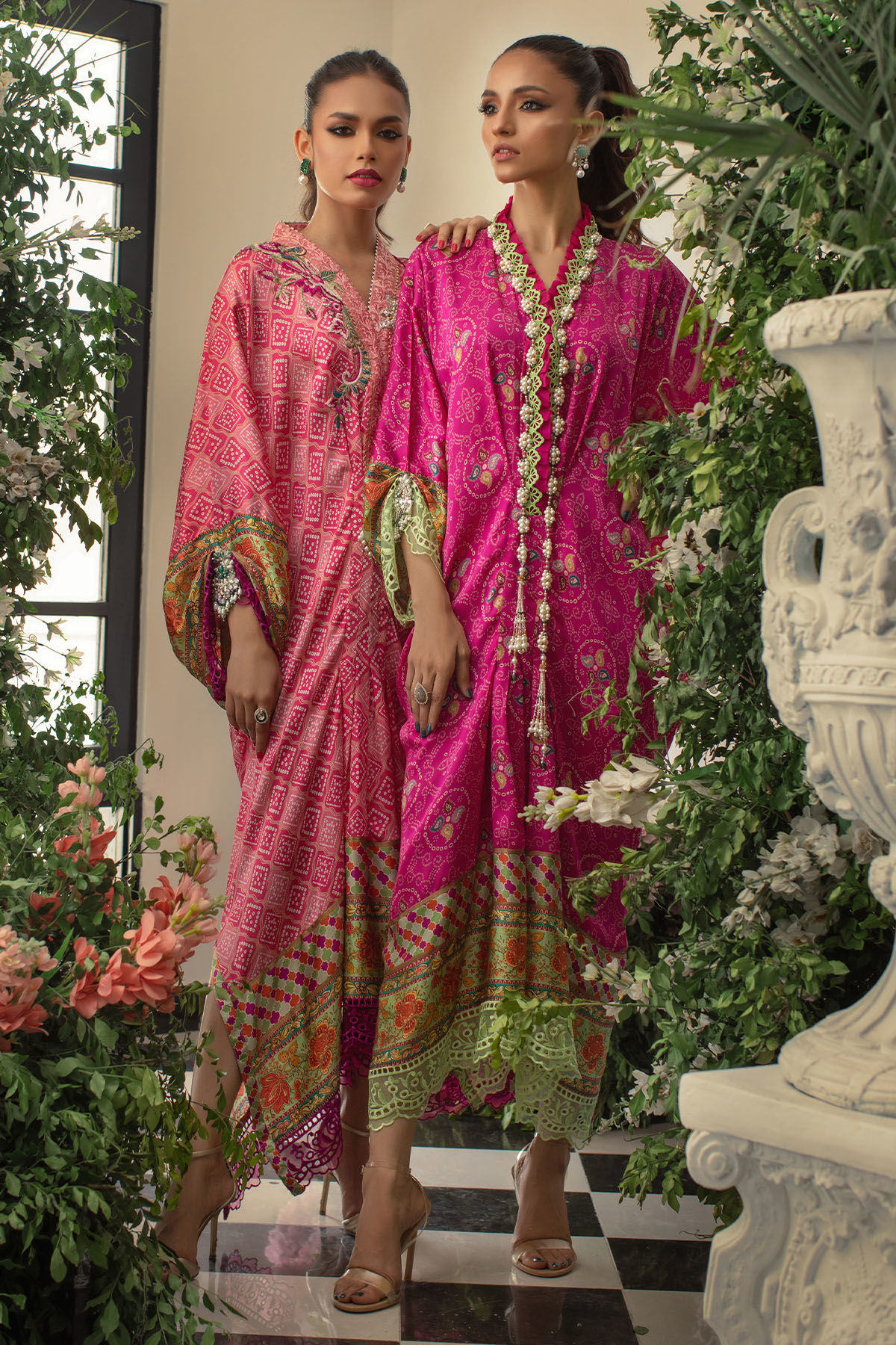 Long silhouette kaftan in gorgeous magenta shade featuring pearl embellished necklace on the neckline. The sleeves are adorned with zardozi and light catching dangling crystals. The hem is adorned with schiffli details.