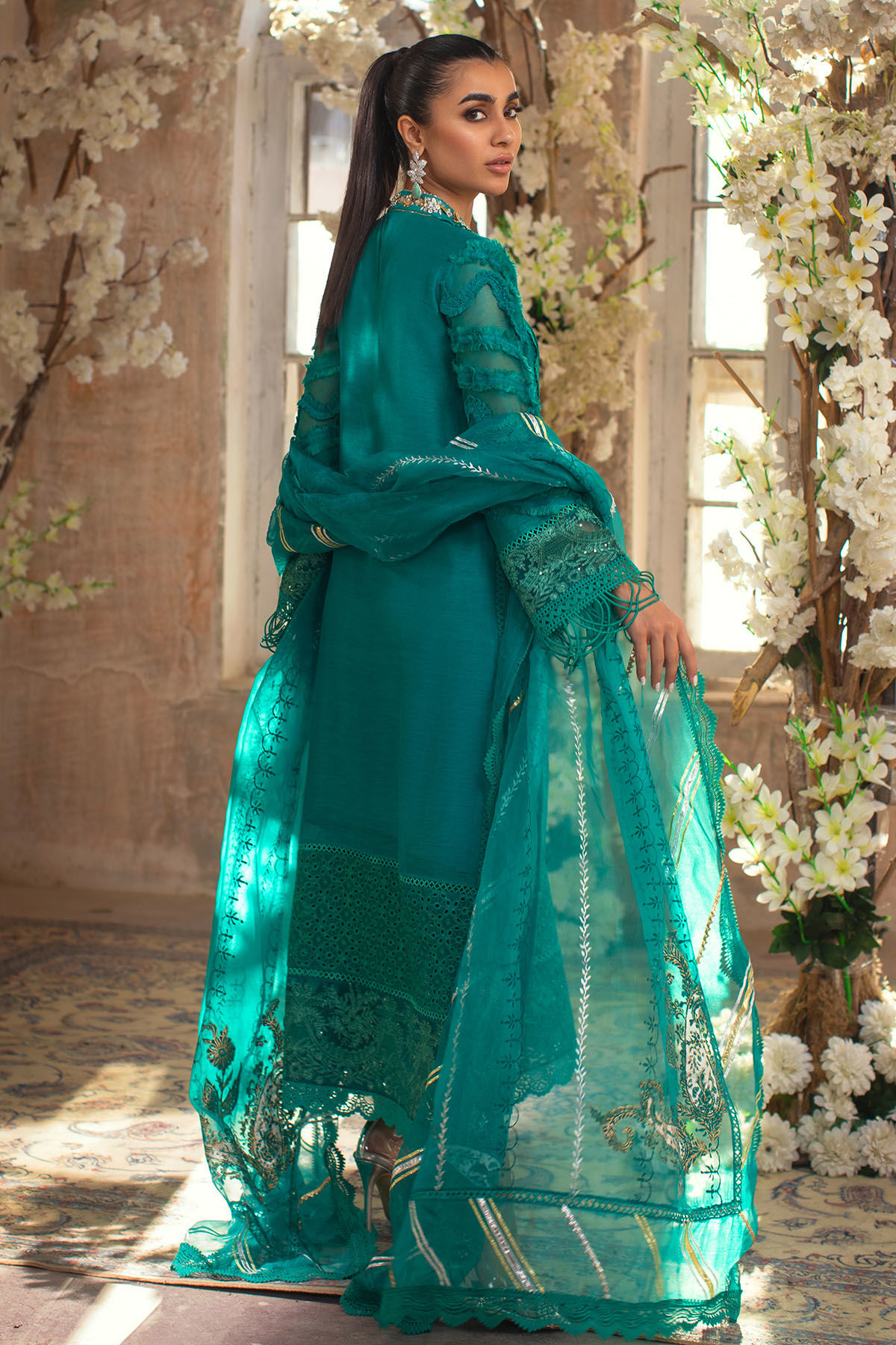 Long silhouette shirt on pure cotton net canvas in gorgeous shade of jade red featuring zardozi neckline, the neckline is further adorned with handcrafted embellishments and pearls finishing. The hemline is adorned with schiffli panel along with embroidered organza panels. The sleeves are made to perfection with fabric manipulation details. The outfit can be paired with pure organza dupatta featuring block printed details which are enhanced with gota details on all sides. The outfit can be paired with straight raw silk matching pants.
