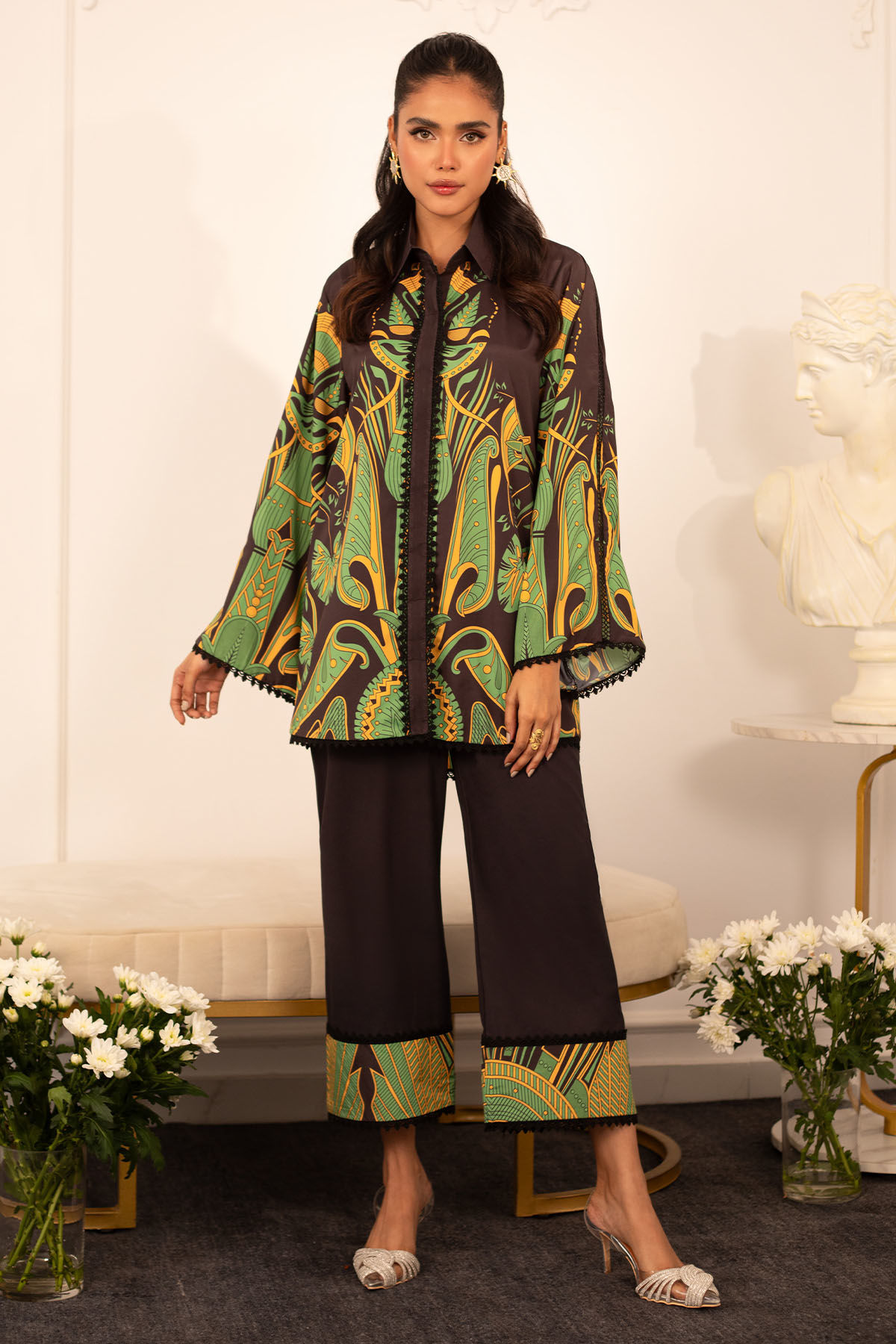 Quirky, trendy yet elegant co-ord set on crepe silk featuring balanced and carefully crafted prints, enhanced with lace details, is a must-have in your closet this summer.