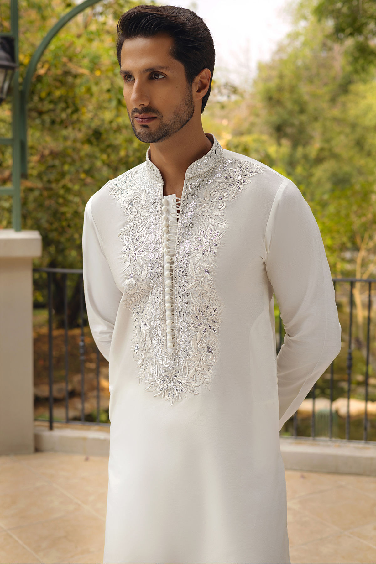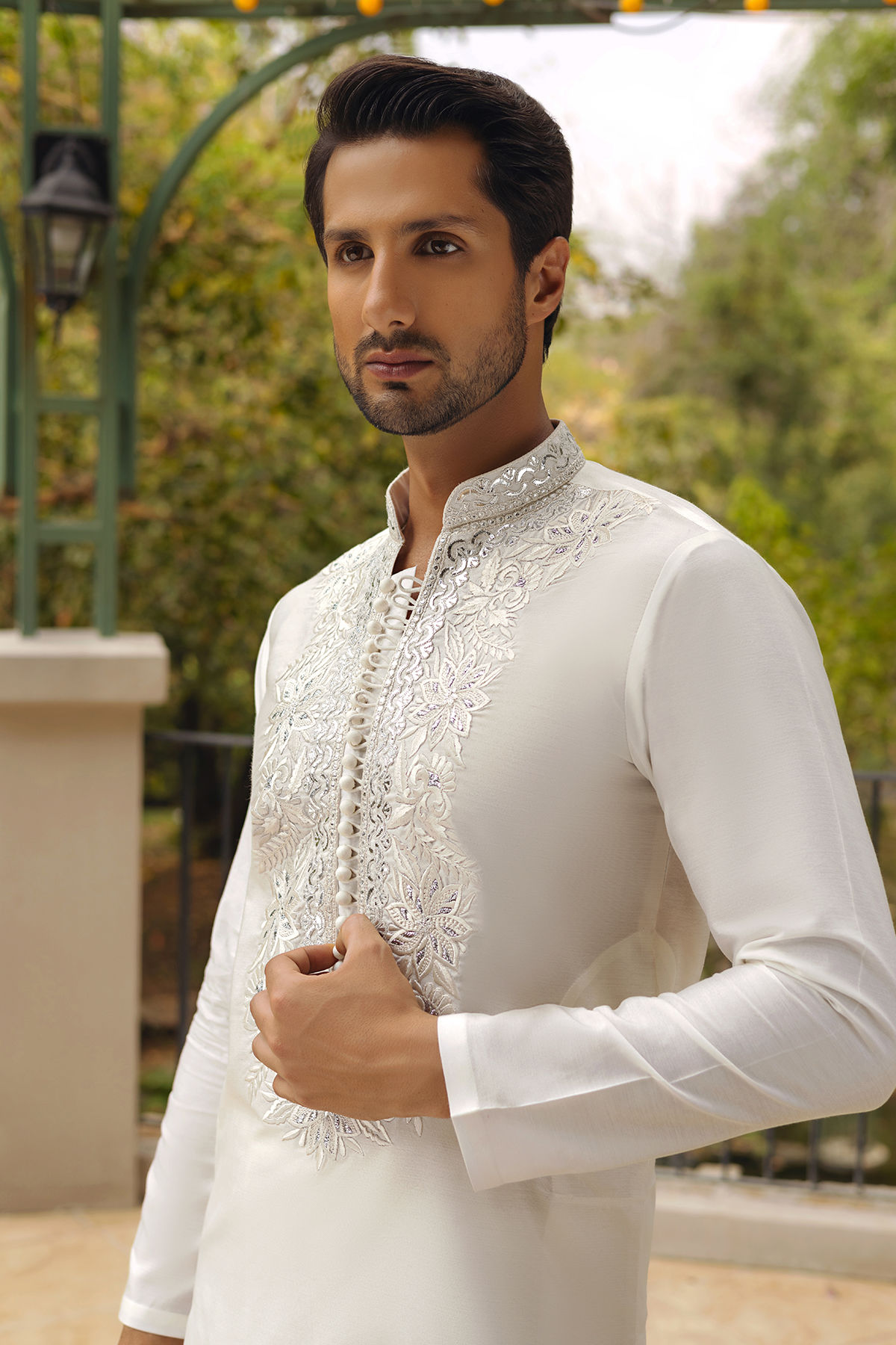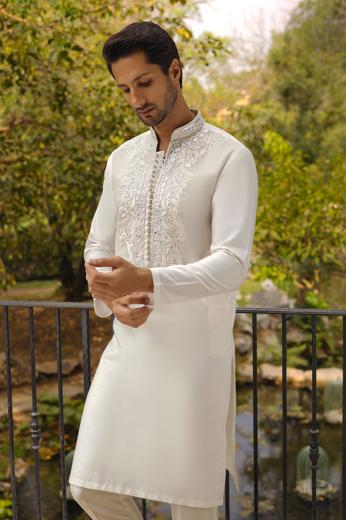 Embodying the essence of less is more, Waez is a vision to be hold meticulously cut on pure cotton canvas. The neckline is graced with opulent silk thread rosettes featuring lustrous silver details of Mukesh. The kurta is accompanied by straight cotton pants.