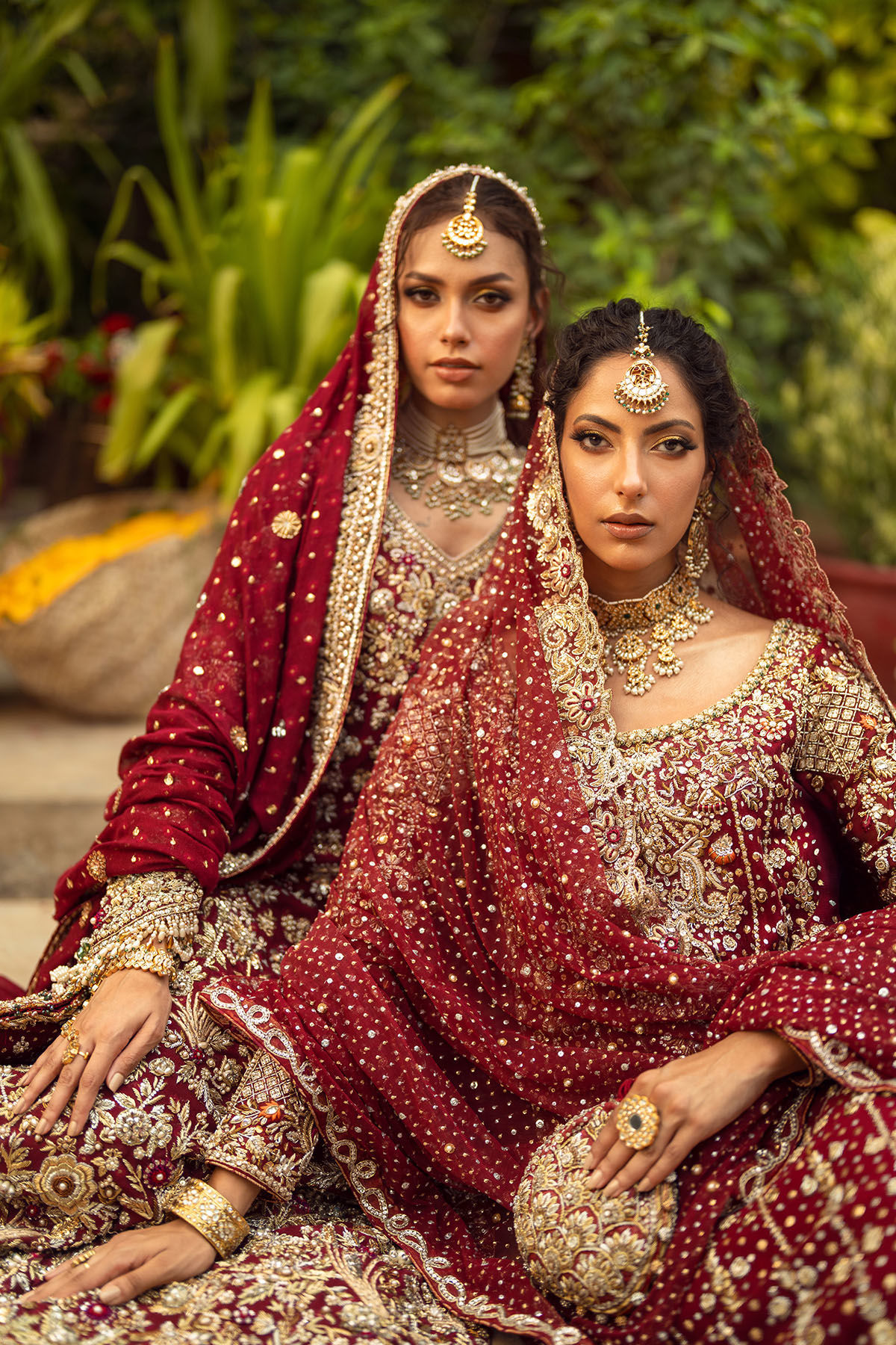 Presenting a long silhouette shirt on a pure silk net canvas in a stunning shade of deep crimson, adorned with old school zardozi detailing in antique gold and silver. The zardozi details are enhanced with resham details in striking magenta and purples. The outfit is complemented by a striking four-yard dupatta featuring zardozi borders and can be paired with pure jamawar sharara featuring intricate zardozi borders on hem.