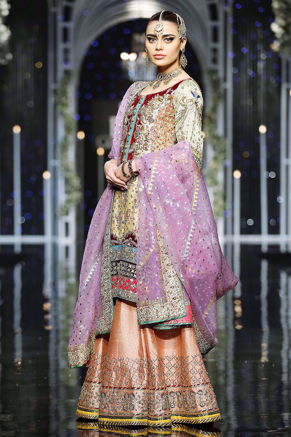 Ochre Yellow A-line shirt with deep pink side panels of hand block printed techniques. The shirt has velvet appliqué on the neckline which is enhanced with old school hand embroidered details. The hemline of the shirt has multicolored appliqué with different hand embroidered techniques on each panel. Shimmery peach hand block printed dhaka pajama with gota details completes the look. Lilac hand block printed dupatta with dabka zari and gota details makes this outfit head turning.