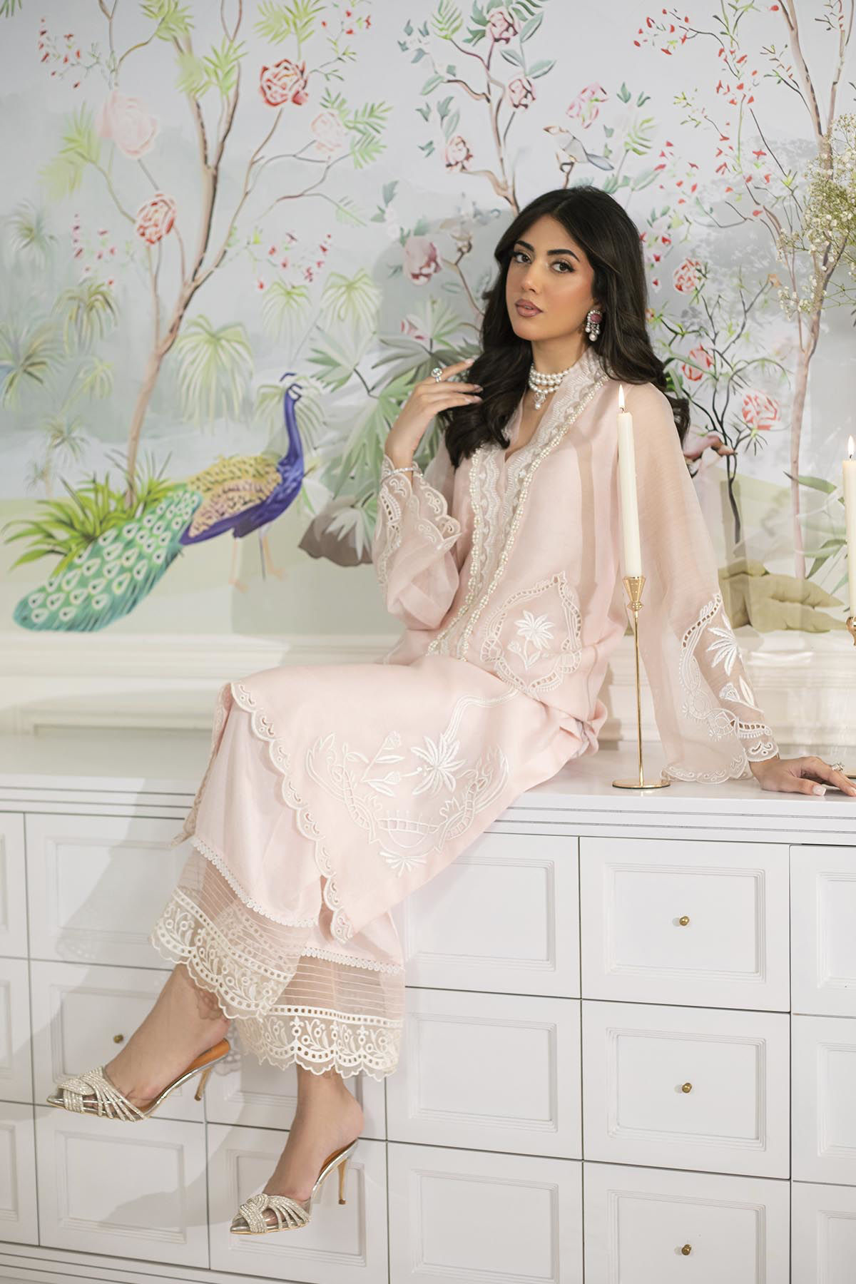 The elongated silhouette shirt, crafted from ethereal pink striped organza fabric, is elegantly embellished with intricate silk thread resham embroidery. The hemline is further enhanced with exquisite cutwork detailing, while the neckline is tastefully adorned with pearls and light-reflecting crystal tassels. This refined shirt may be paired with a chiffon dupatta embellished with laces and embossed organza accents.