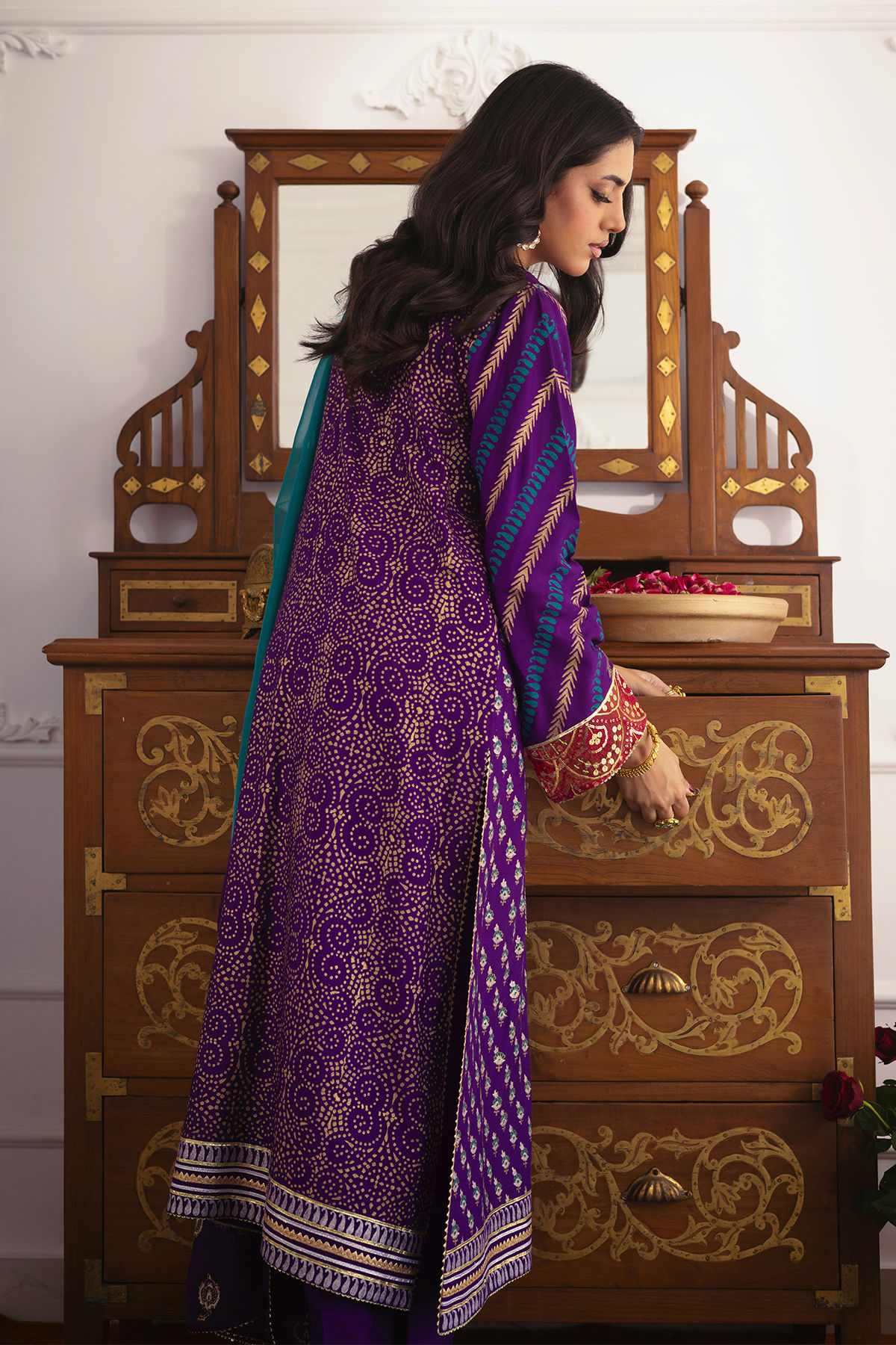 A long silhouette shirt showcasing striking hand block printed details in shades of emerald, silver, and gold. The neckline is elegantly adorned with handcrafted embellishments. The center front is exquisitely crafted from lustrous lorex fabric. This ensemble is accompanied by straight matching pants and a complimentary ombré dupatta in sea green and aubergine, finished with delicate gota work.