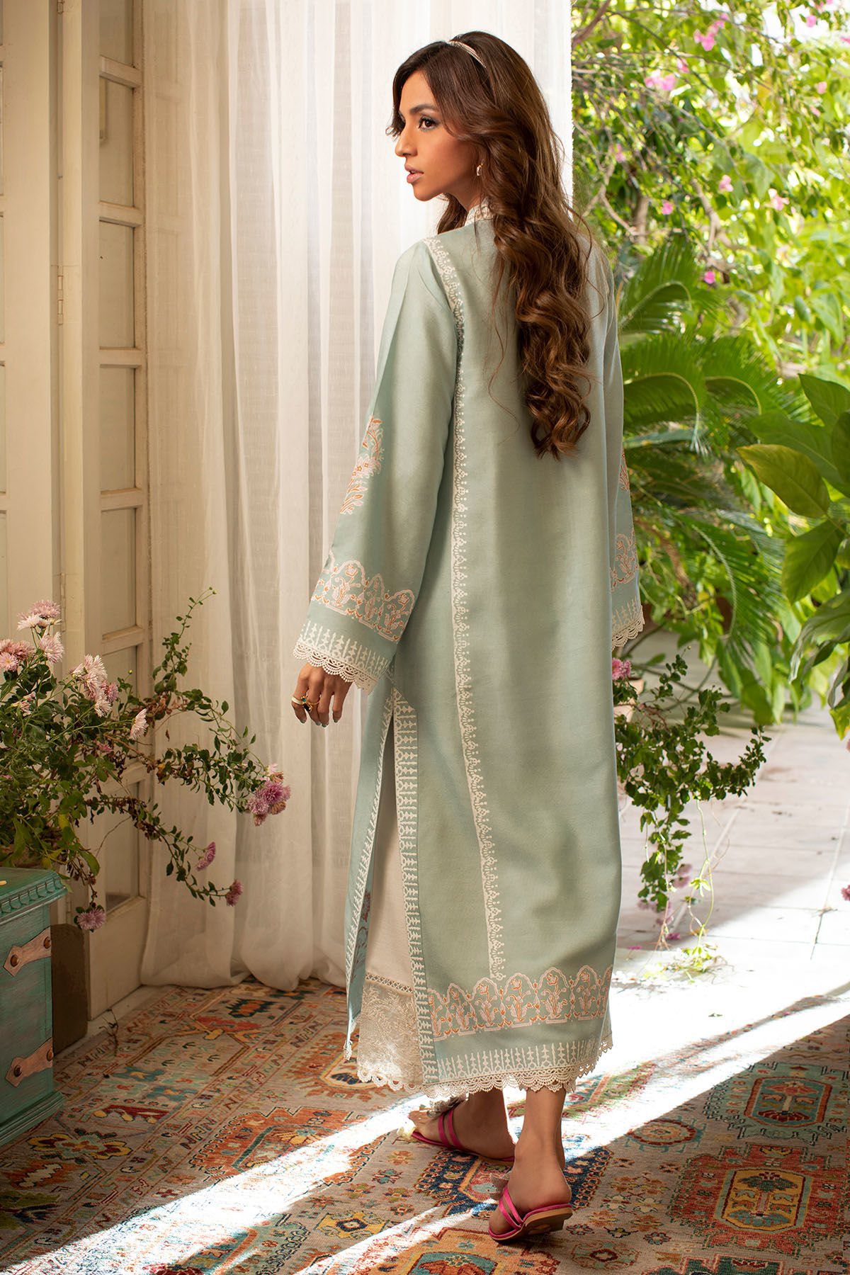 The shirt can be paired with Azeela izaar featuring pure embossed organza on hem finished with scalloped crochet details.