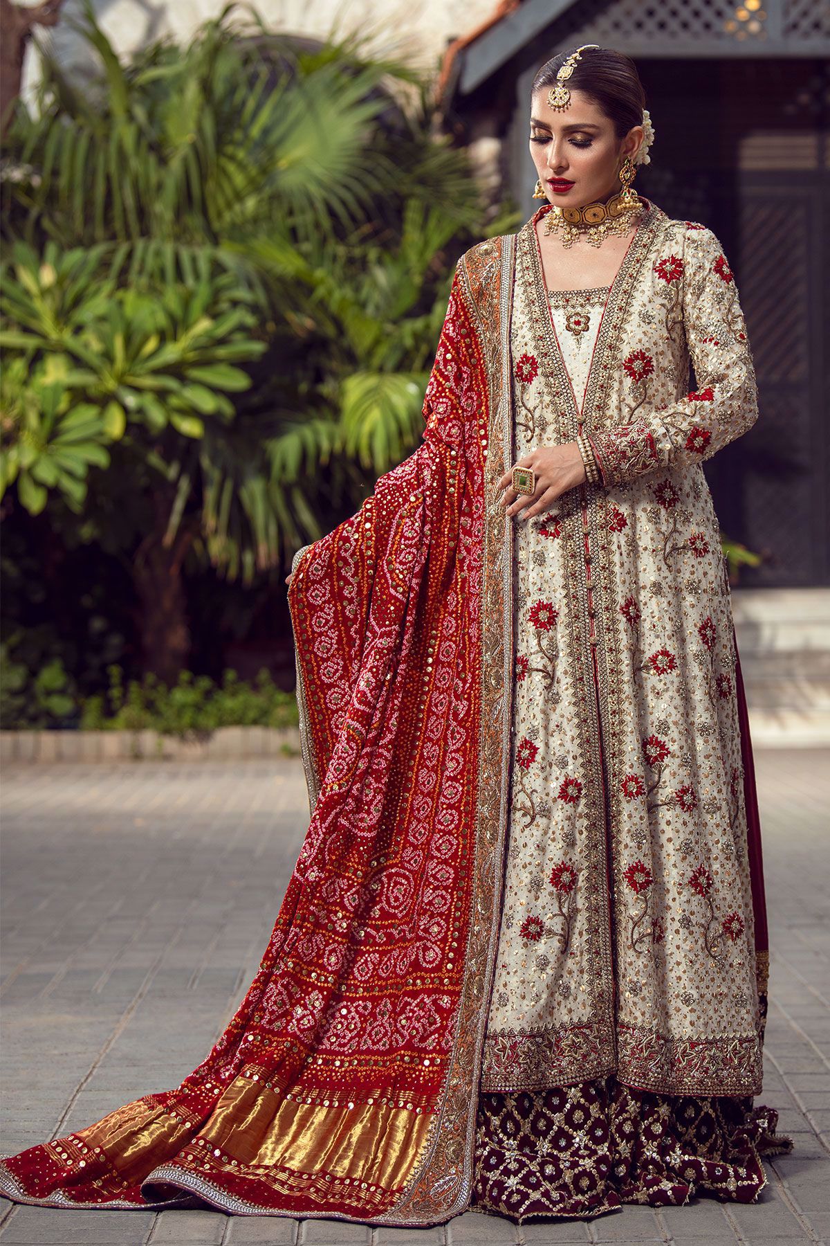 An ivory front open A-line shirt with romantic old school details of antique dabka incorporated with majestic silk thread embroidered details, the shirt is adorned with stunning kaamdani details and the hemline is exquisitely handcrafted with maroon appliqué details. The shirt is layered over a deep maroon velvet dhaka pajama. The ensemble is paired with scarlet chunri dupatta with kaamdani details and heavily embroidered borders.