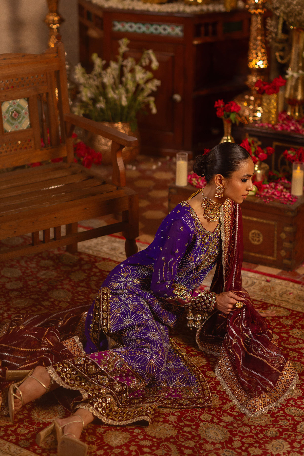 The A-Line shirt, crafted in the deepest shade of aubergine, showcases a celestial arrangement of light-catching crystals in hues of gold and sparkling silver. The neckline is meticulously designed with appliqué details and antique zardozi embellishments. The hemline features multiple layers of jamawar and velvet appliqué, further enhanced with traditional zardozi and gota accents. The sleeves are elegantly adorned with handcrafted jhumka tassels. This exquisite outfit is complemented by contrasting dhaka pants, which are embellished with velvet appliqué and gota details. Additionally, it can be paired with a deep crimson hand-block-printed organza dupatta that features light-catching sequins.