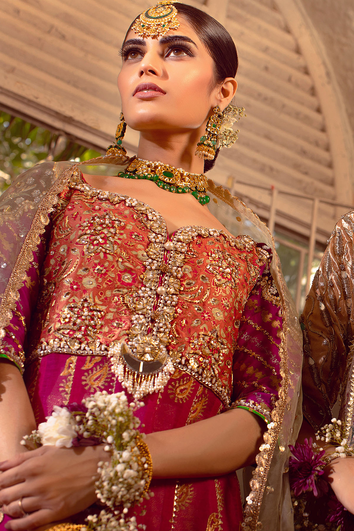 Flared silhouette hand block printed color blocked pishwas in burnt orange, magenta and fuchsia pink. The neckline of the pishwas is adorned with zardozi embroidery on velvet appliqué. The three quarter magenta sleeves are hand block printed and are further enhanced with dabka and silk thread embroidery details. The back of the shirt has handcrafted gota tassels. The pishwas is layered over gold straight pants and paired with dhani green dupatta with sequins and lace finishing’s.