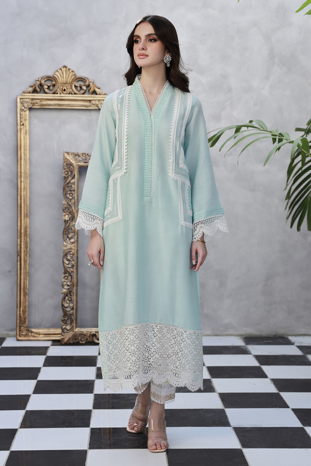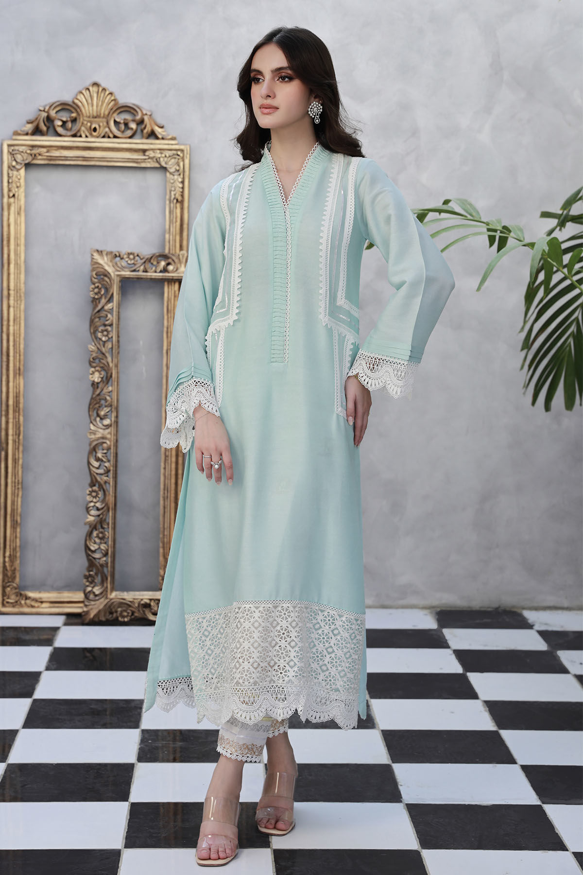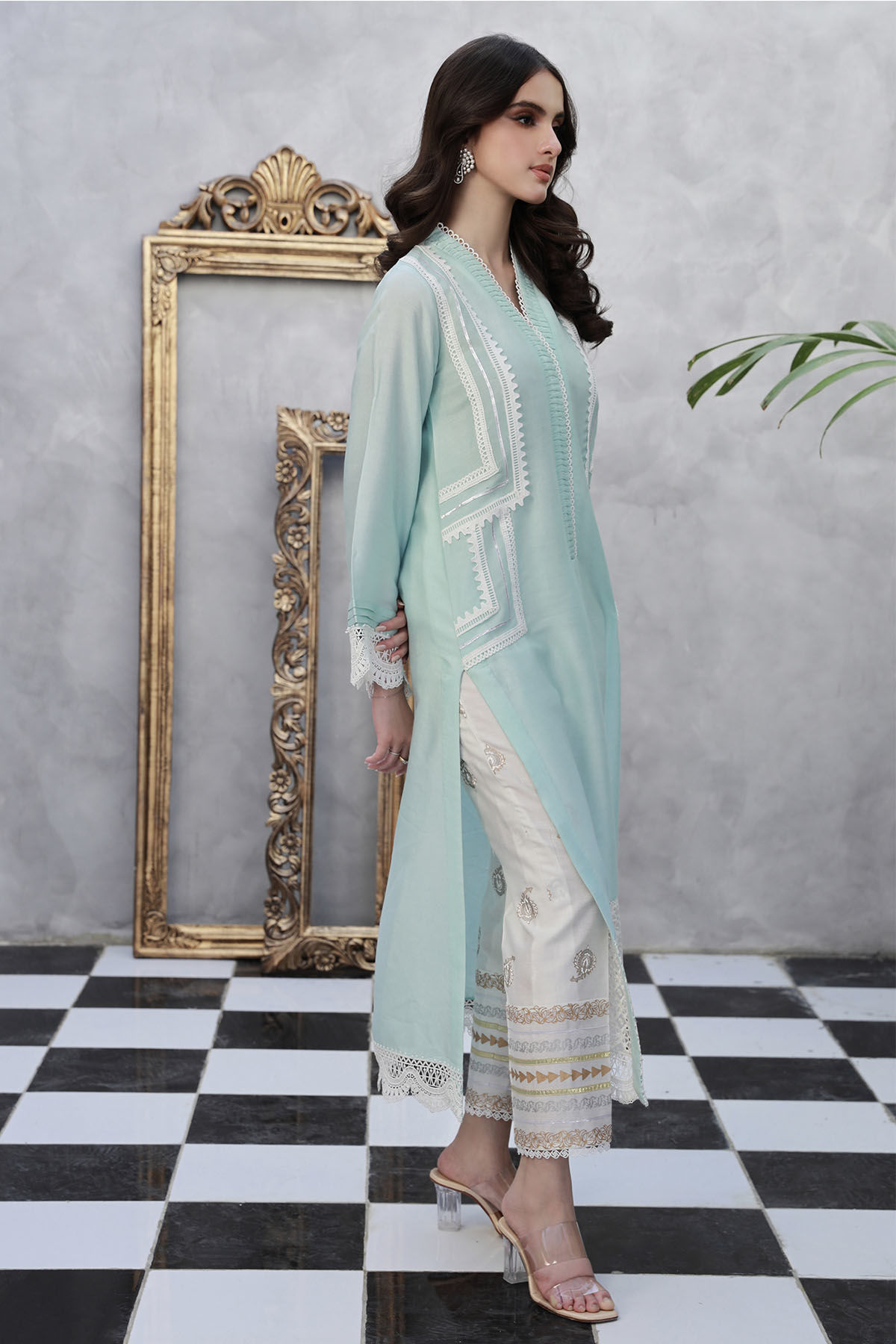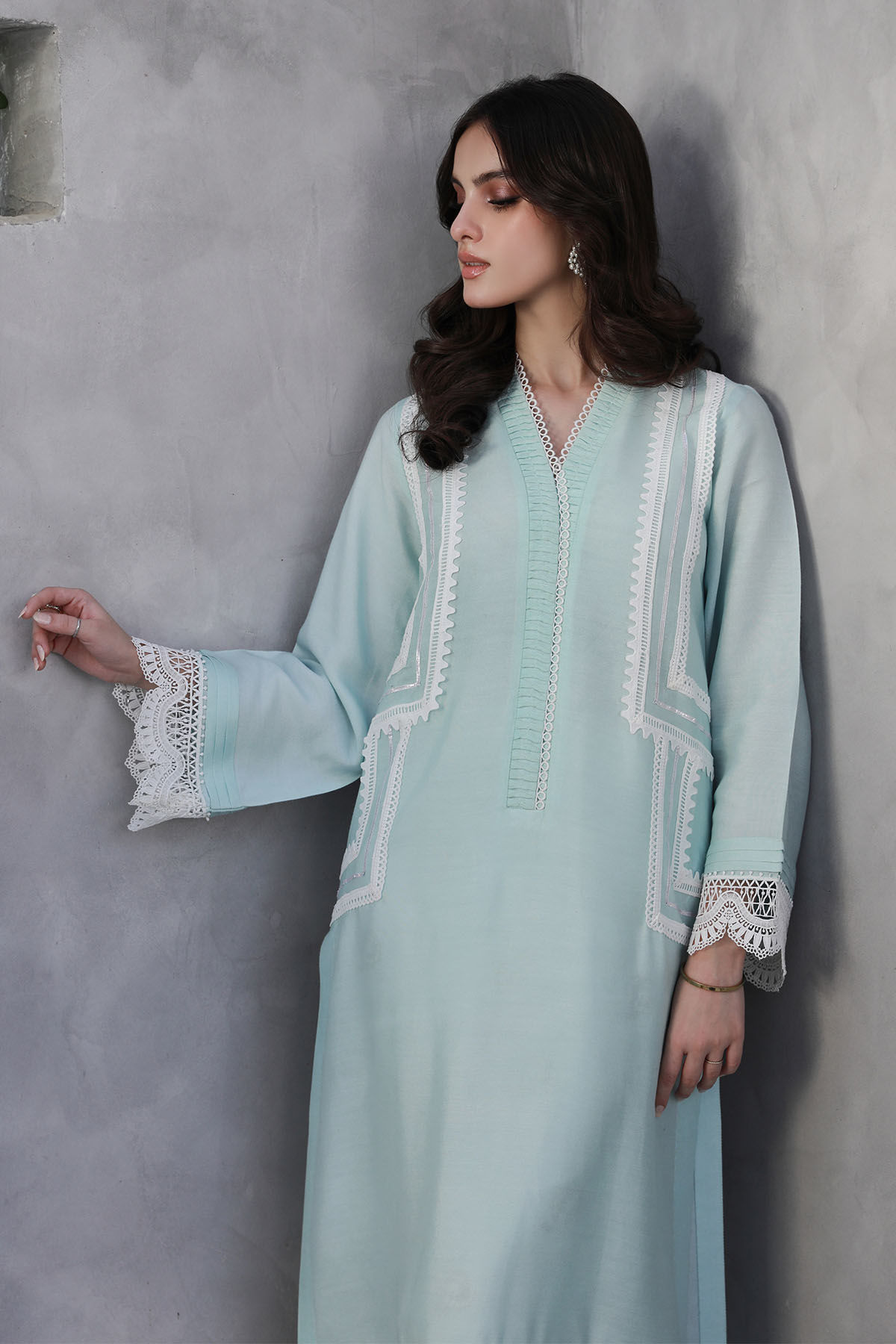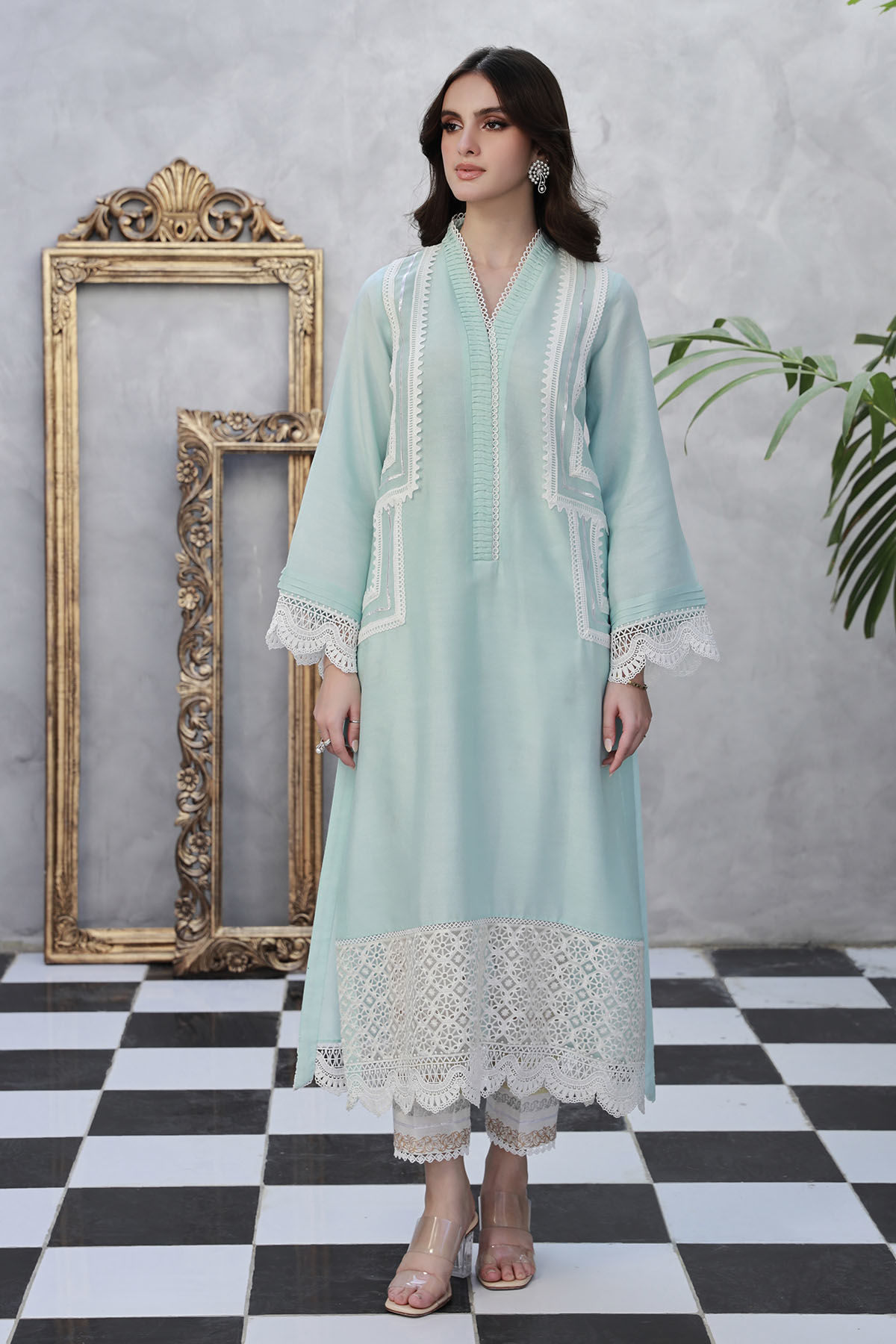 Long silhouette cotton net shirt in hazy blue featuring crochet lace and gota details on center front. The hem is adorned with schiffli details and the pants can be paired with straight block printed pants featuring gota and crochet lace.
