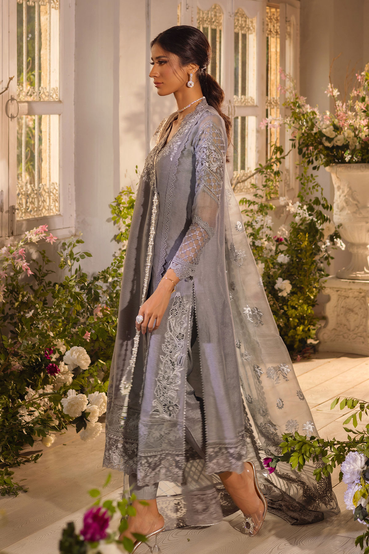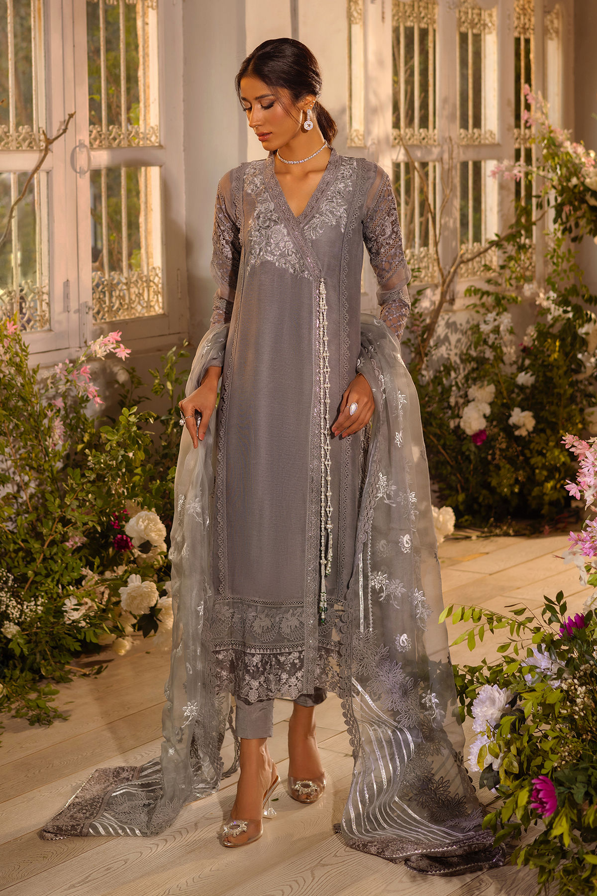 A- line front open angharka on pure silk net featuring subtle details of silk thread florals which are enhanced with mukesh detail. The side slits are carefully crafted with velvet appliqué. The center front is adorned with handcrafted mirror tassels. The angharka can be paired with pure organza hand block printed dupatta featuring crochet laces and gota details. Pair it with straight raw silk pants for a complete look.
